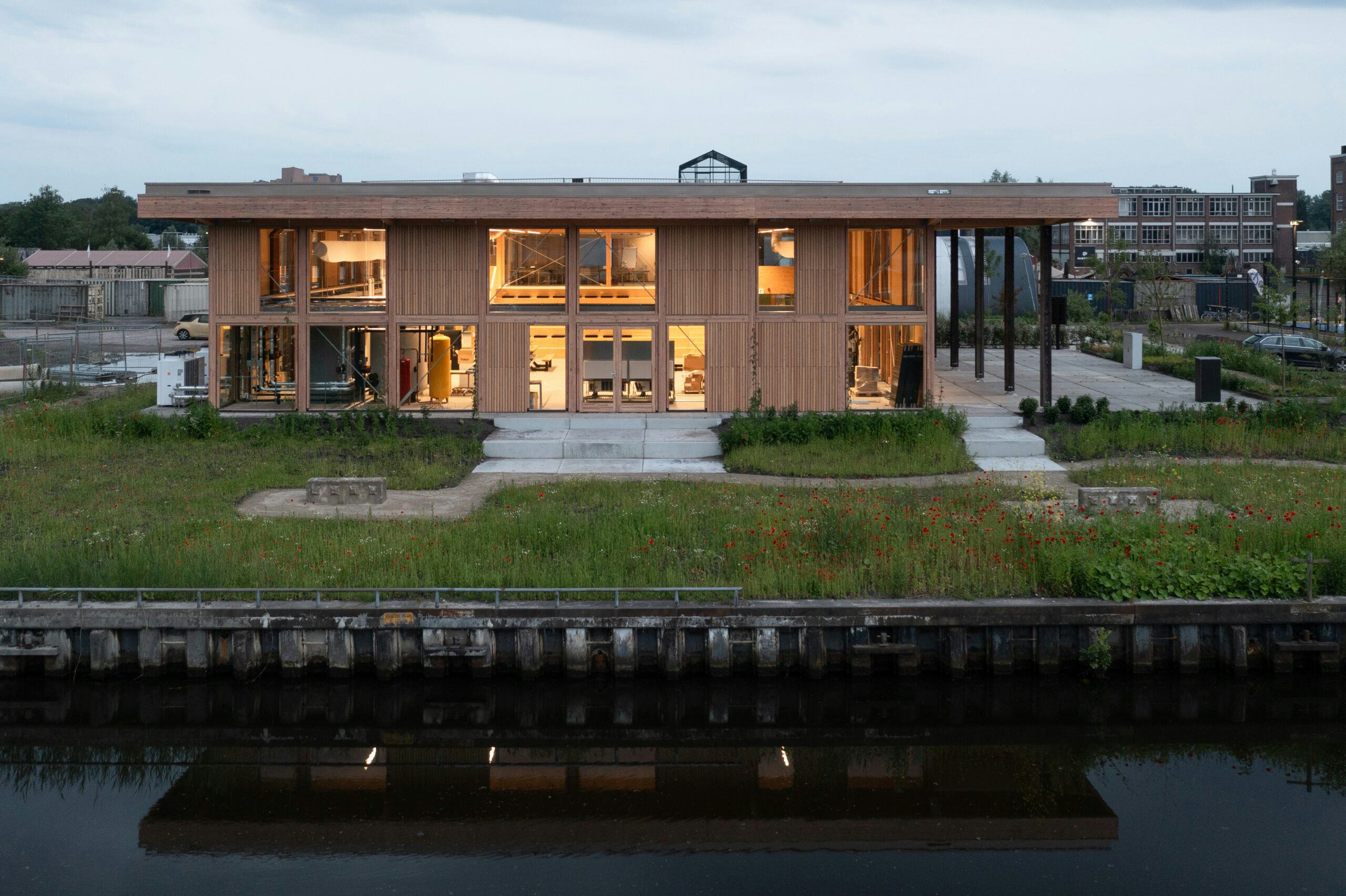 Met een circulaire ontwerpmethodiek is een BCI score 74% gerealiseerd. Het paviljoen is grotendeels opgetrokken uit van te voren geoogste materialen. Nieuwe materialen zijn lokaal, biobased en demontabel. De fundering bestaat uit stelconplaten uit de oude Afsluitdijk, het flexibele casco is van hout, de buitenkolommen zijn hergebruikte balken en de gevel en dakelementen zijn gevuld met vlas. Op die manier is het gebouw, met materialen uit het verleden, het bouwpakket van een duurzame toekomst!