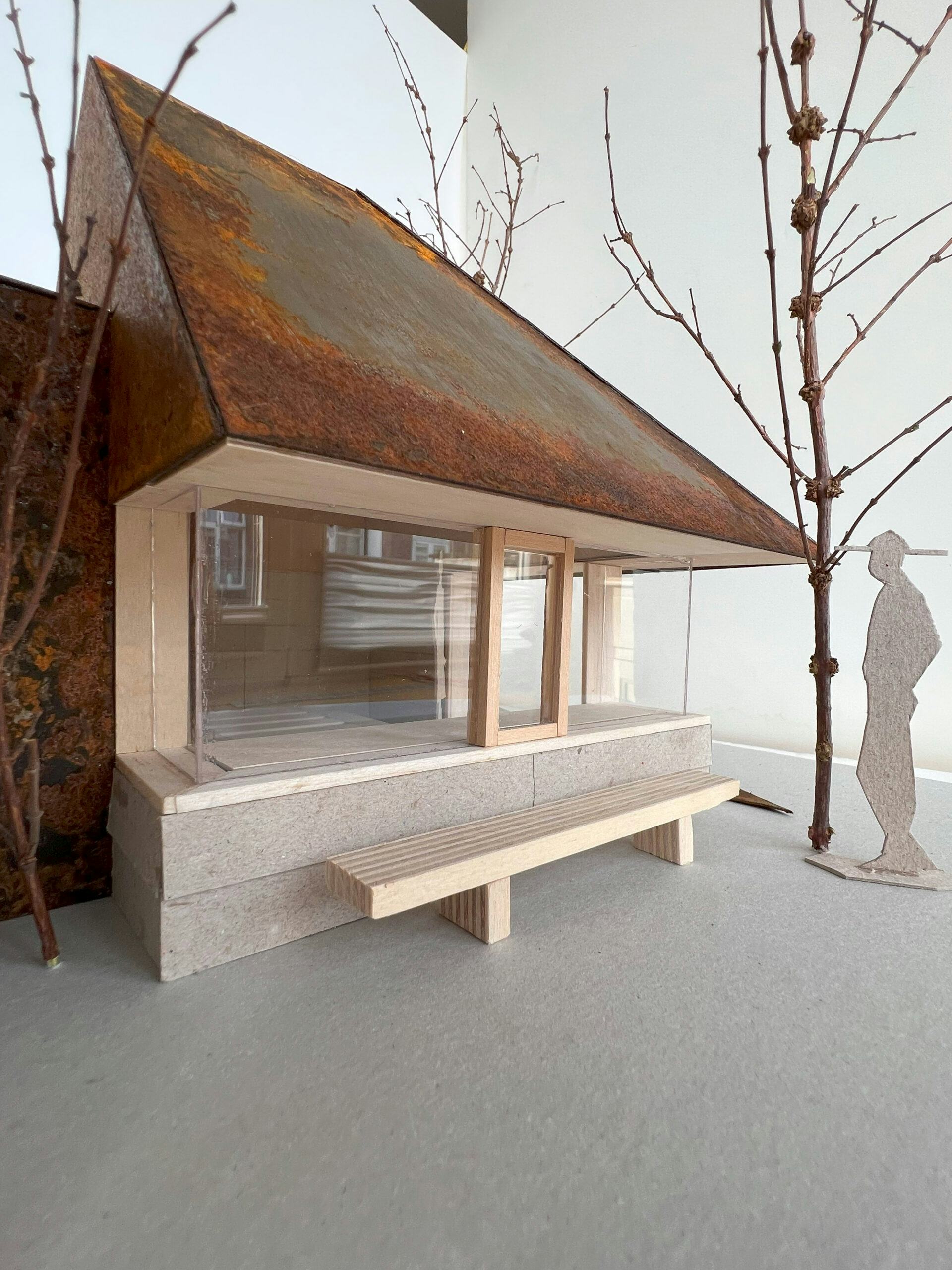De aanbouw is vervaardigd uit houtskeletbouw voorzien van Isovlas isolatie. Een klein staal portaaltje zorgt voor de 2 open glazen hoeken. De binnenzijde is aan de bovenzijde afgewerkt met berken multiplex en de onderzijde met Viroc verzelcementplaten. Deze platen zijn ook aan de buitenzijde aan de onderzijde gebruikt. De dakbedekking bestaat uit cortenstalen golfplaten.