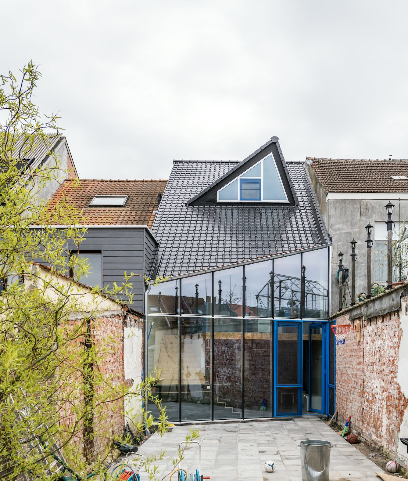 Waar de voorgevel anoniem opgaat in het straatbeeld, weerspiegelt de achtergevel de identiteit van de bewoners. De woning ontplooit zich tot een compact, doch ruimtelijk huis. Binnen de vraag naar stedelijke verdichting is dit een herkenbaar project waarbij de typologie van een rijhuis een andere oriëntatie krijgt. Kiezen voor een volledig glazen achtergevel binnen een gesloten bouwblok, betekent niet dat het private karakter hieronder hoeft te lijden. Het scala aan gebruikte materialen is bewus