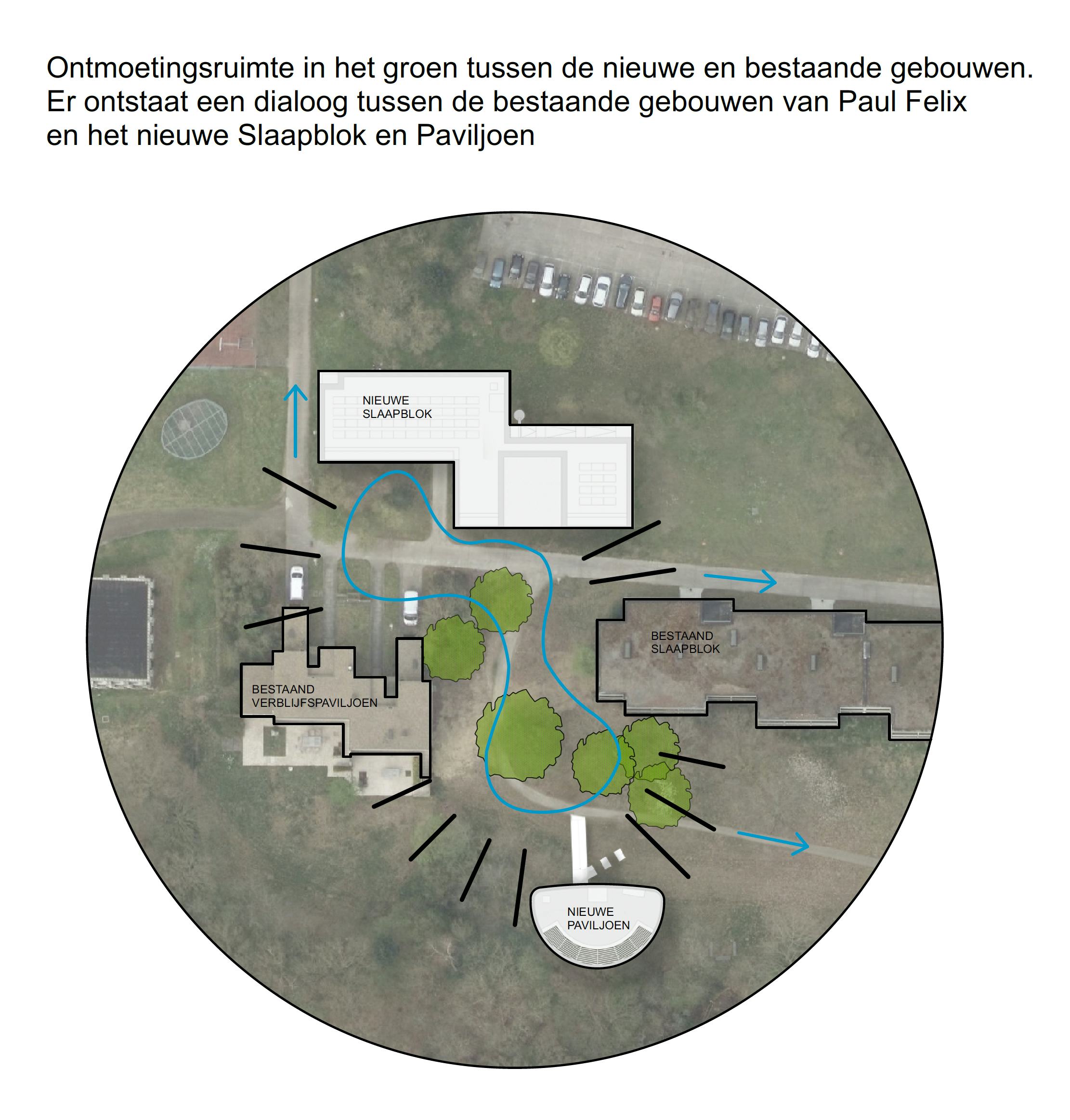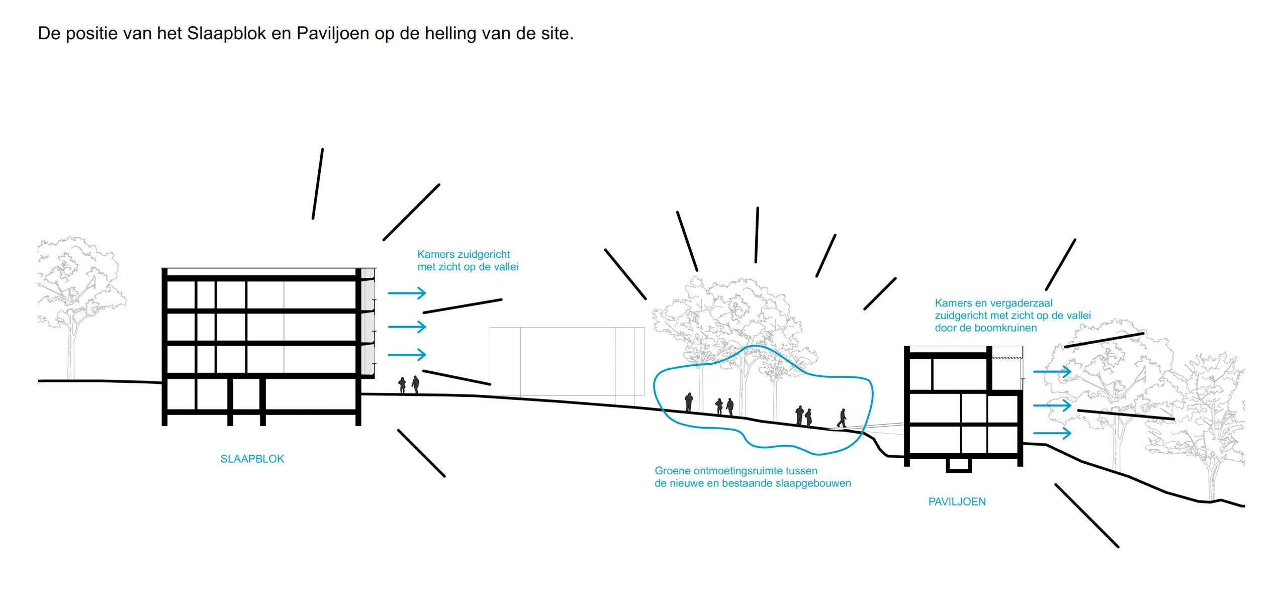 Het ontwerp voor het verblijfspaviljoen dat voortkomt uit het masterplan voor de hele site, is samen ontworpen met een nieuw slaapblok, maar dat eerder is afgewerkt. Beide gebouwen staan los van elkaar, maar zijn wel samen ontworpen. Hoewel de materialiteit en concepten terugkomen in beide gebouwen, heeft het paviljoen zijn eigen specificiteit dankzij de unieke ligging aan de helling van het terrein, de vorm en programma met kamers én vergaderzaal met panoramisch terras.