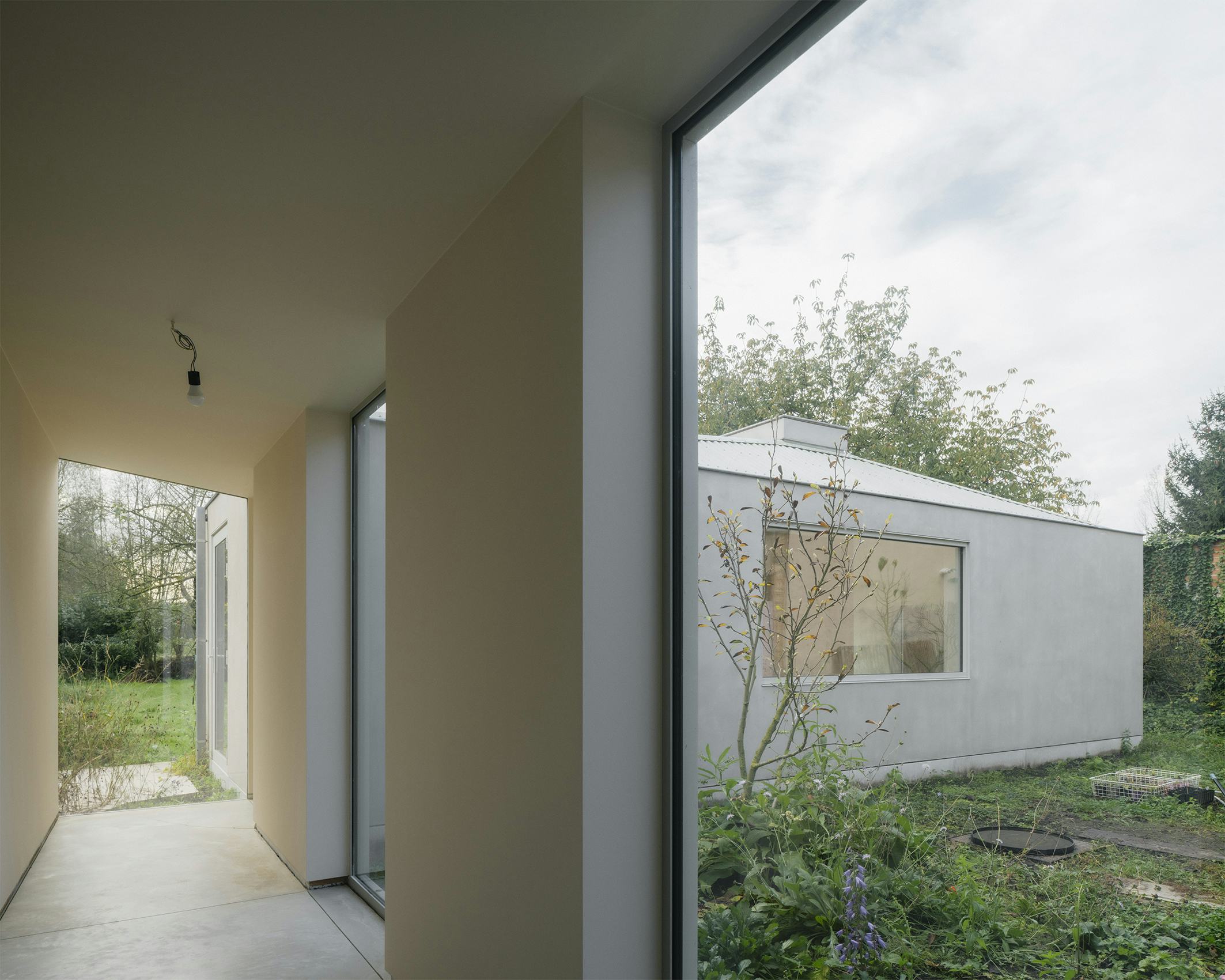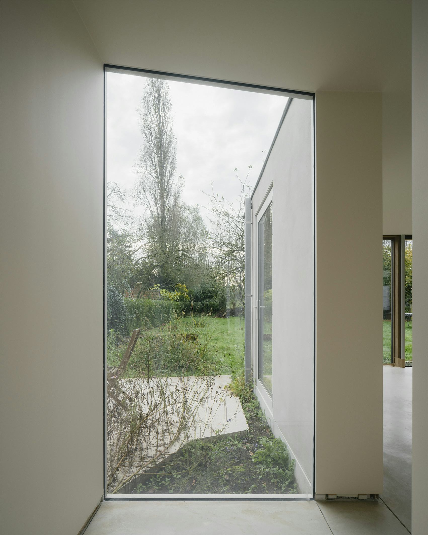 NWLND besloot dat de leefruimtes zich best zo dicht mogelijk bij de tuin zouden bevinden. De bestaande woning werd getransformeerd tot een volume met slaapkamers, een bureau en de inkom? De achterbouw werd gesaneerd tot een schakelvolume met badkamer en masterbedroom. Het derde volume is nieuw en bevindt zich diep op de site. Het bevat de leefruimtes. Er ontstaat een beschutte tuin omsloten door de bestaande volumes en de nieuwbouw. De nieuwbouw richt zich achteraan op een open, wilde tuin.