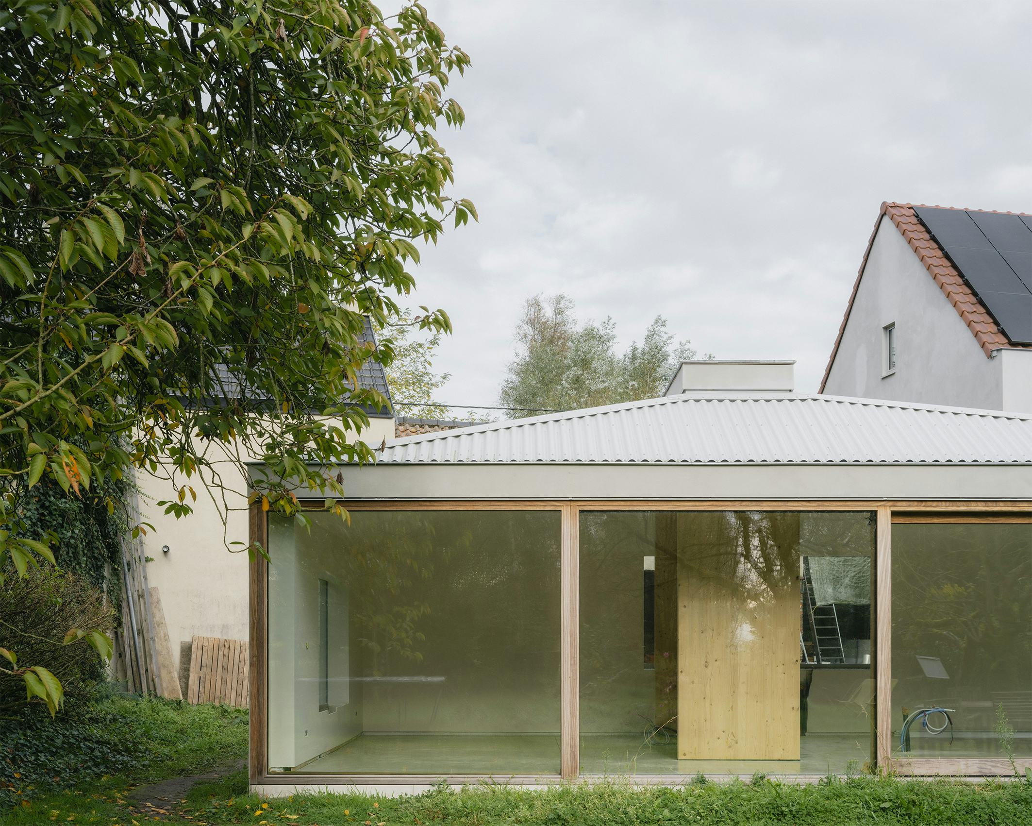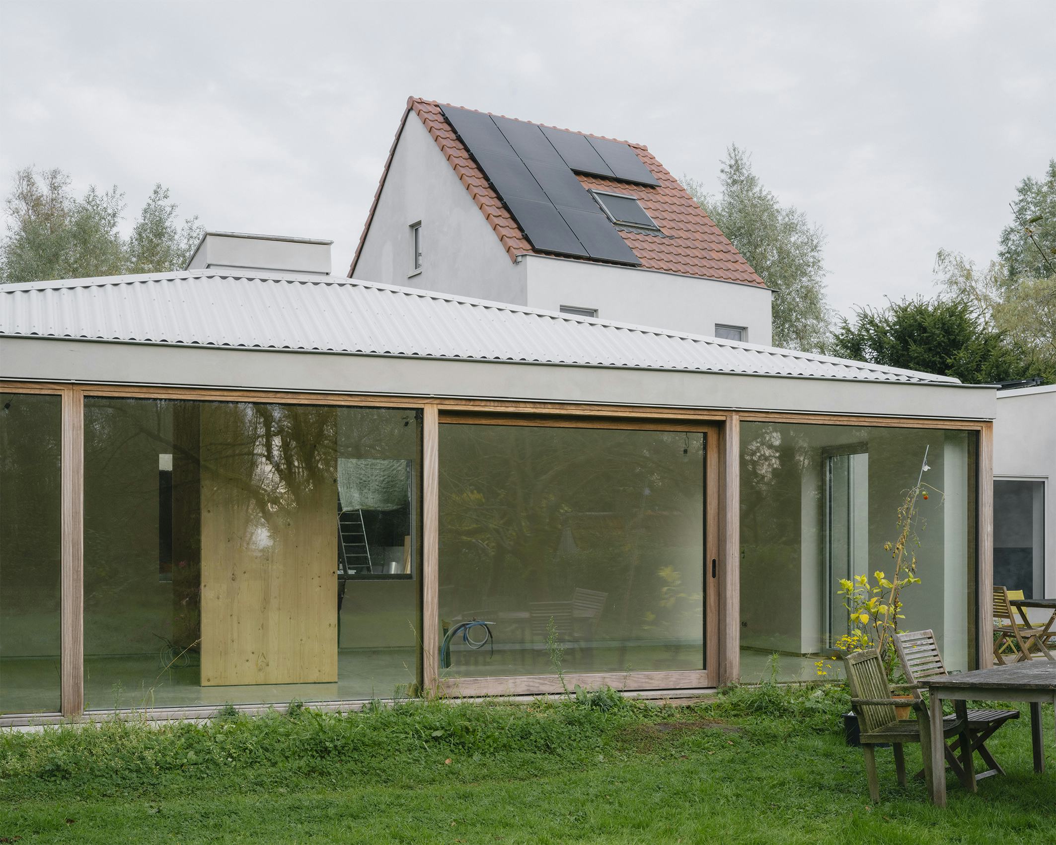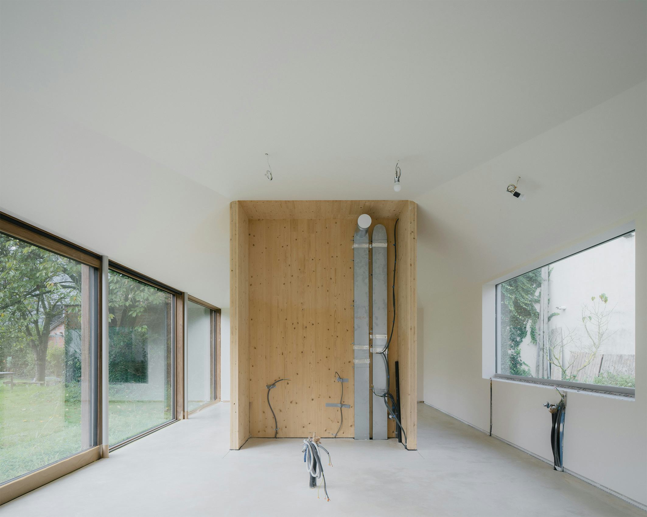 Deze bio-ecologische uitbreiding in houtskeletbouw werd in nauwe samenwerking met de aannemer Lab15 uitgewerkt. Op basis van een BIM-model werd de volumetrie geoptimaliseerd en het materiaalgebruik geminimaliseerd. De technische installaties (verwarming en ventilatie) zijn volledig geïntegreerd en onzichtbaar aanwezig.