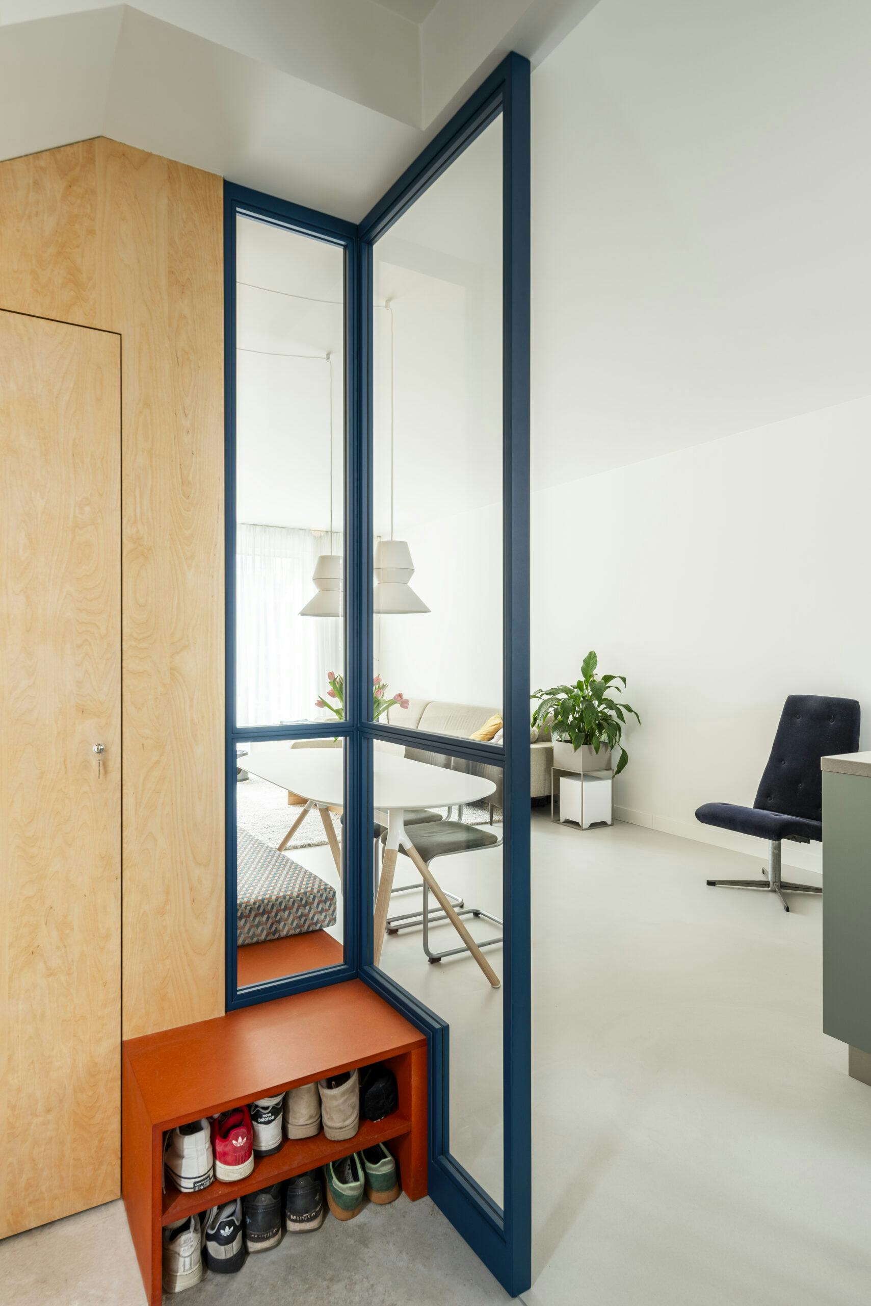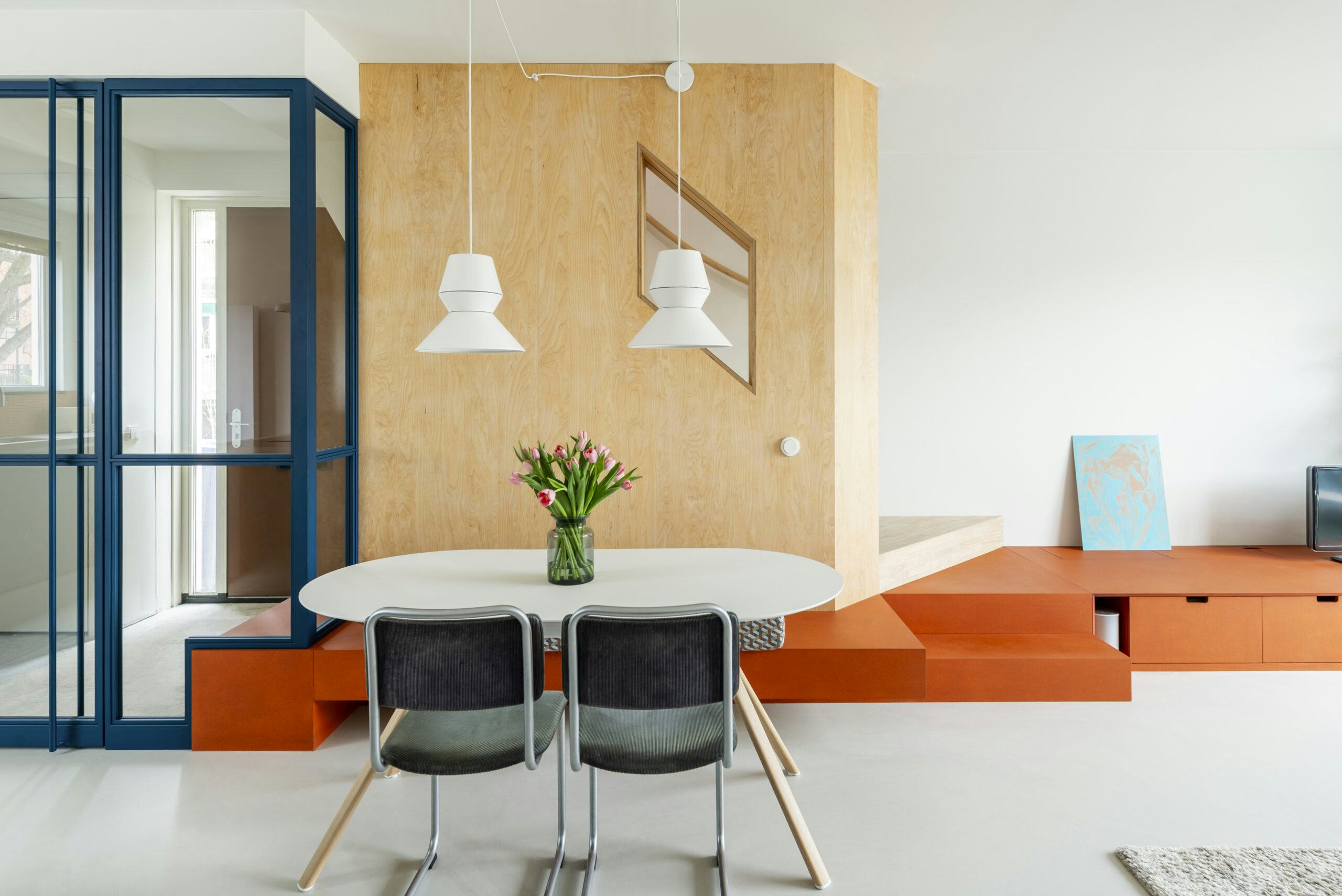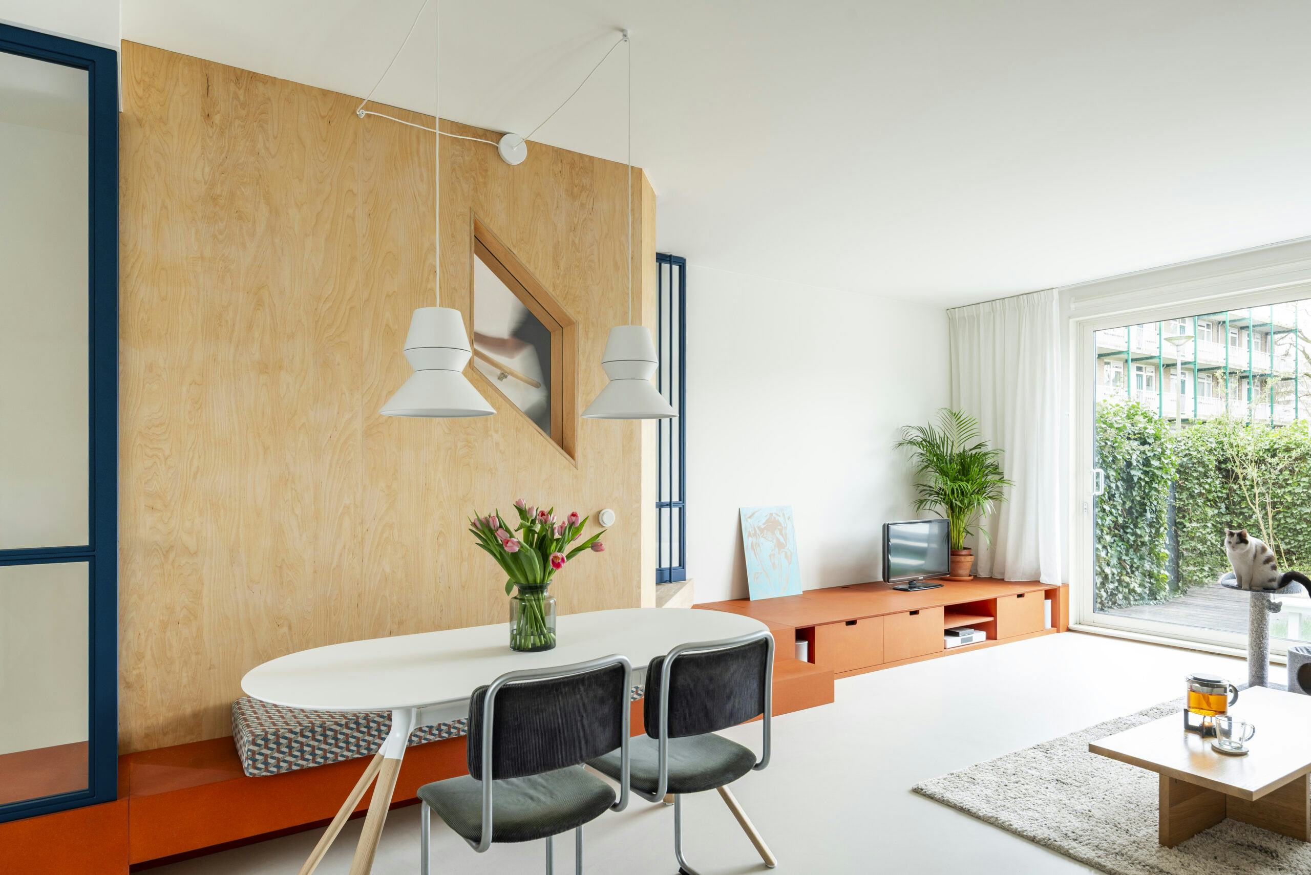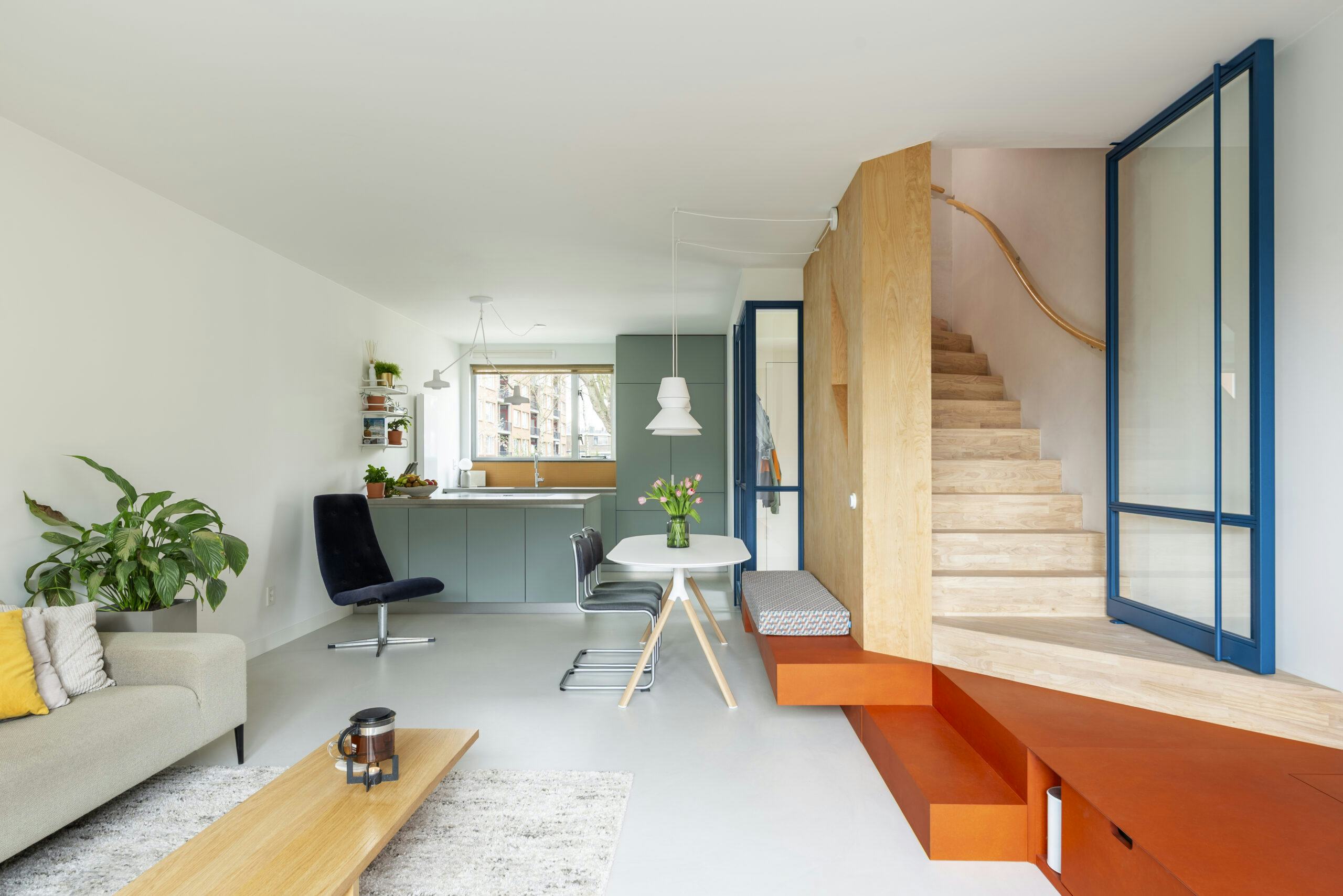 De ingrepen zijn zorgvuldig en met karkater gedetailleerd: metalen puien maar dan in een gewaagde kleur zorgen voor licht en zicht, schuine vormen die voortkomen uit de beweging rondom en de trap op, en een multifunctioneel meubel van oranje Valchromat. De trap is uitgevoerd in rubberwood en het wandelement in multiplex.