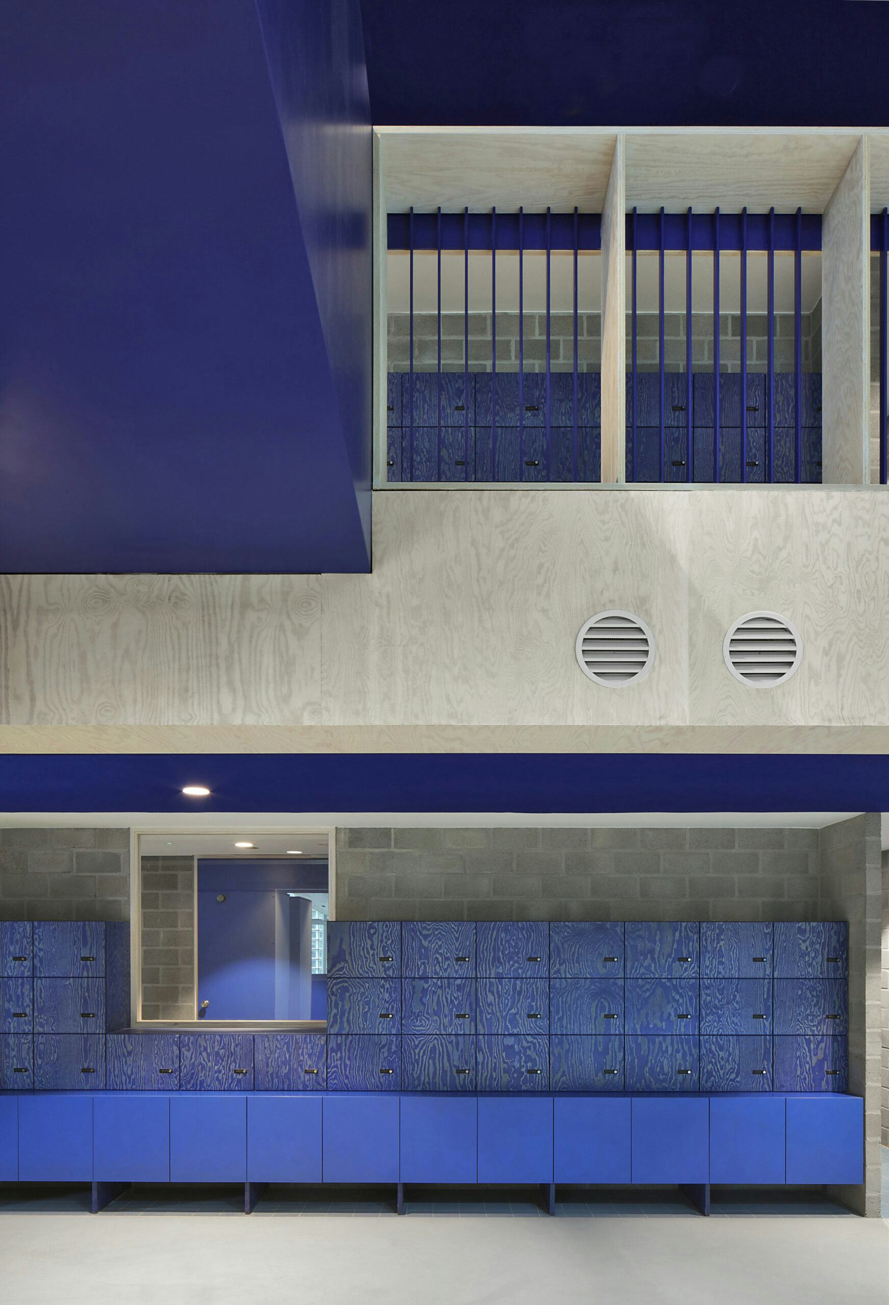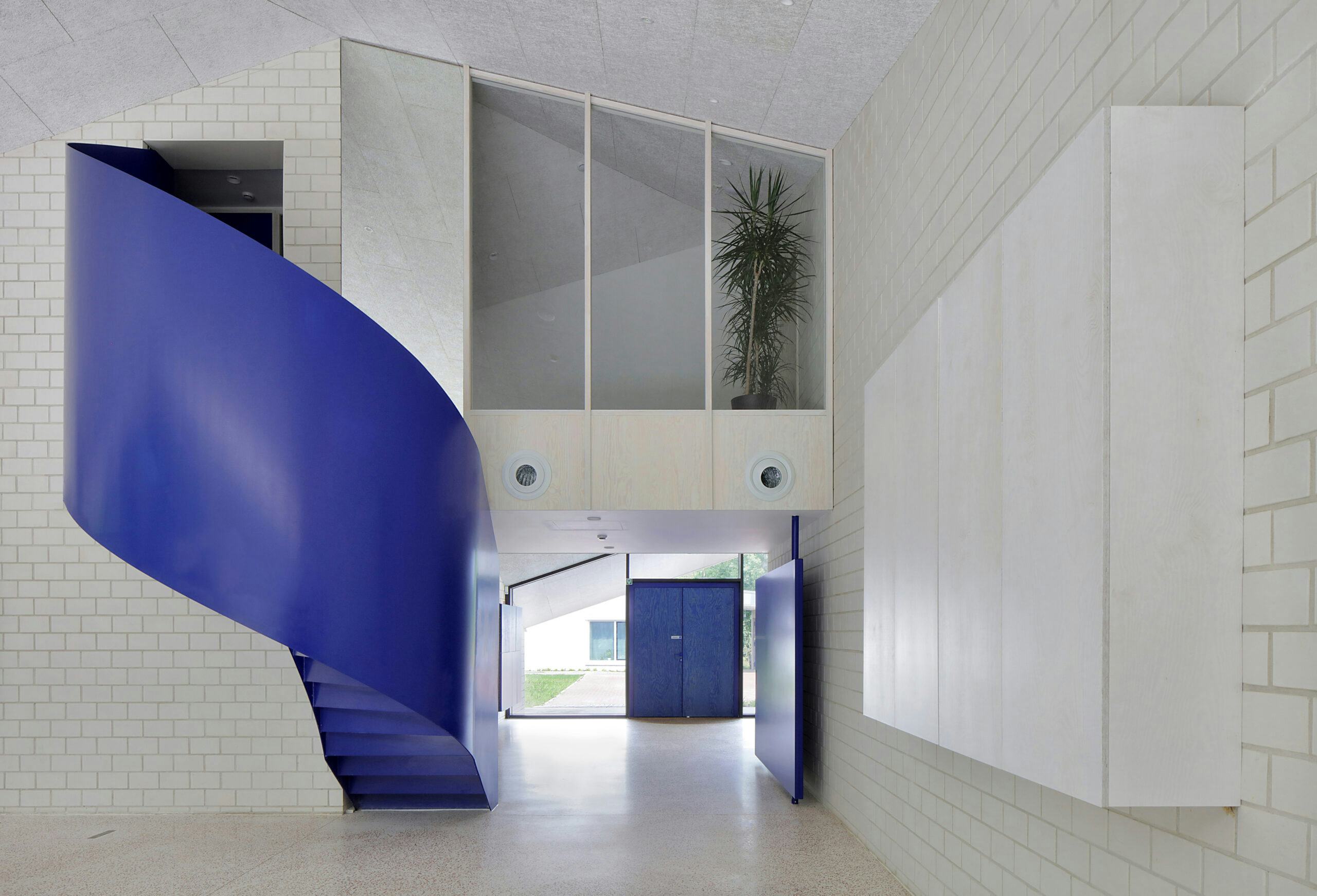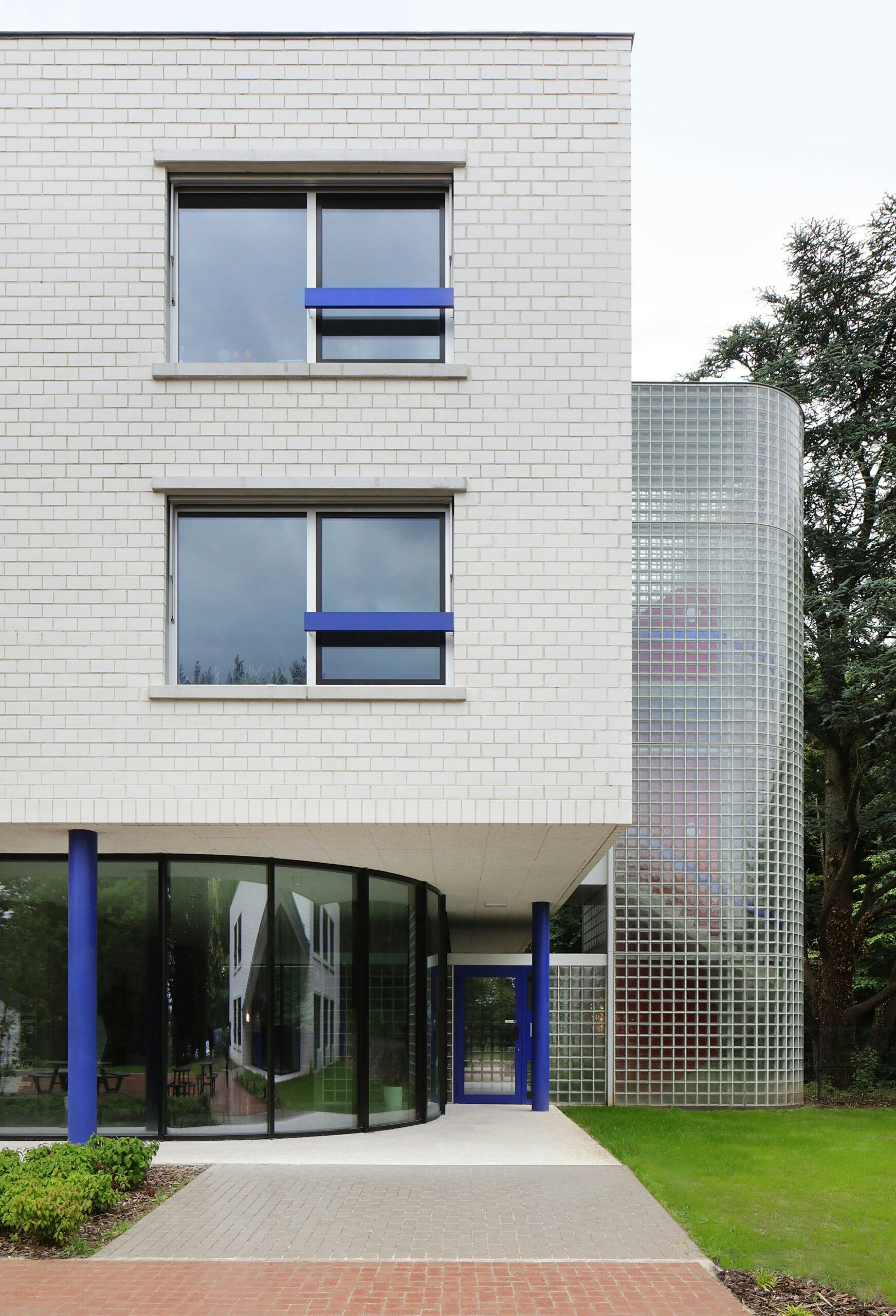 De keuze van materialen is gegeven door de bestaande villa in de tuin. Witte bakstenen volumes worden afgewisseld met grote open transparante niveaus. Blauwe accenten in structuur, trappen, ramen en interieur zorgen, binnen de diversiteit aan vorm en typologie, voor houvast. De architectuur is tijdloos, met volle aandacht voor materiaal, detail, geïntegreerd in groene context. De structuur van het kantoor is robuust en veerkrachtig. Een vaste kern zorgt voor structuur, andere ruimtes flexibel.