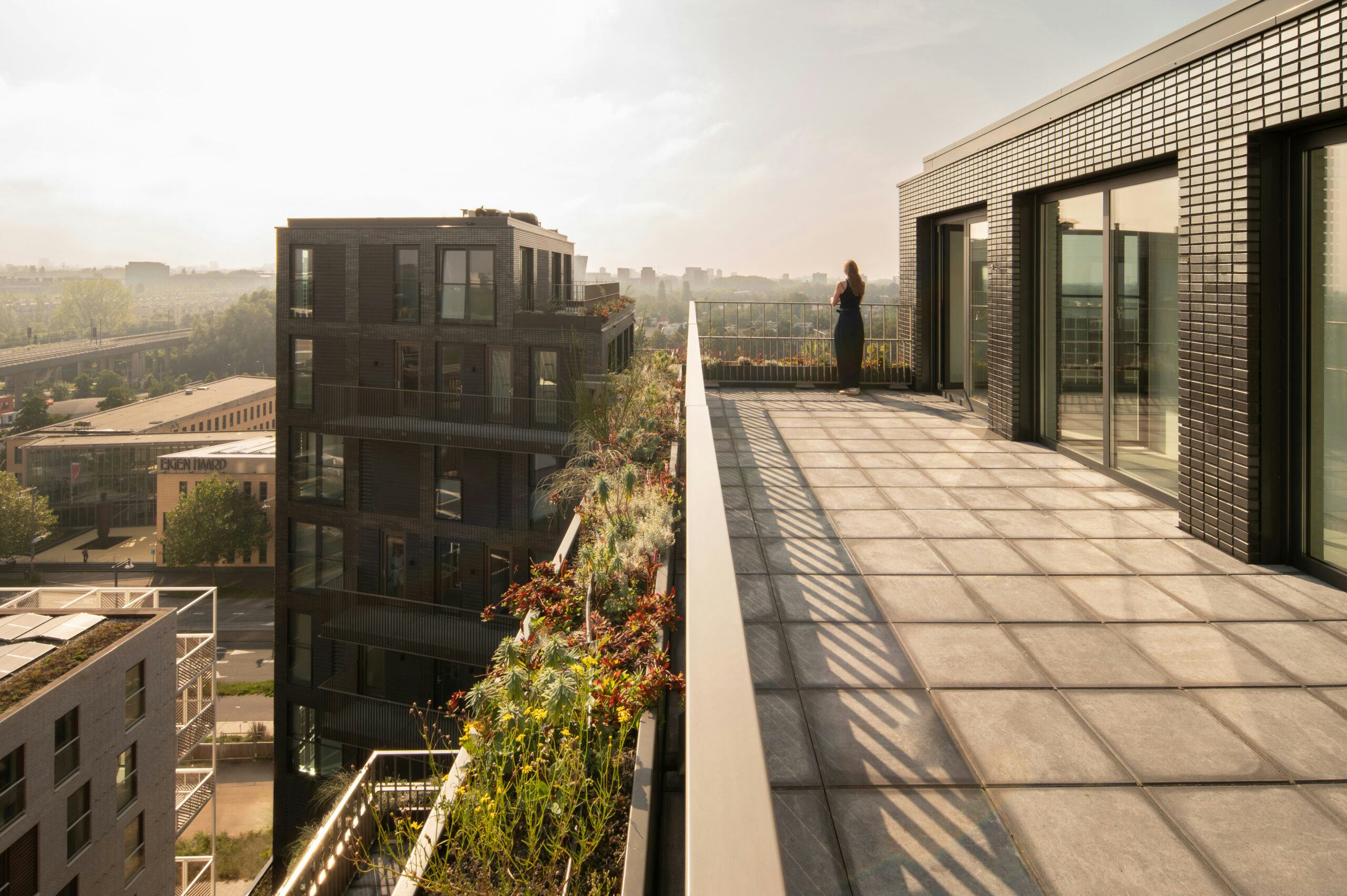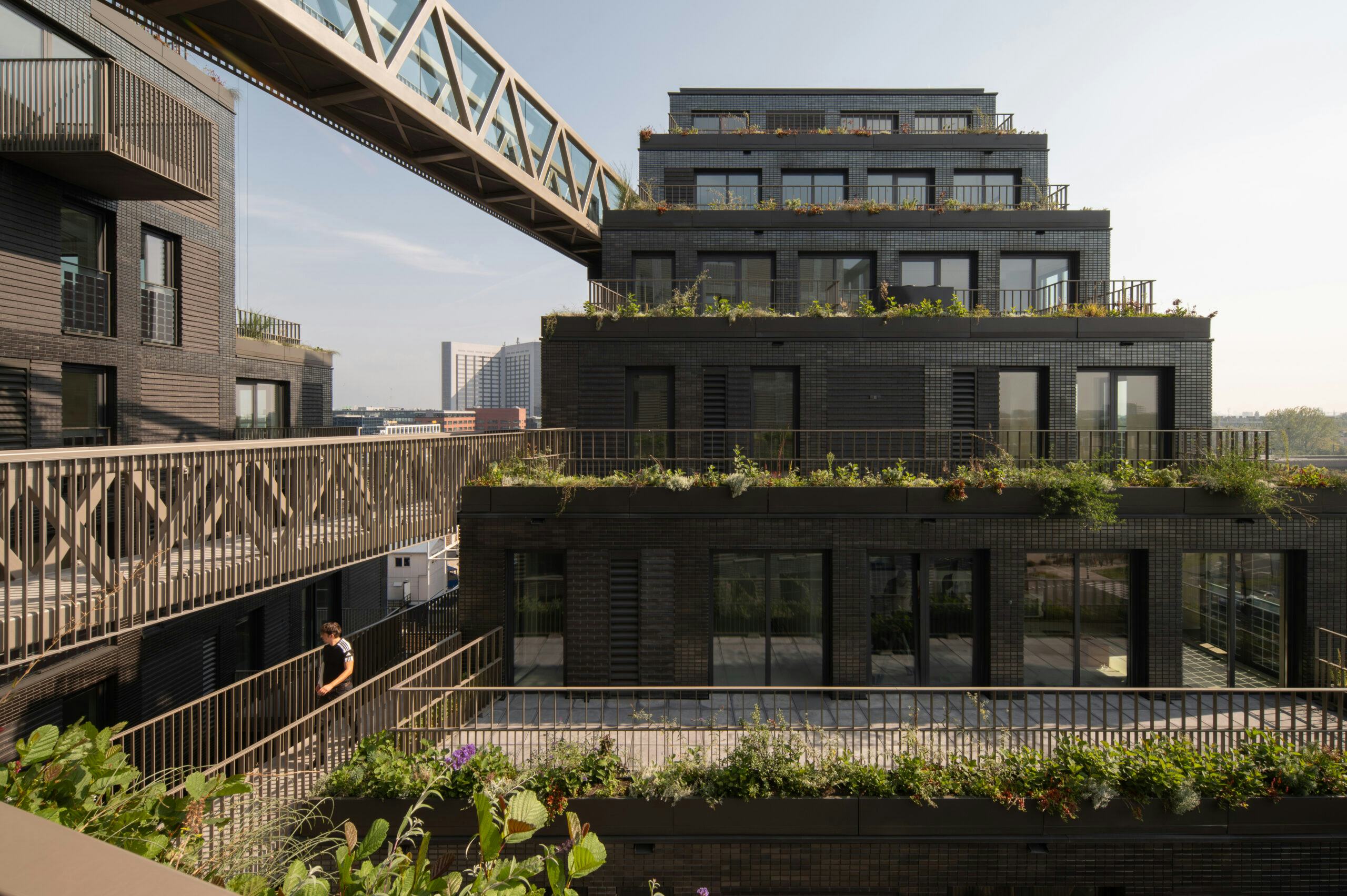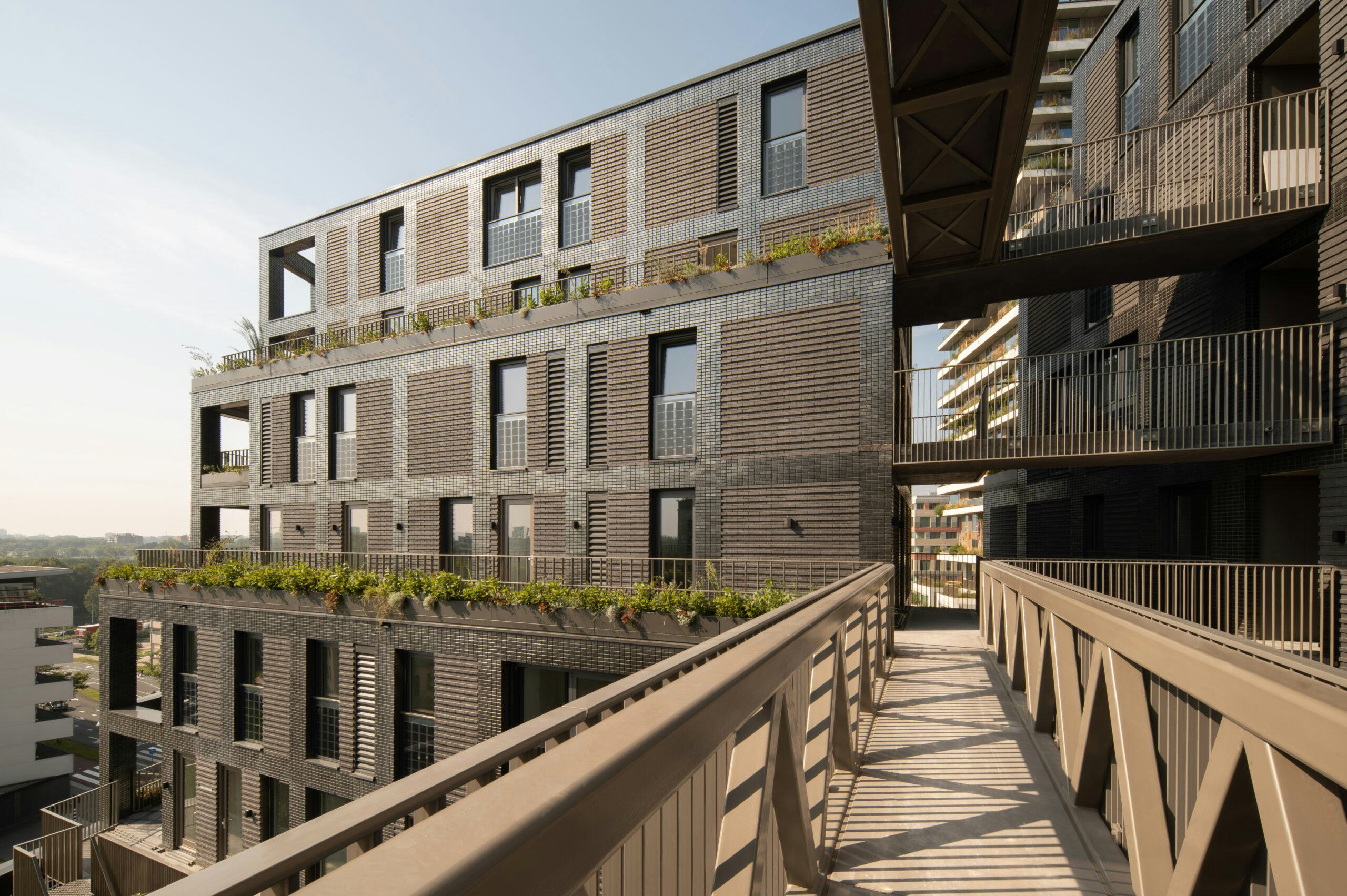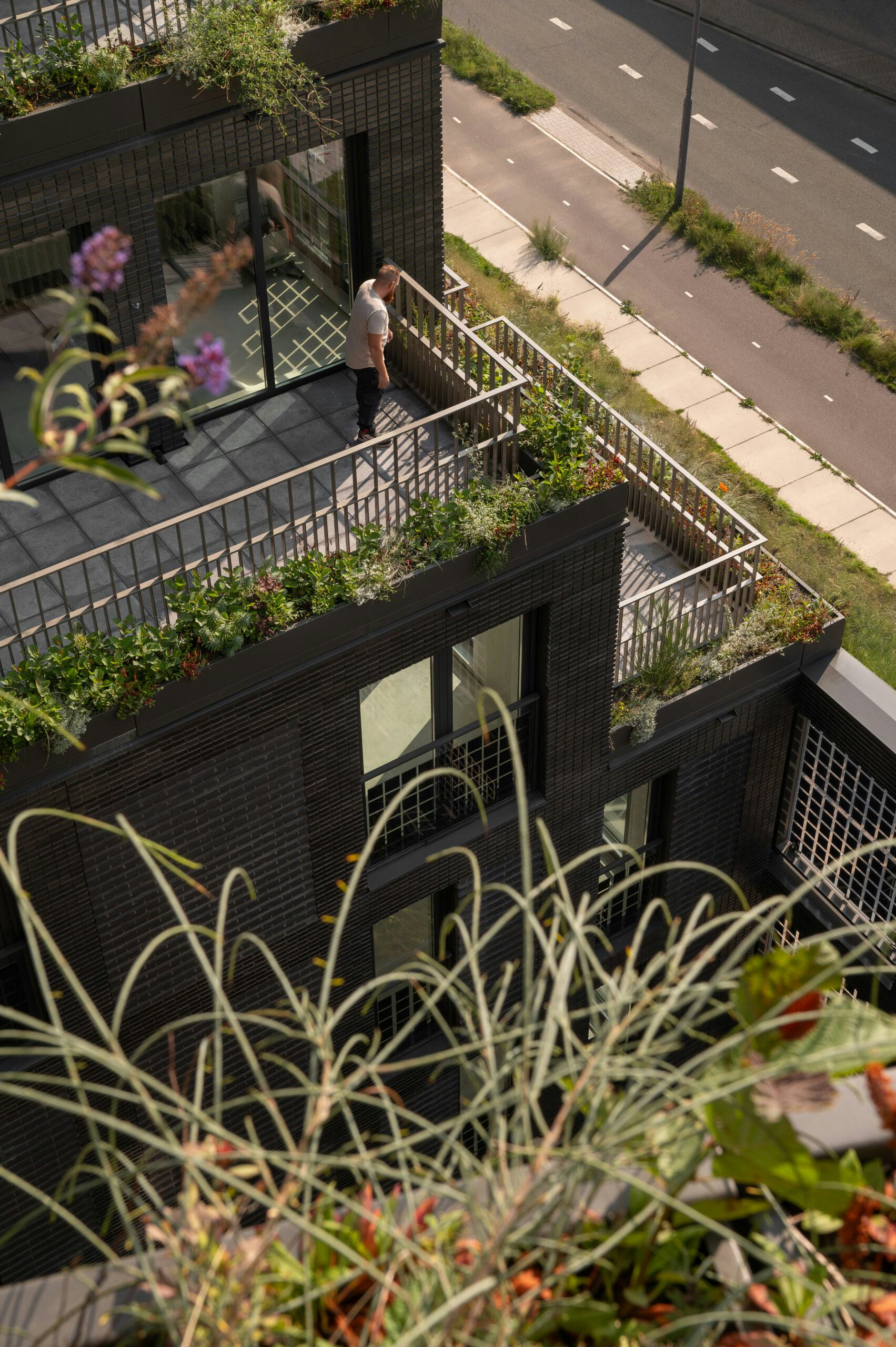 De materialisatie van de getrapte gevel met glimmende donkergekleurde bakstenen verleent het gebouw een monumentale uitstraling die perfect past bij deze hoogstedelijke locatie. De zorgvuldig gekozen bakstenen creëren een façade die zowel duurzaam als esthetisch aantrekkelijk is. De zwarte bakstenen en stalen loopbruggen contrasteren tevens prachtig met het groen van de gevelbakken en de gemeenschappelijke tuinen , wat een harmonieuze balans tussen natuur en architectuur creëert.