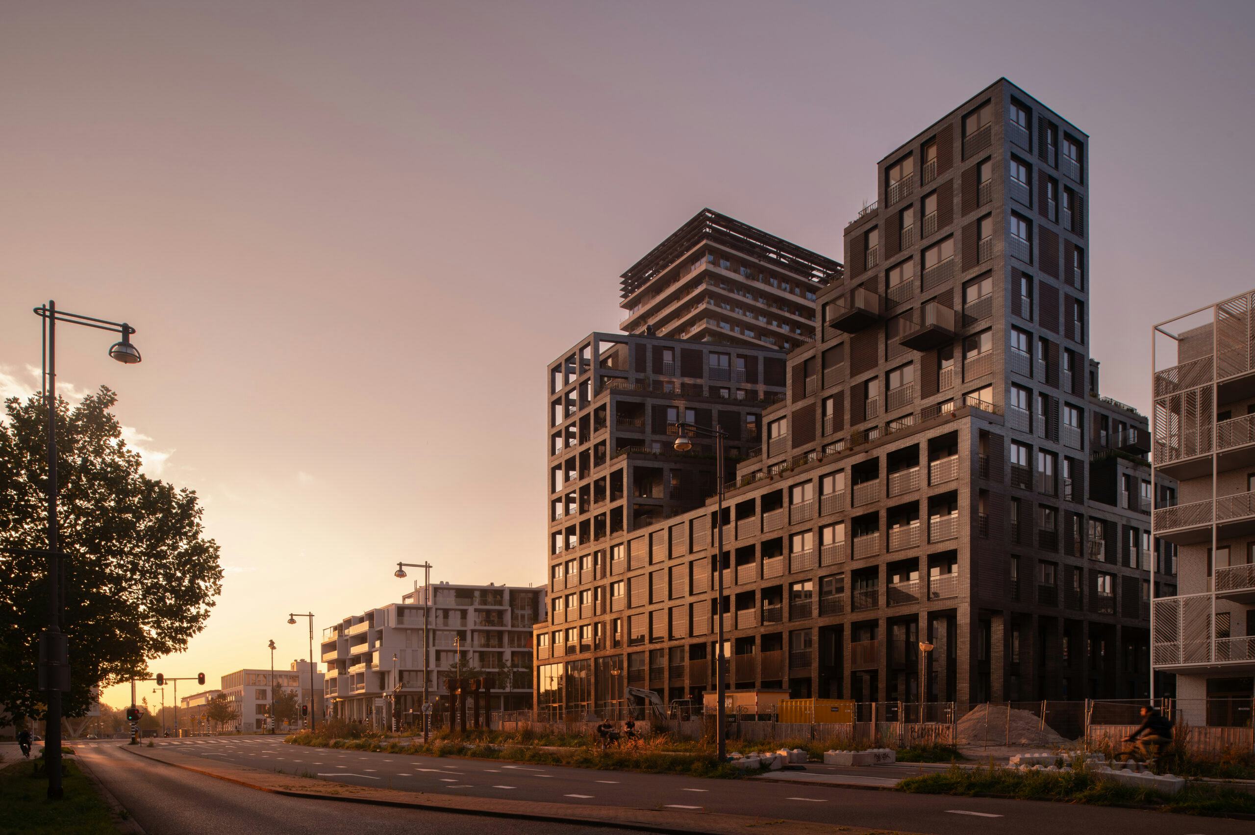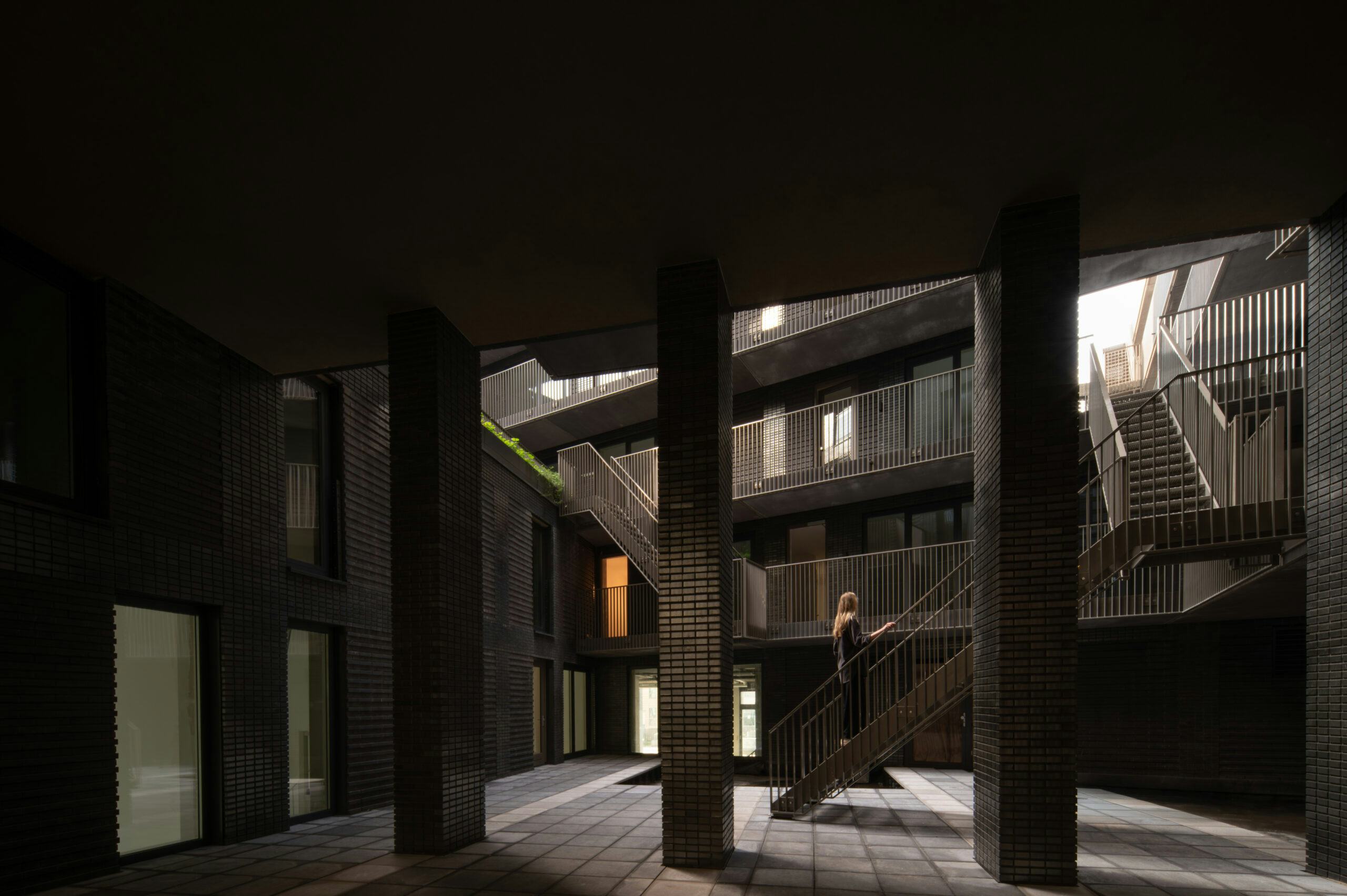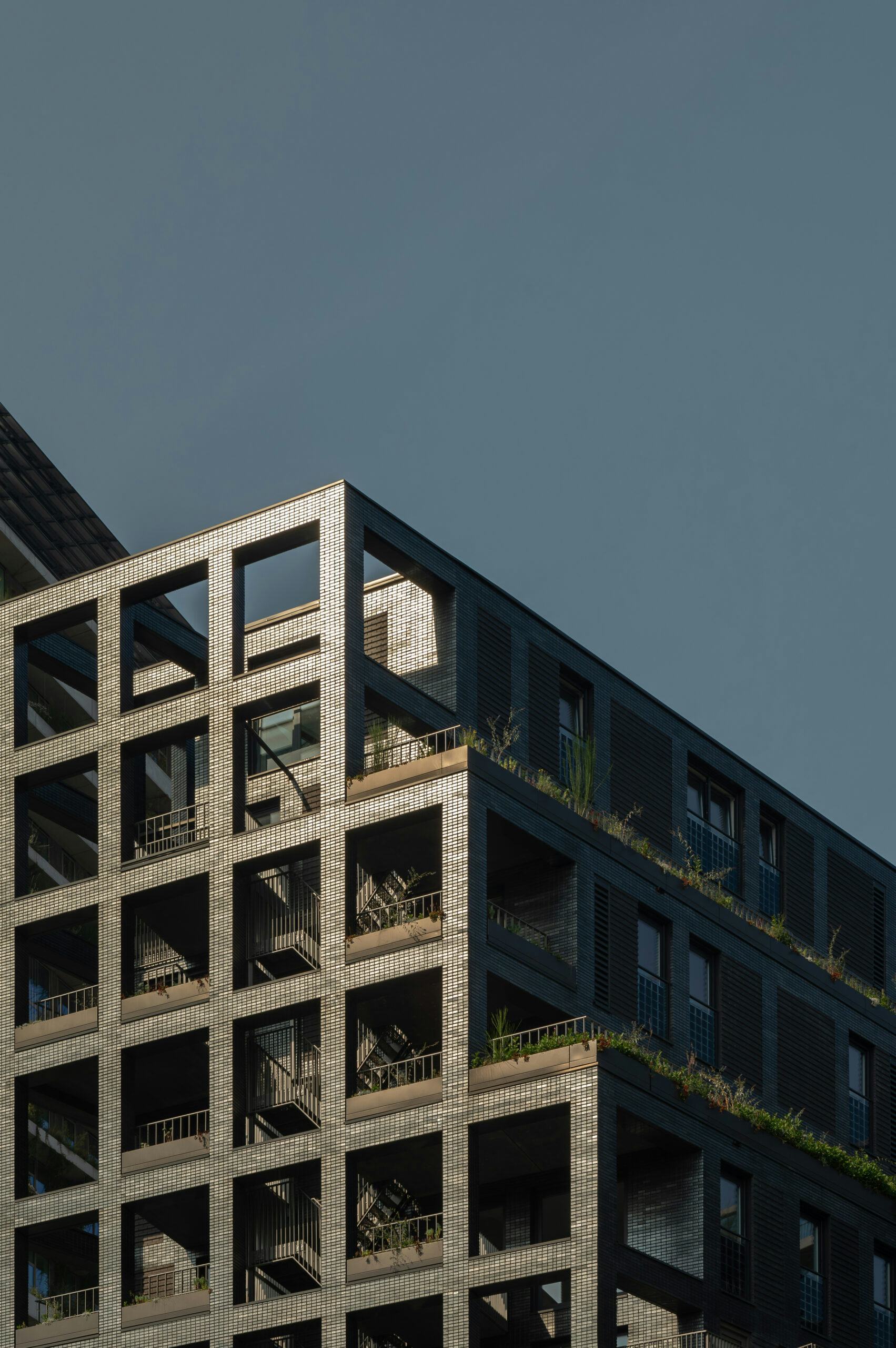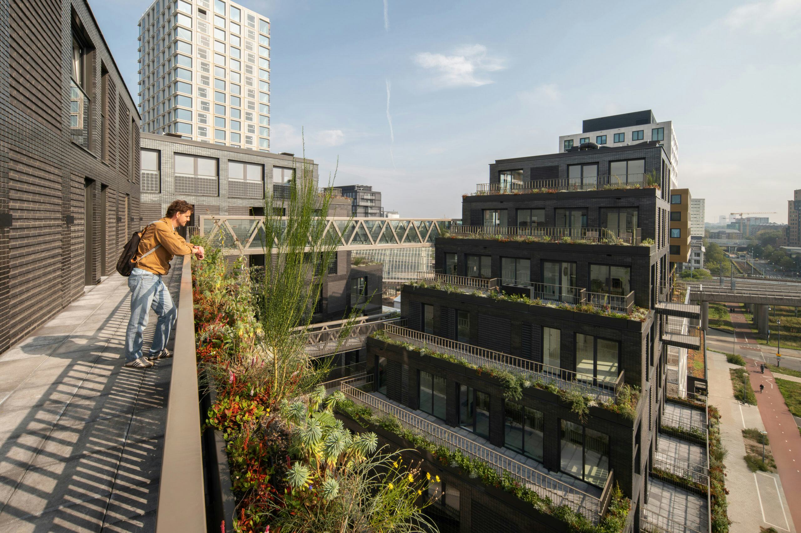 De materialisatie van de getrapte gevel met glimmende donkergekleurde bakstenen verleent het gebouw een monumentale uitstraling die perfect past bij deze hoogstedelijke locatie. De zorgvuldig gekozen bakstenen creëren een façade die zowel duurzaam als esthetisch aantrekkelijk is. De zwarte bakstenen en stalen loopbruggen contrasteren tevens prachtig met het groen van de gevelbakken en de gemeenschappelijke tuinen , wat een harmonieuze balans tussen natuur en architectuur creëert.
