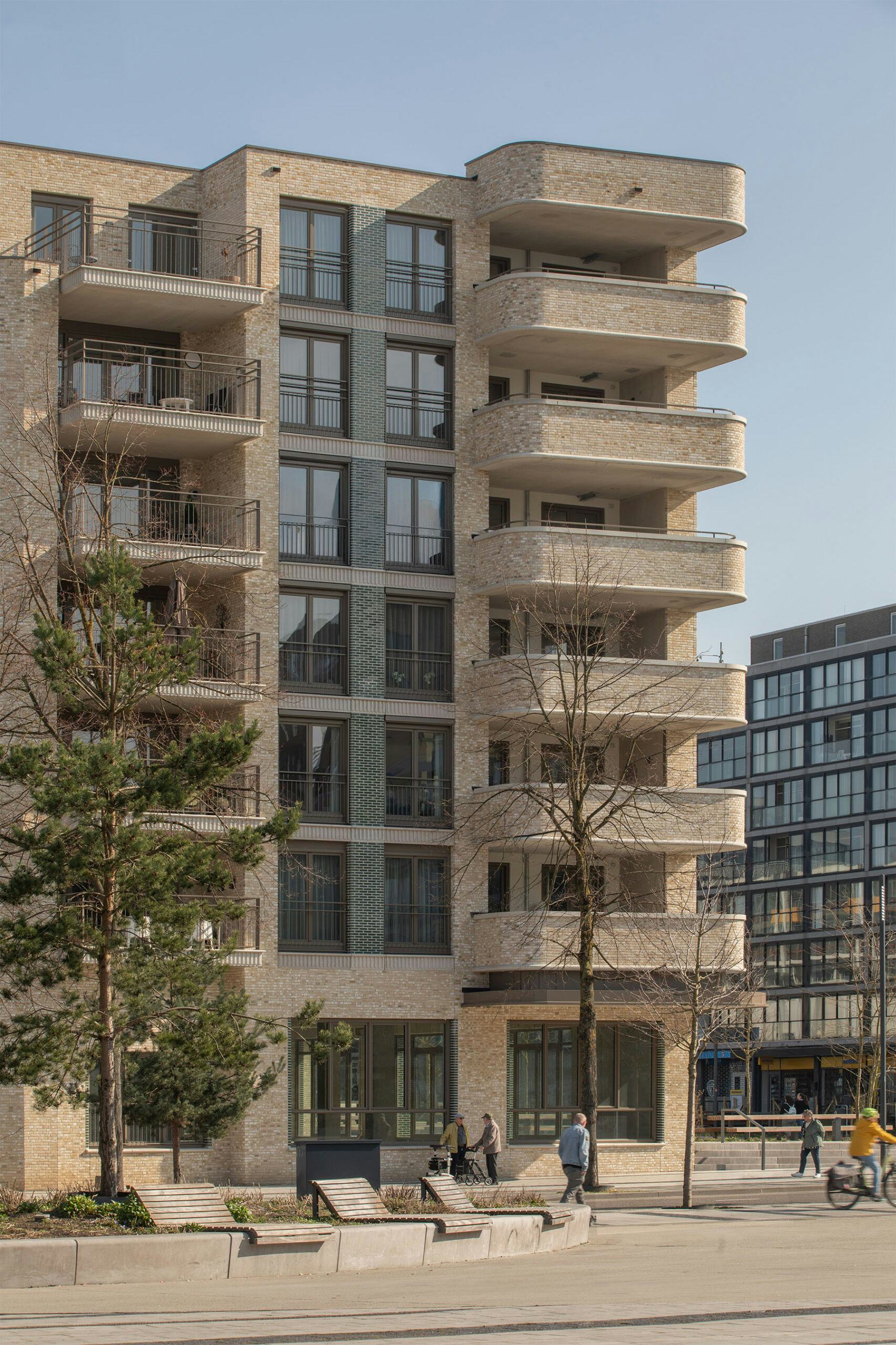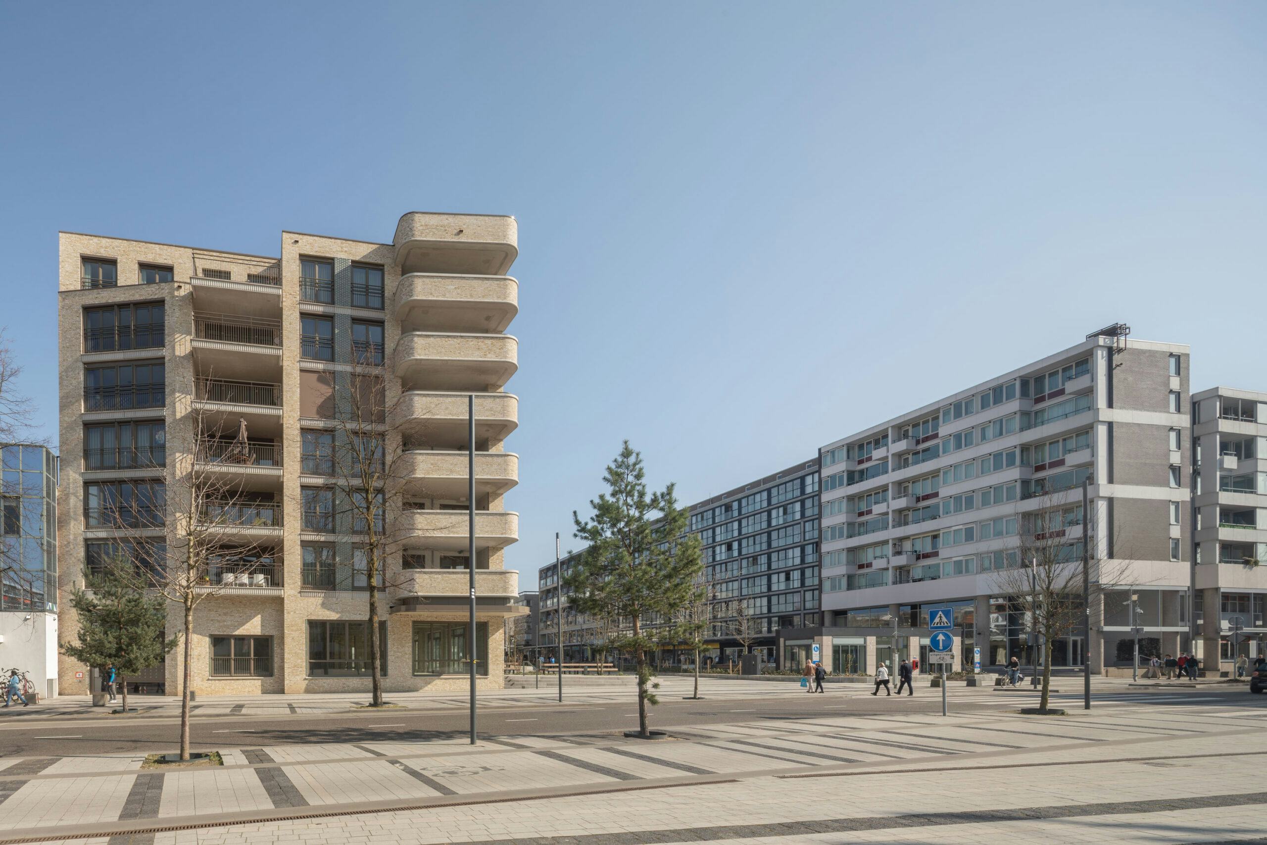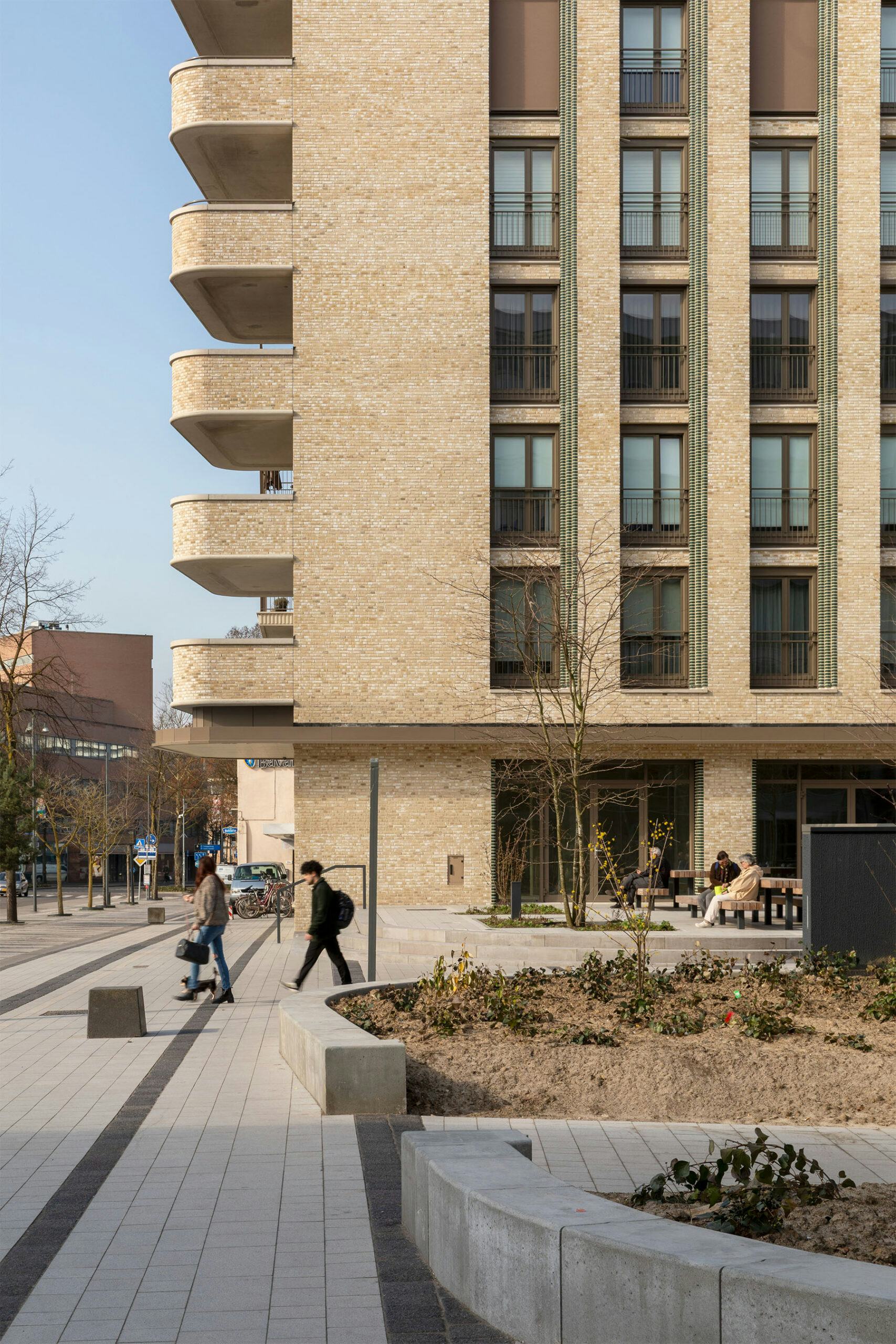 De lichte gemeleerde steen is een bewuste tegenhanger van de sombere grijze uitstraling van het voormalige winkelcentrum. De stenen komen van een steenfabriek uit de regio. Met glazuurmeester van St-Joris hebben gezocht naar een locatie-specifieke kleur voor de glazuurstenen accenten. Om het wonen weer zichtbaar te krijgen maakten we grote balkons. Deze hebben we een rand gegeven in de vorm van een betonnen tandlijst, die als horizontaal schaalelement in het hele gebouw is doorgevoerd.