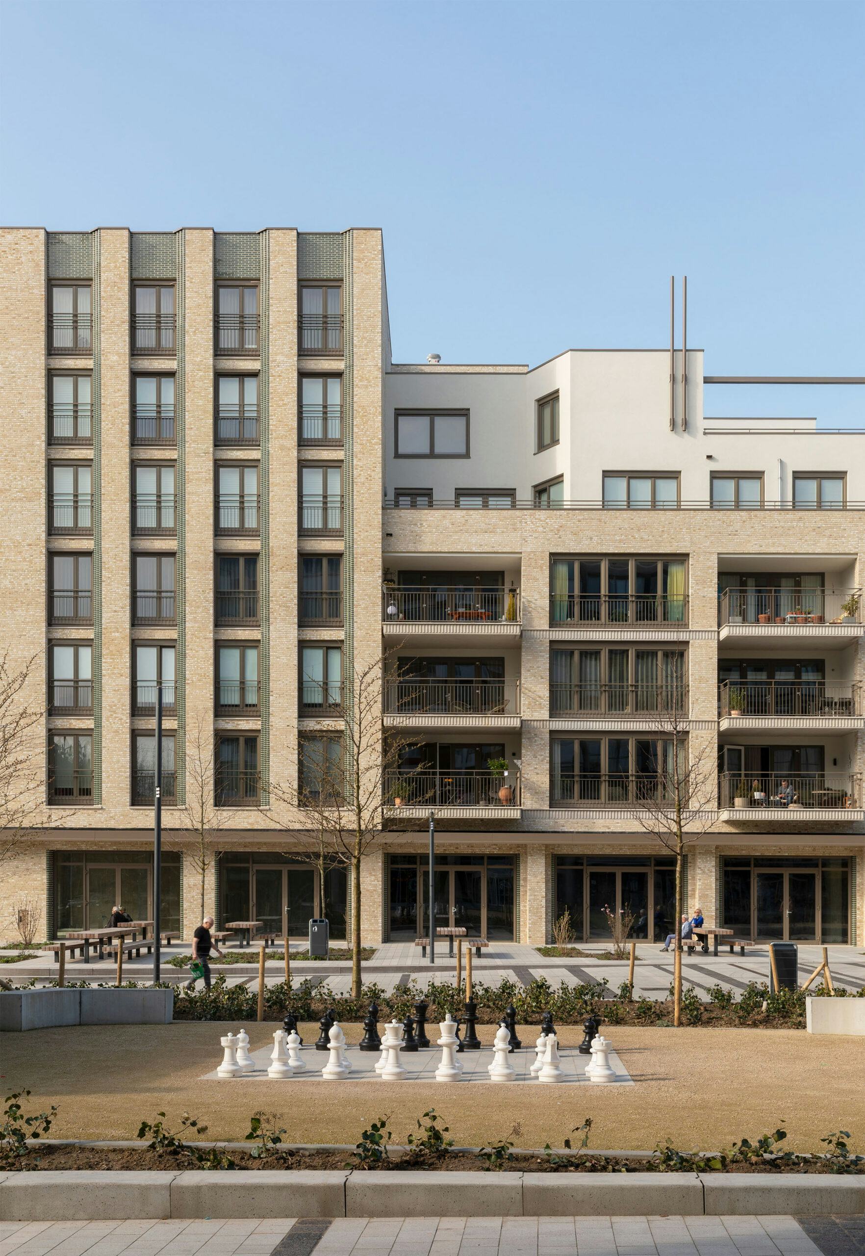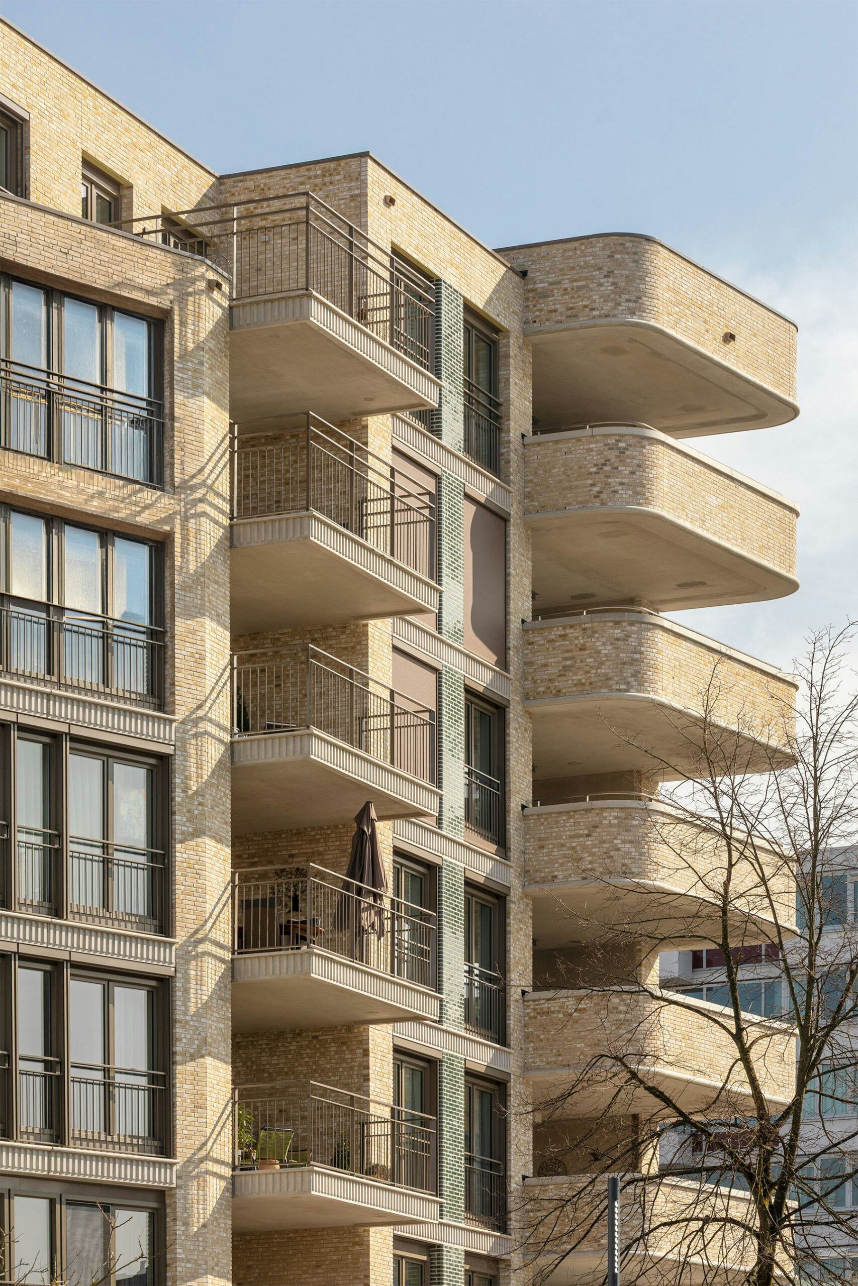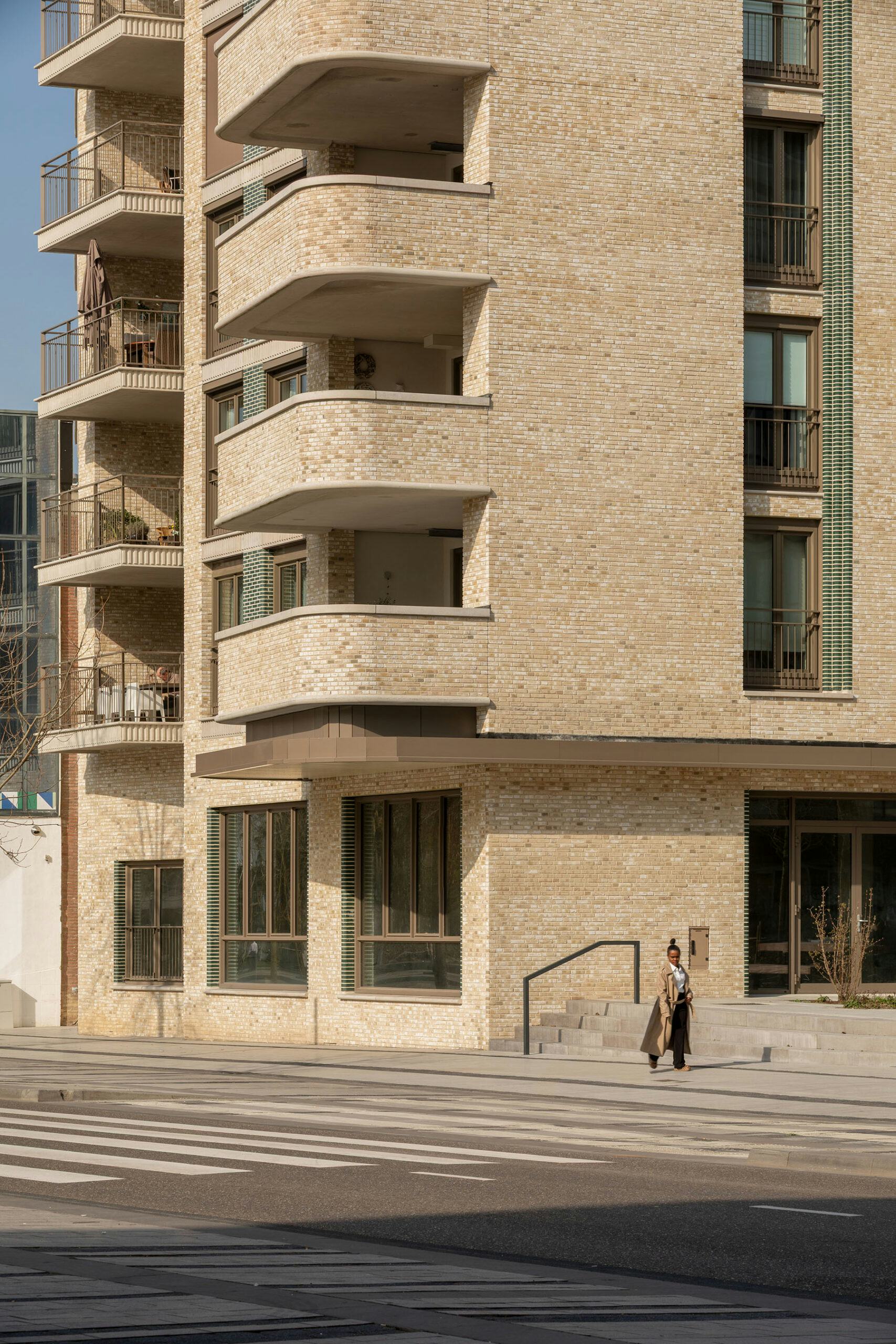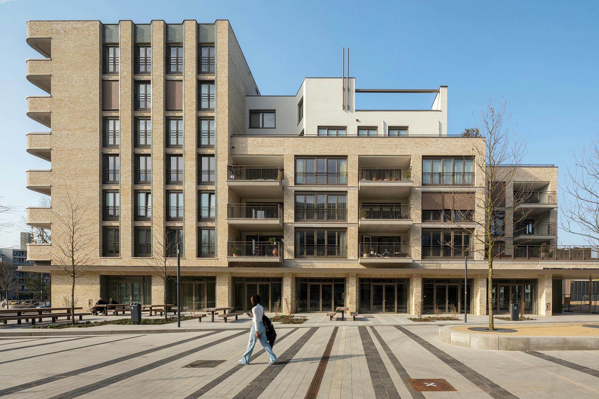 De lichte gemeleerde steen is een bewuste tegenhanger van de sombere grijze uitstraling van het voormalige winkelcentrum. De stenen komen van een steenfabriek uit de regio. Met glazuurmeester van St-Joris hebben gezocht naar een locatie-specifieke kleur voor de glazuurstenen accenten. Om het wonen weer zichtbaar te krijgen maakten we grote balkons. Deze hebben we een rand gegeven in de vorm van een betonnen tandlijst, die als horizontaal schaalelement in het hele gebouw is doorgevoerd.