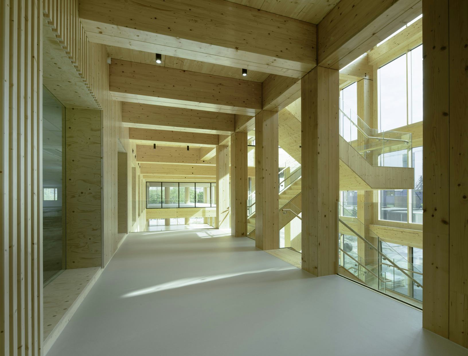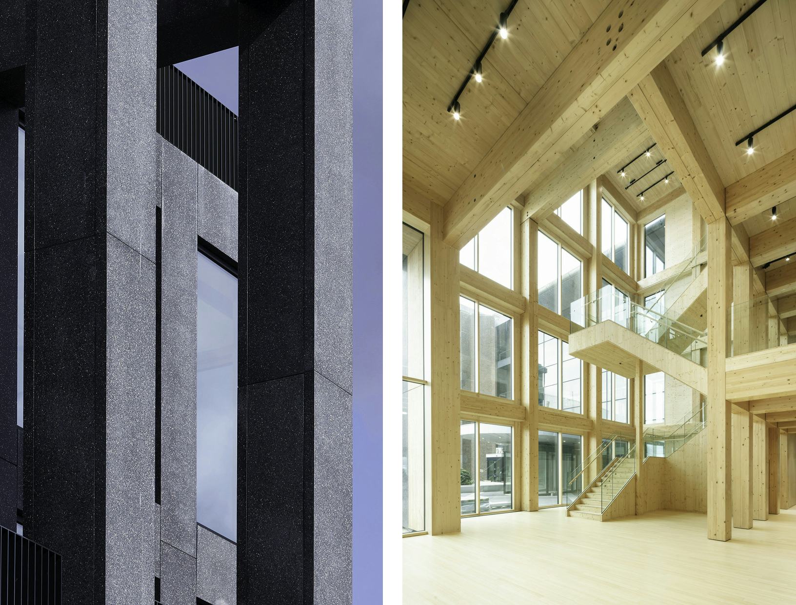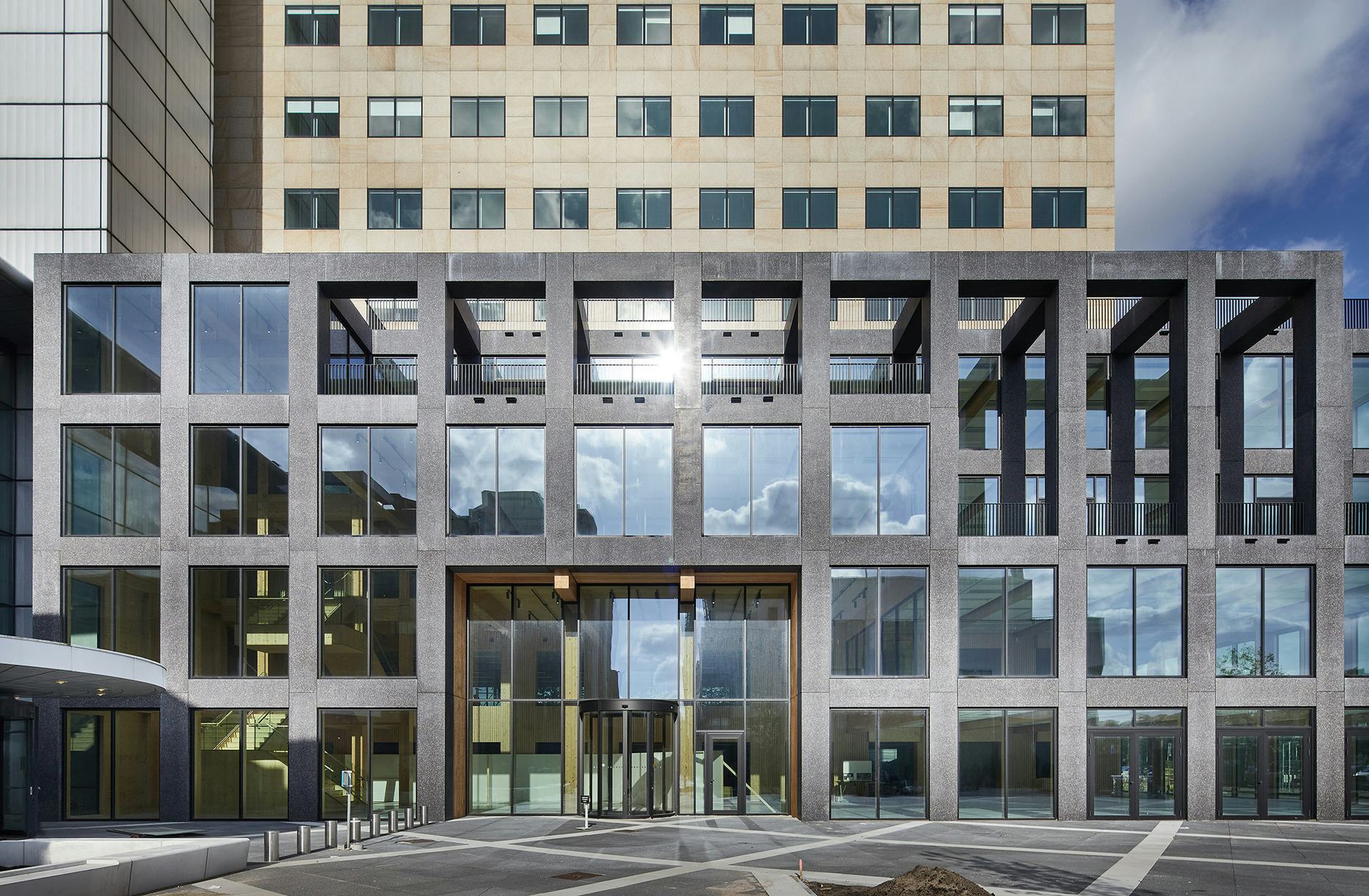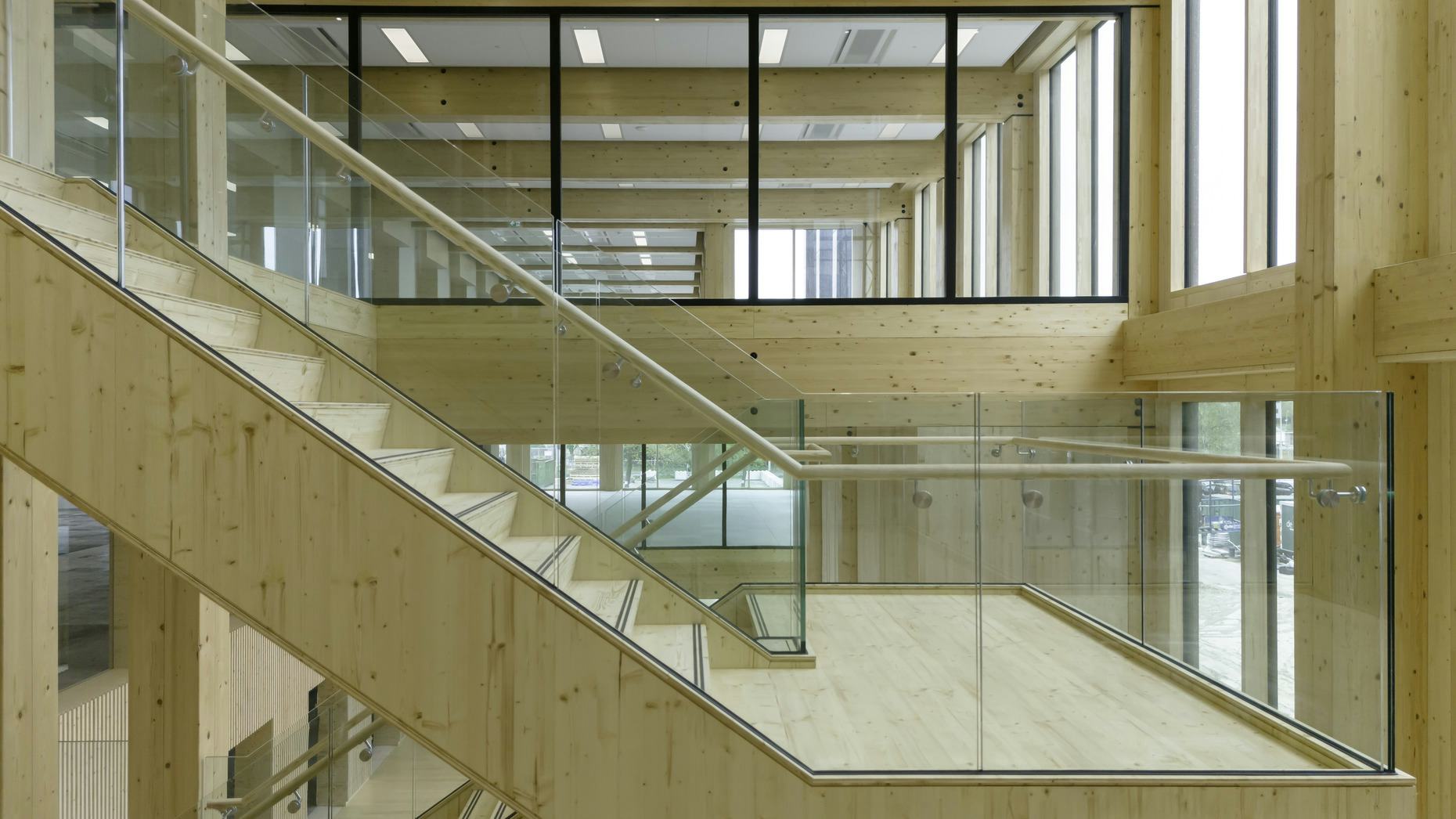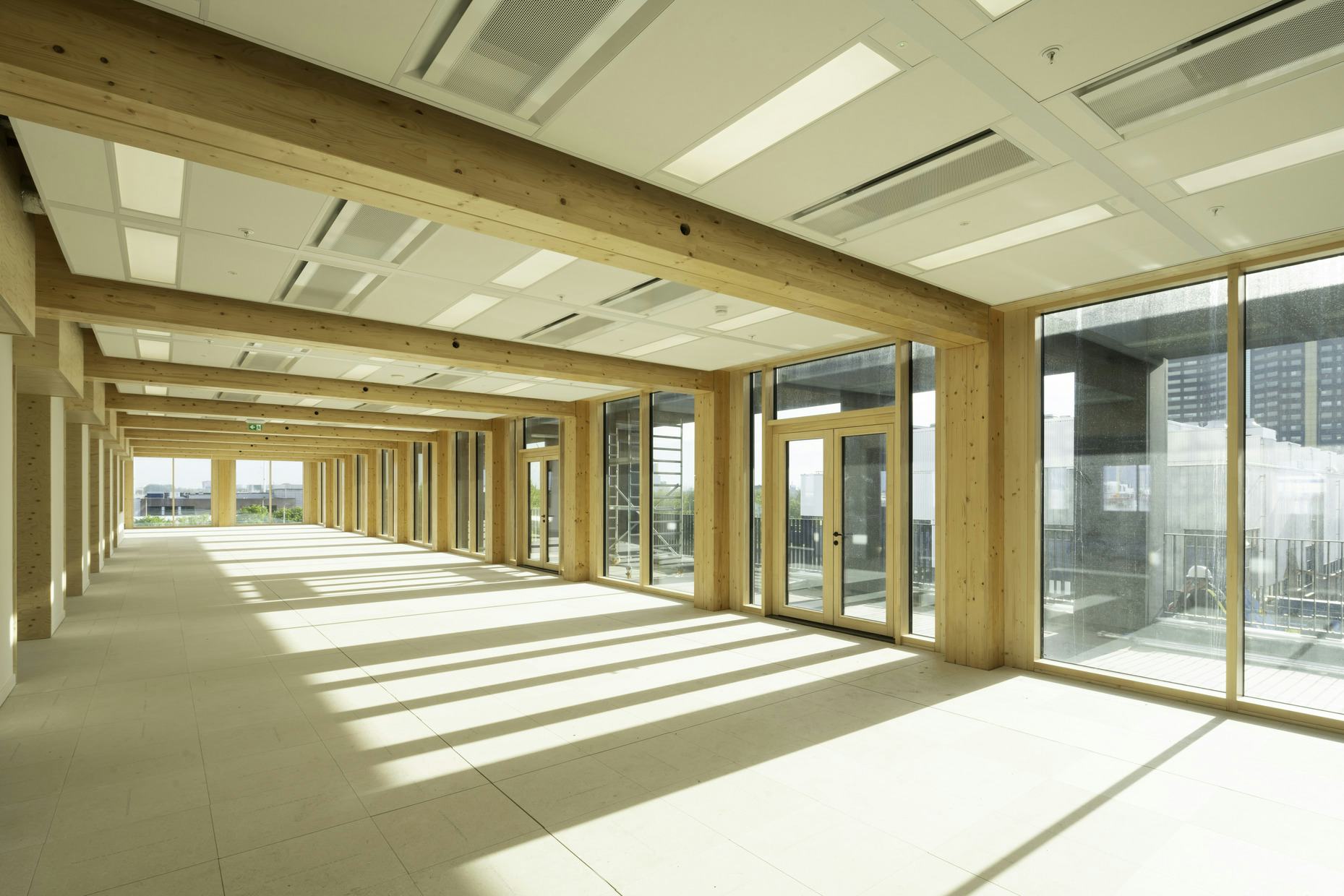 Het voormalige Telegraaf-complex kreeg een tweede leven met duurzame uitstraling. De houten uitbreiding voegt vier verdiepingen toe en versterkt het industriële karakter. De nieuwe entree leidt naar een licht atrium dat verbindt met het centrale plein. Een sculpturale houten trap dient als ankerpunt en bevordert interactie. De architectuur past bij het stoere karakter van District West, met een functioneel grid zichtbaar in de gevel. Tussen de gevelelementen zijn verspringende terrassen geplaats