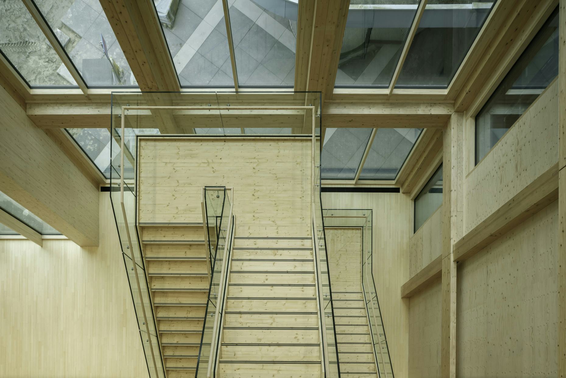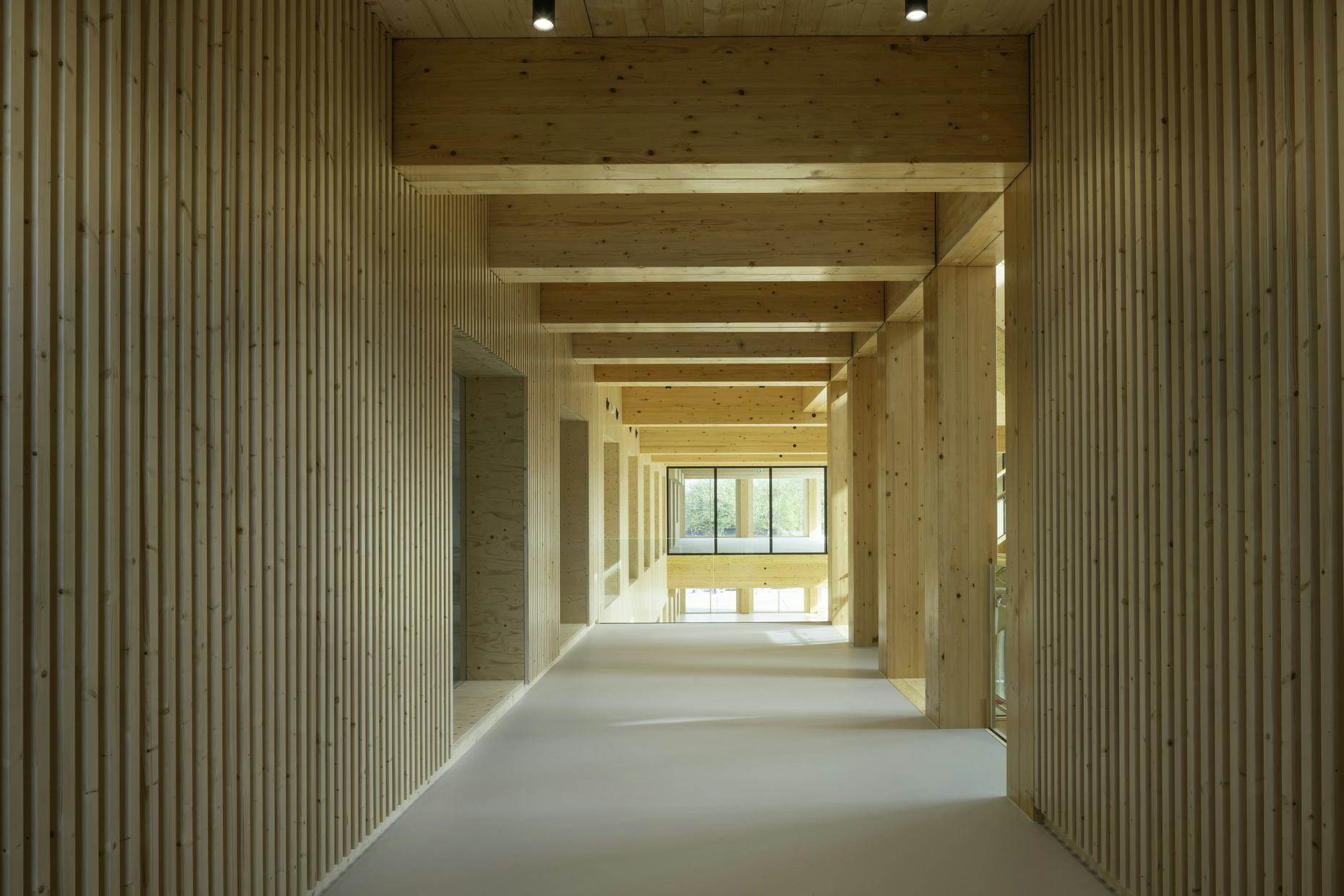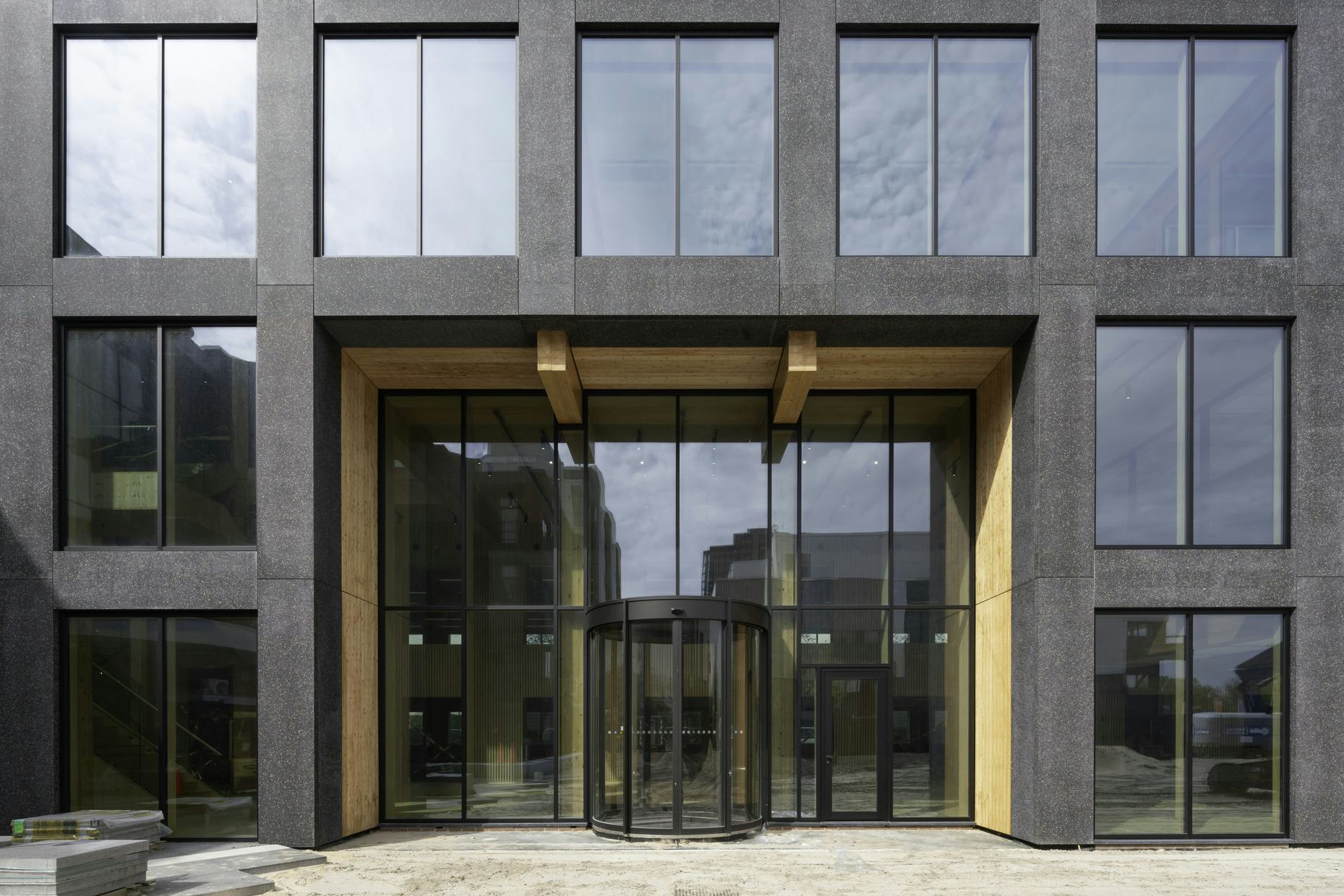 In contrast met de robuuste gevel is de constructie van de nieuwe uitbreiding volledig duurzaam in hout. De schoonheid komt voort uit de materialiteit: de houten binnenwereld creëert een uitnodigend, warm interieur. De buitengevels bevatten graniettoeslag als knipoog naar de oorspronkelijke bouw. Binnen is de vloer afgewerkt met stoeptegels voor akoestiek en duurzaamheid. Deze materiaalkeuzes dragen bij aan een circulair, toekomstbestendig gebouw.