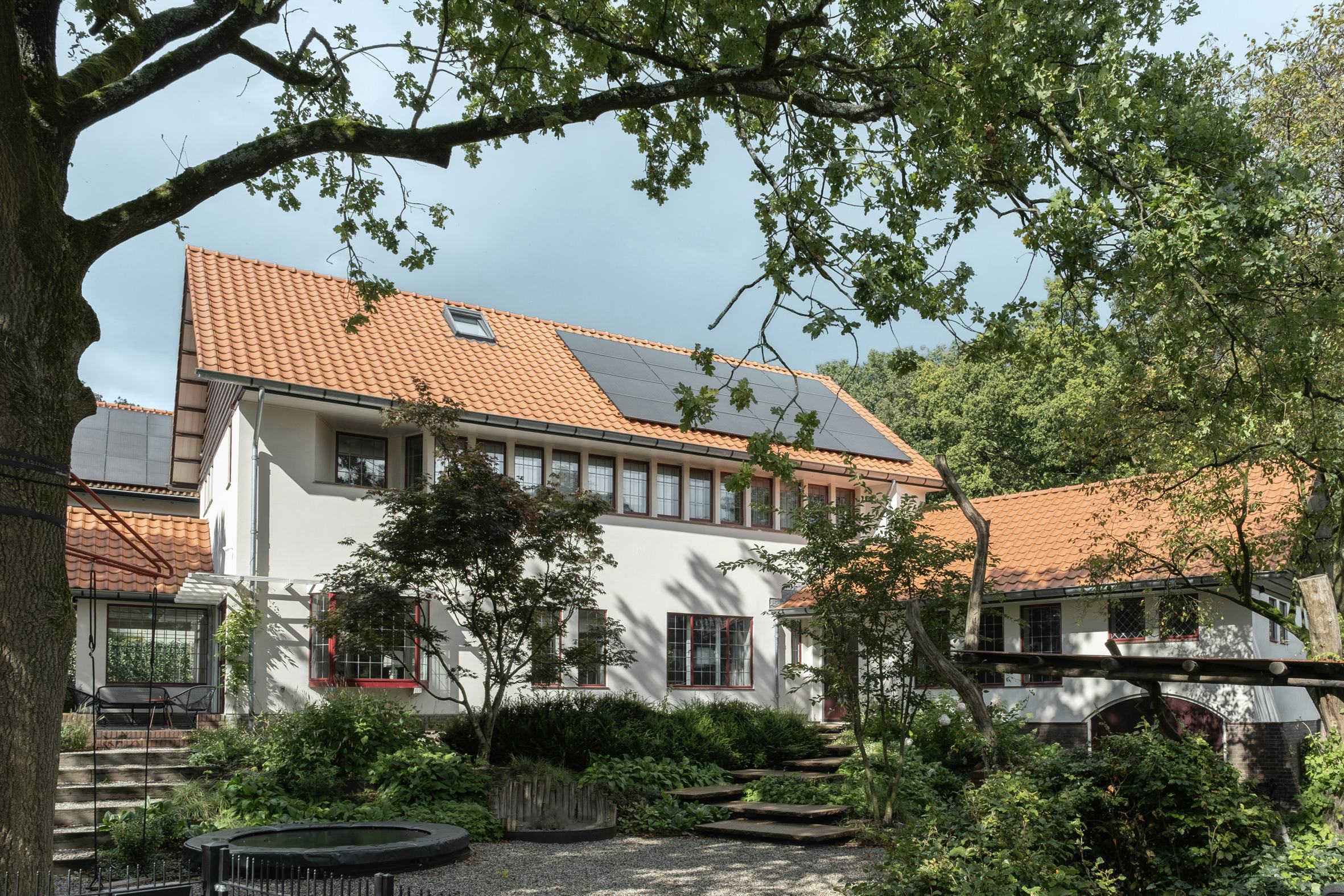 Door de ligging aan de voet van het glooiende bos kennen zowel het perceel als de woning diverse niveauverschillen. Vanaf de toegang van het terrein trapt het landschap op naar de ingang. Het huis kreeg een indrukwekkende entree waarbij de dubbele hoogte in de zijvleugel is geaccentueerd. De interne hoogteverschillen bieden in iedere ruimte een andere woonbeleving en een uniek uitzicht op de omgeving. Dankzij een nieuw verhoogd terras is een optimale verbinding met de tuin en het bos ontstaan.