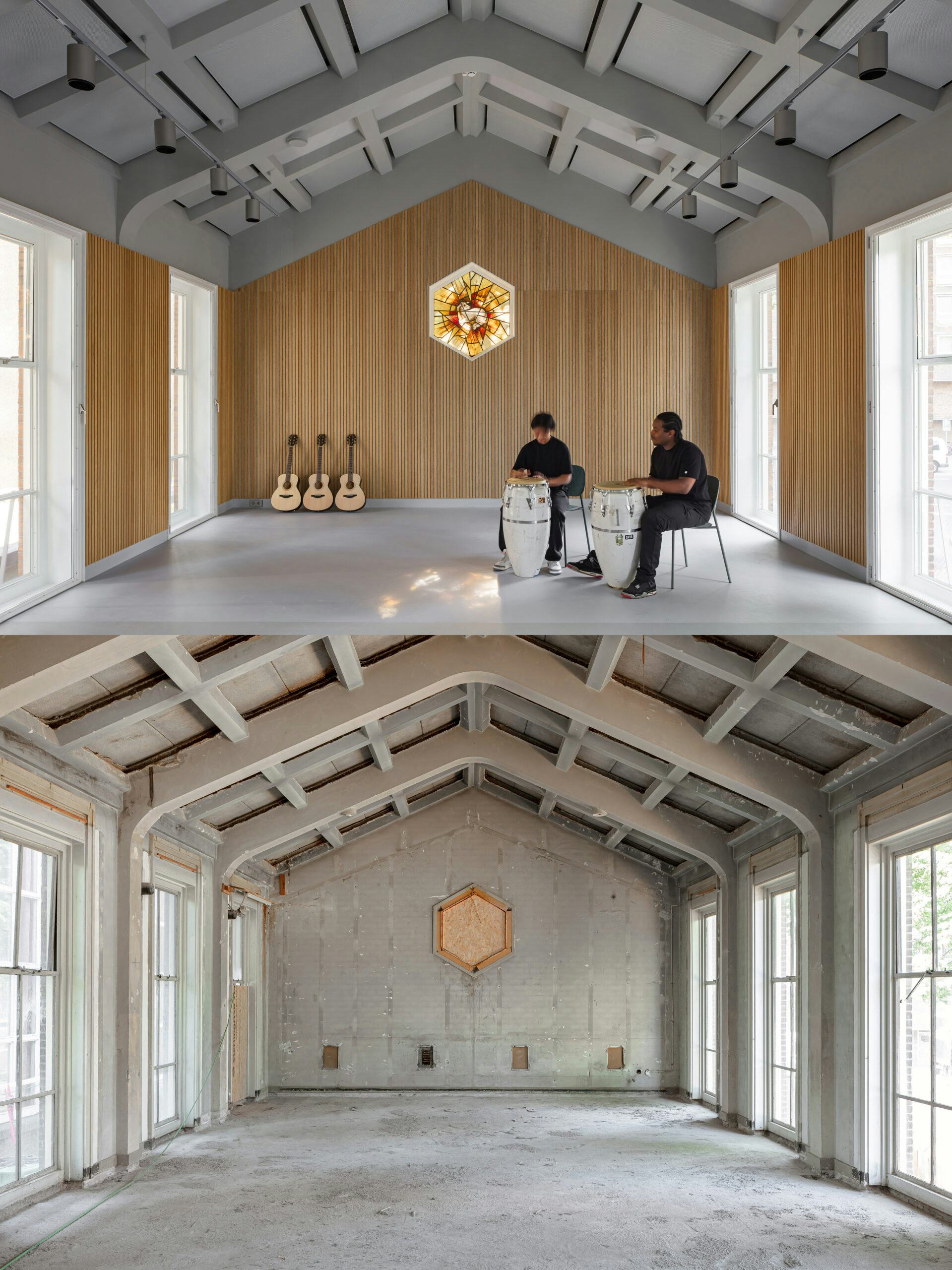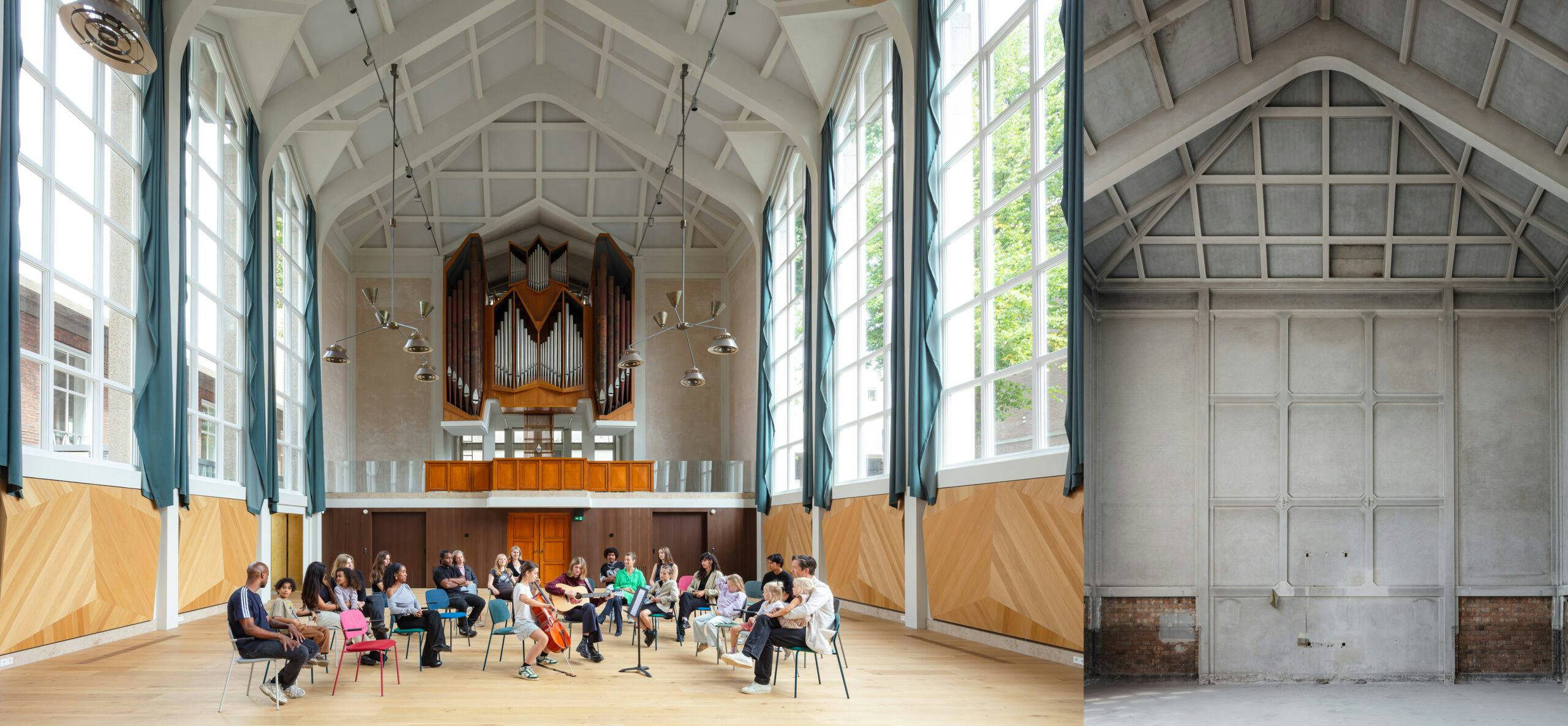 Met veel aandacht voor detail en materialen hebben we het gebouw nieuw leven ingeblazen, terwijl de oorspronkelijke sfeer en ruimtelijke kwaliteiten zo veel mogelijk zijn behouden. Elke ruimte vroeg om een unieke benadering, van op maat gemaakte akoestische behandelingen om geluidsoverlast in de betonnen structuur te vermijden, tot het vervangen van stucwerk door geluidsabsorberend materiaal in het cassetteplafond. Wandpanelen in de grote kerkzaal verspreiden geluid en creëren een warme sfeer.