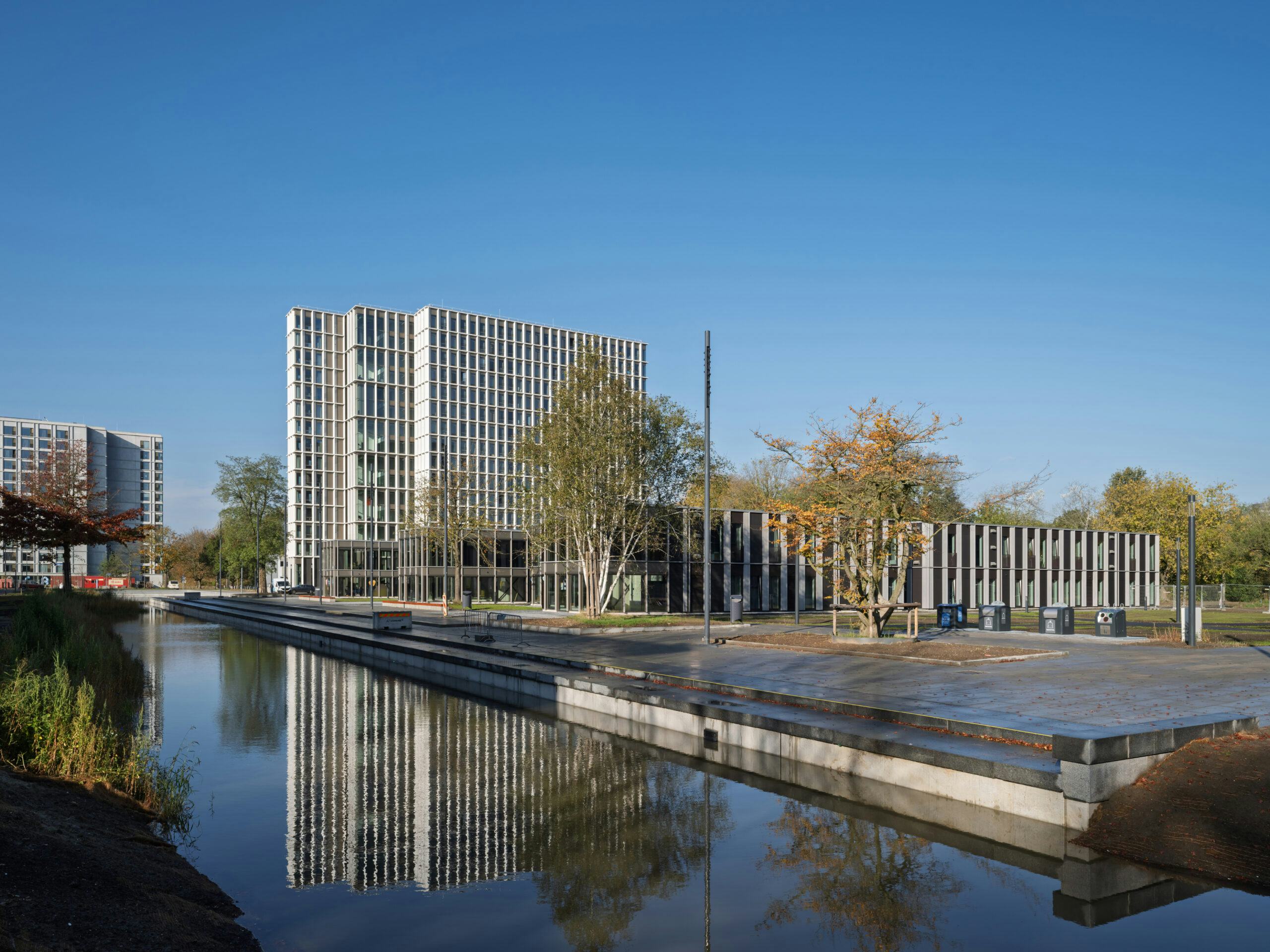 Het nieuwe gebouw is zorgvuldig ingepast in de bestaande structuur. De torens sluiten aan op eerdere bouwfasen en volgen de rationele en tektonische principes van de campus-architectuur; Robuuste betonnen gevels met een expliciet maatsysteem. Ook draagt het project bij aan een groene leefomgeving. Groene daken, waterbuffering en inheemse beplanting bevorderen biodiversiteit. Entrees en ontmoetingsplekken zijn gekoppeld aan de Blauwe Loper, en landschappelijke routes vanaf de Dommel zijn voorzien.