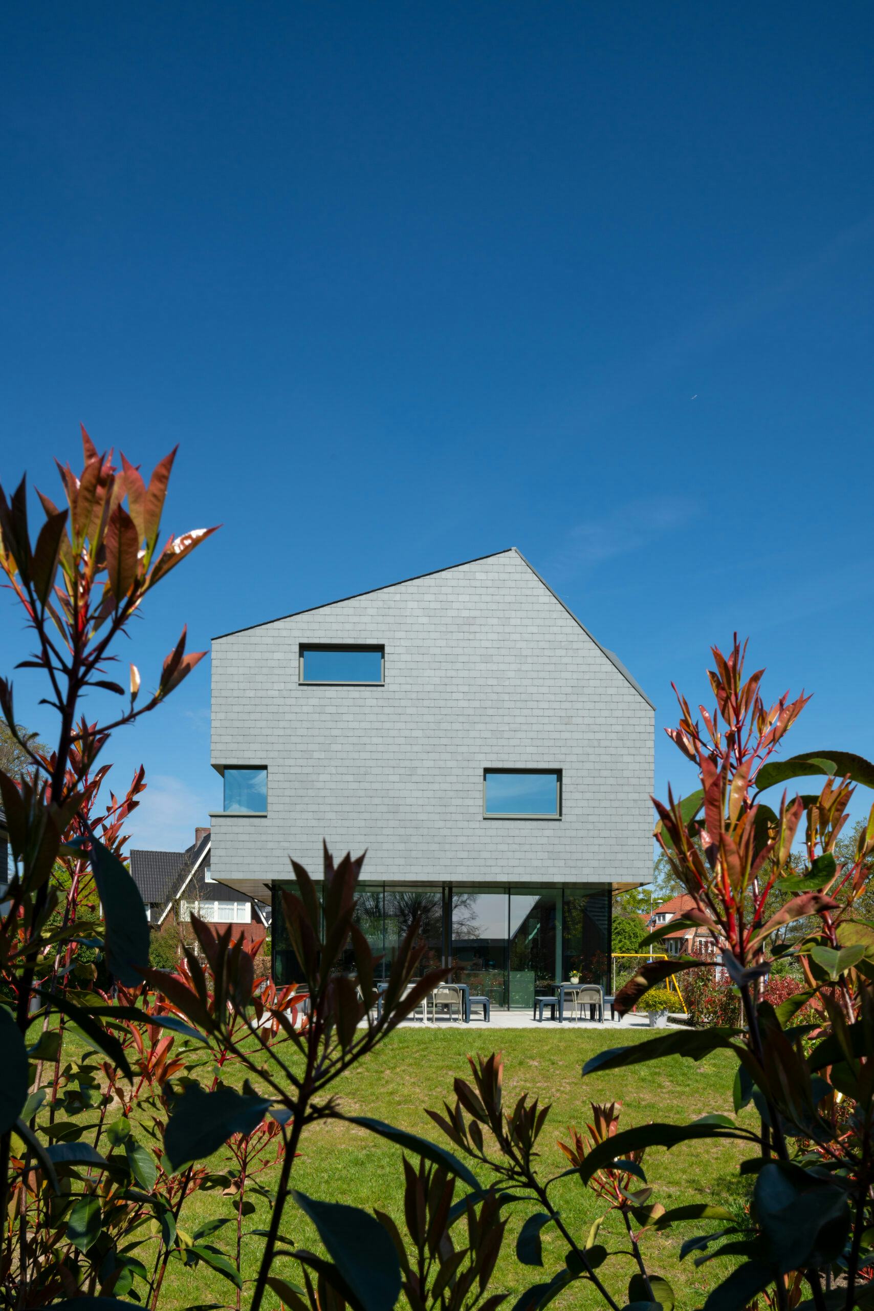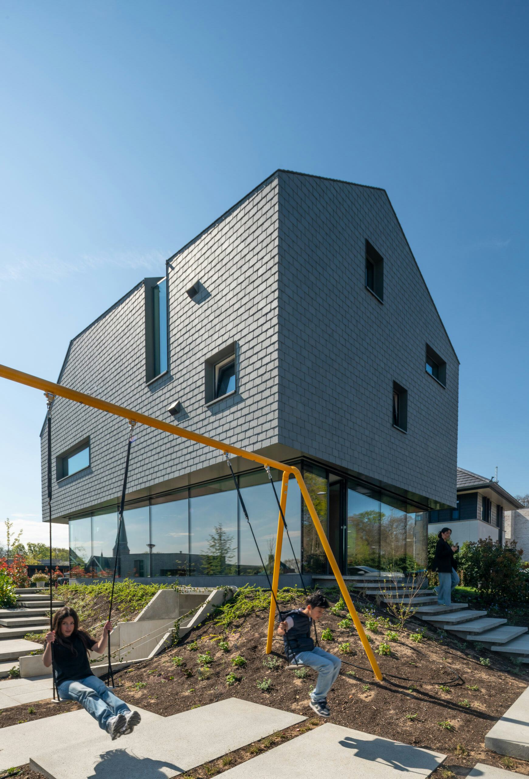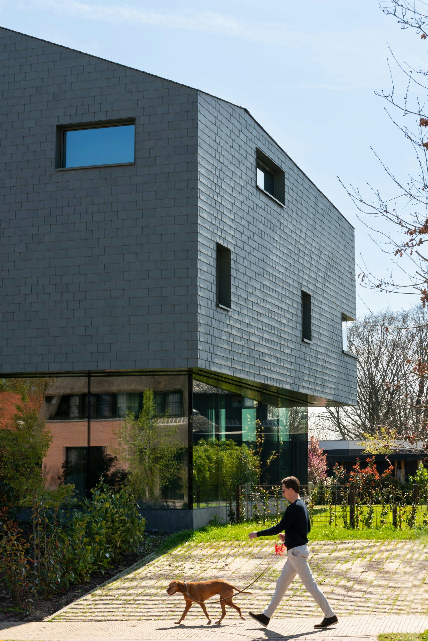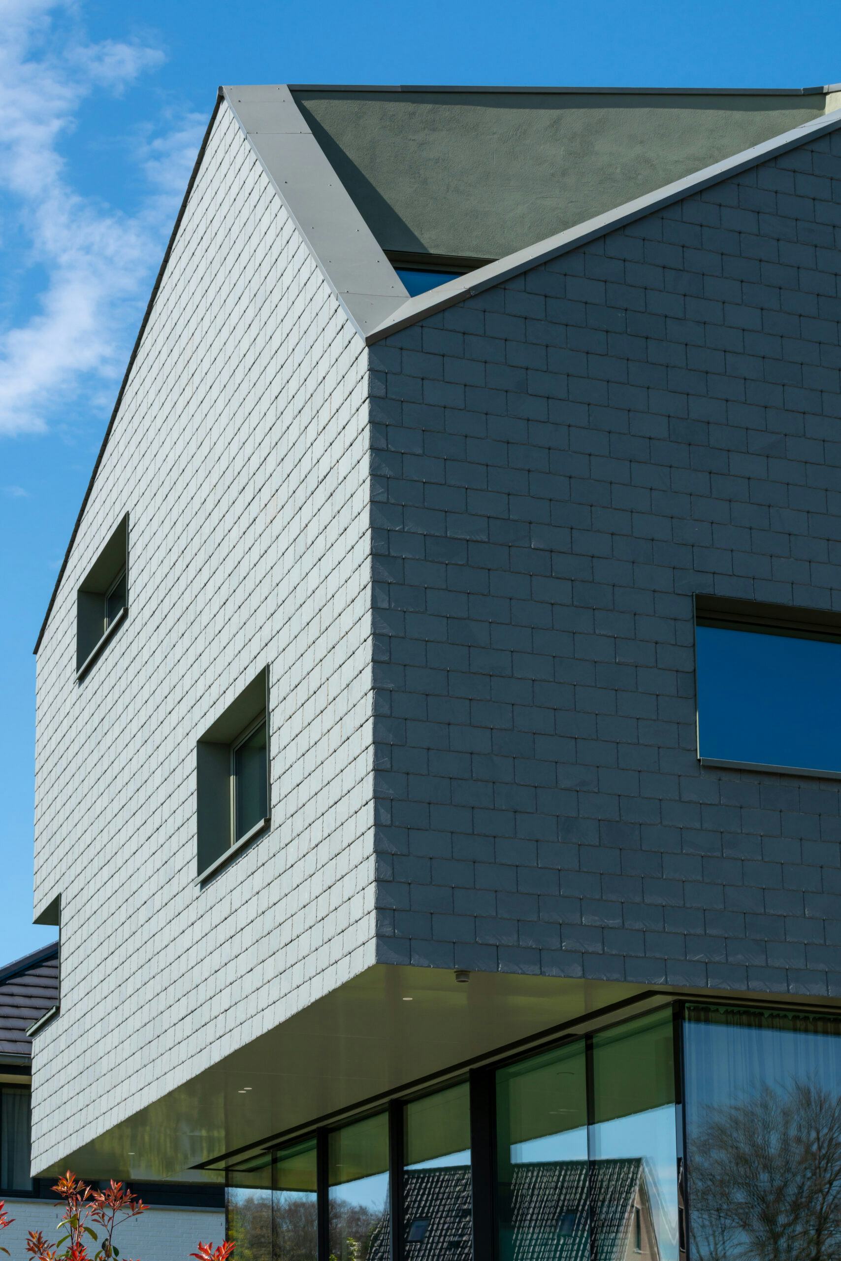 De bovenbouw is volledig bekleed met leisteen, wat het volume intact houdt en door de natuurlijke kleur goed aansluit bij de groene omgeving en tuin. In het leistenen dak zijn zonnepanelen geïntegreerd, waarmee energie wordt opgewekt. Op de betonnen kelder zijn twee bouwlagen volledig in hout uitgevoerd.