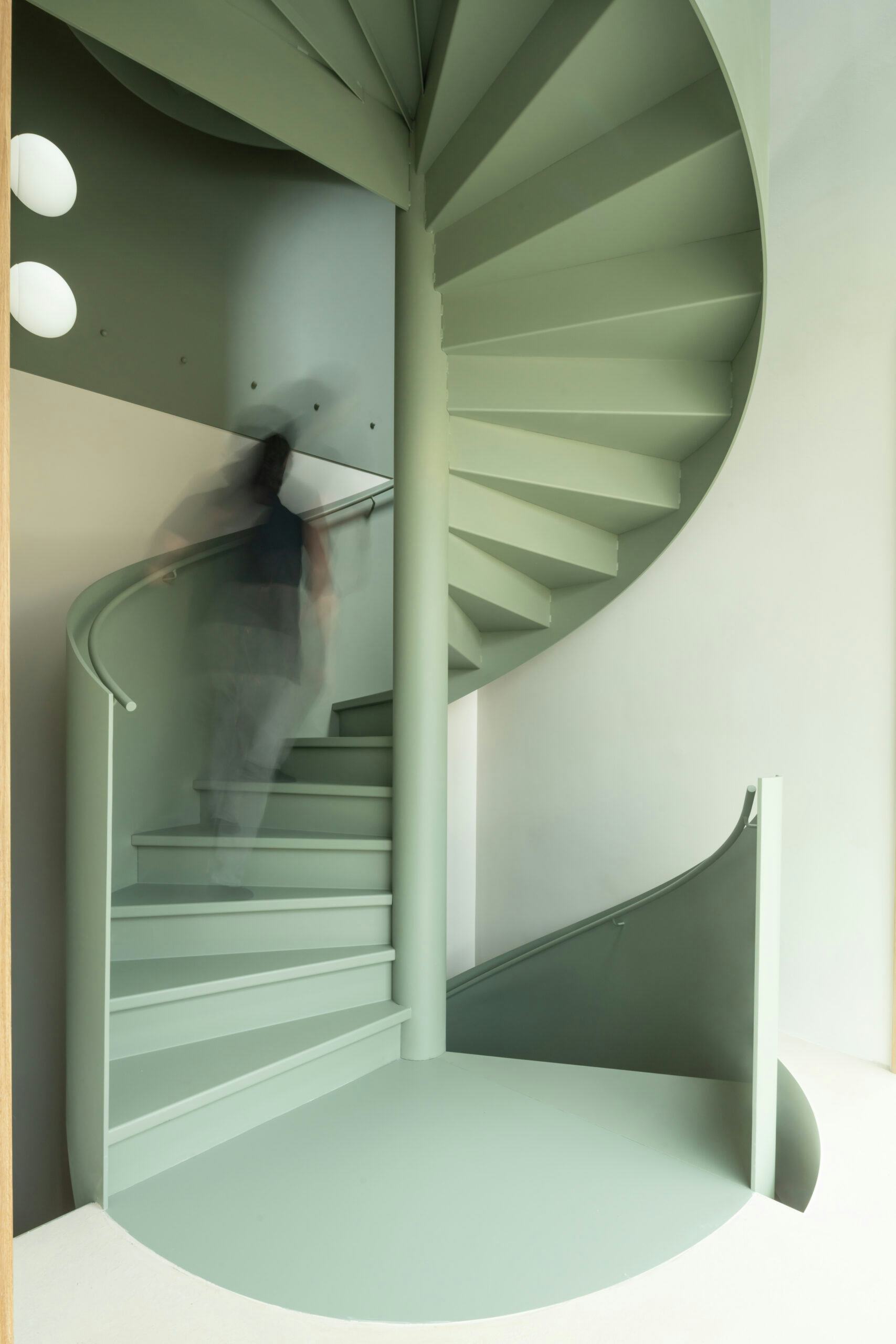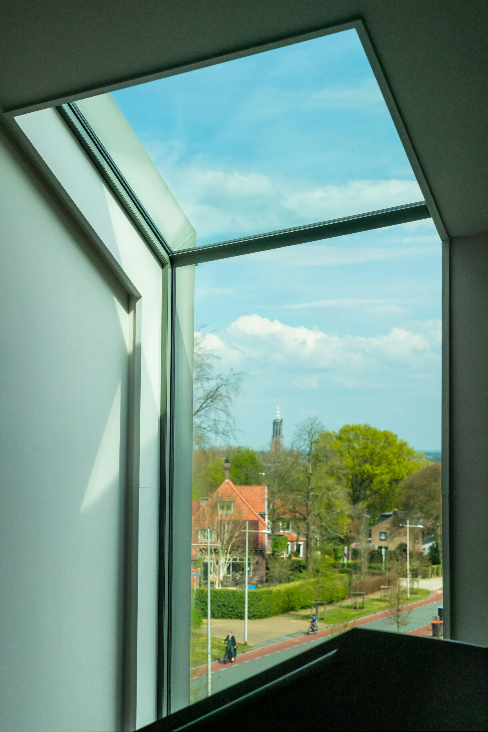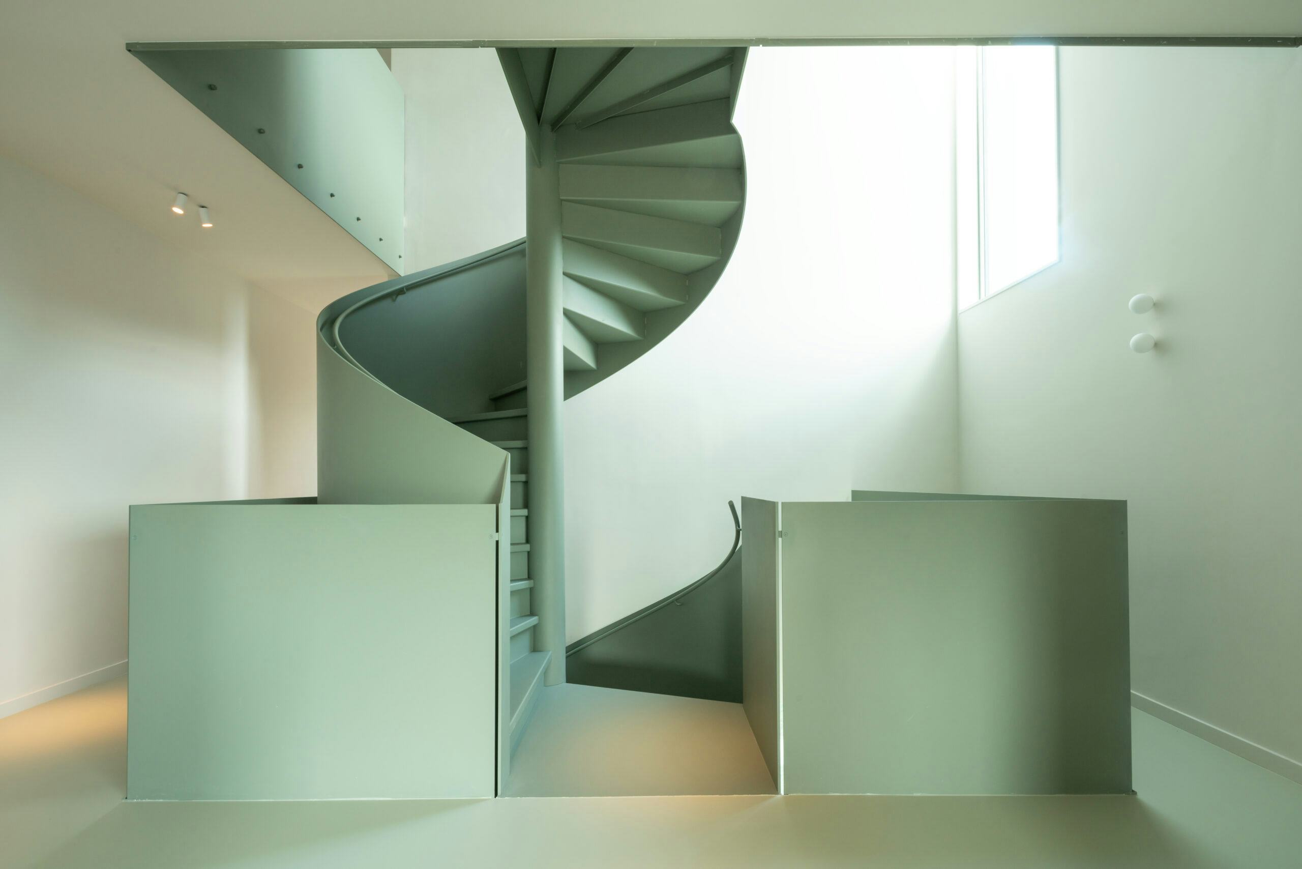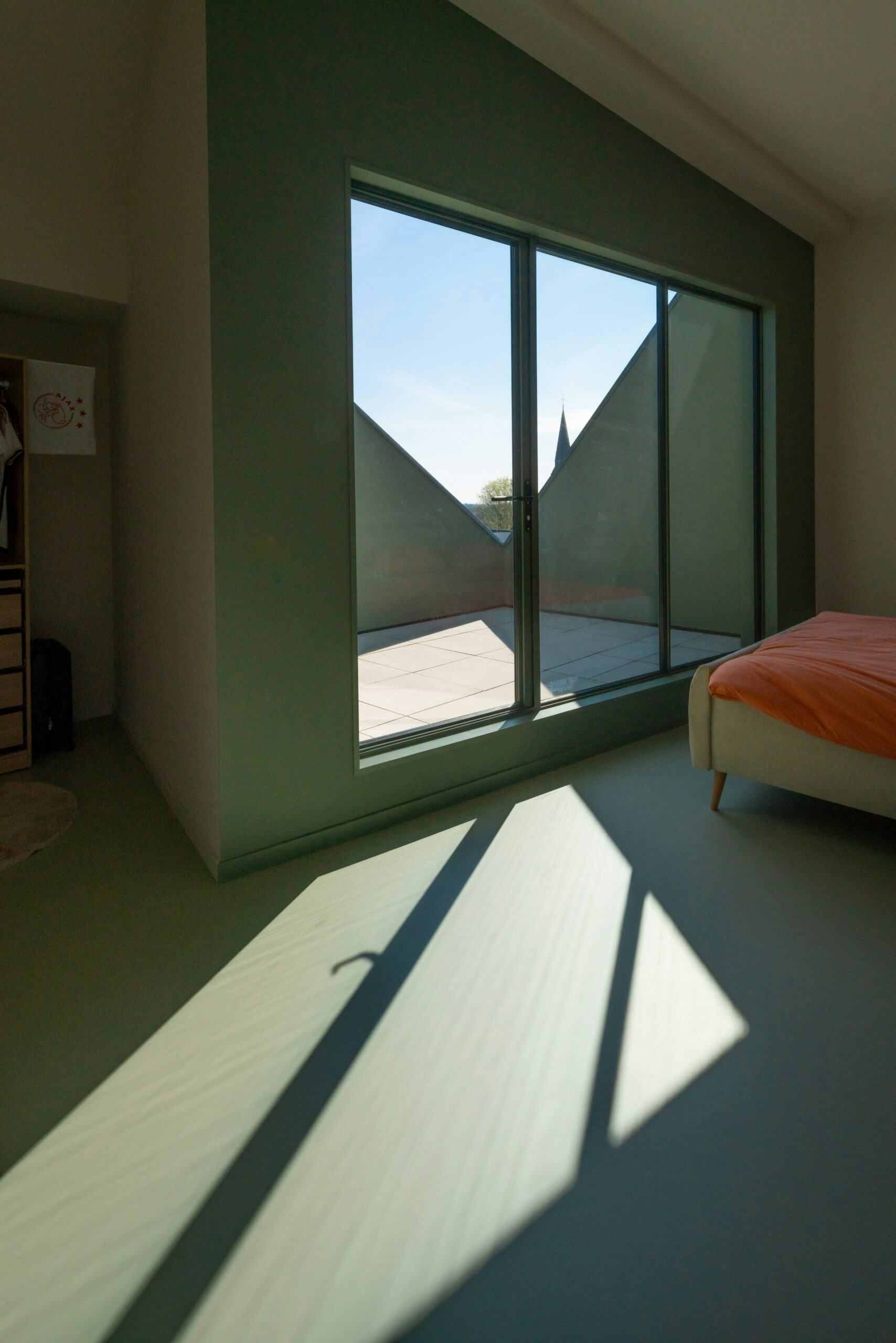 Het huis telt vier bouwlagen met een overzichtelijke indeling. De begane grond huisvest woonkamer, eetkamer en open keuken rondom een centrale kern die de ruimtes logisch scheidt. Een van buiten zichtbare sculpturale stalen trap in een open vide verbindt alle verdiepingen. De bovenverdiepingen bevatten slaapkamers, kantoor en sanitair, waar doordachte openingen geborgenheid bieden terwijl ze tegelijk een gekaderd uitzicht bieden op de stad, het groen en de omgeving; als schilderijen.