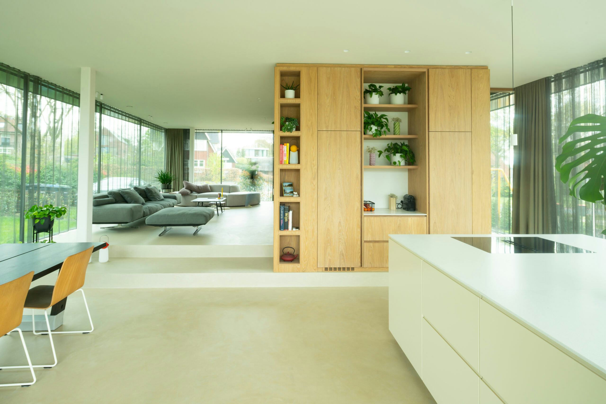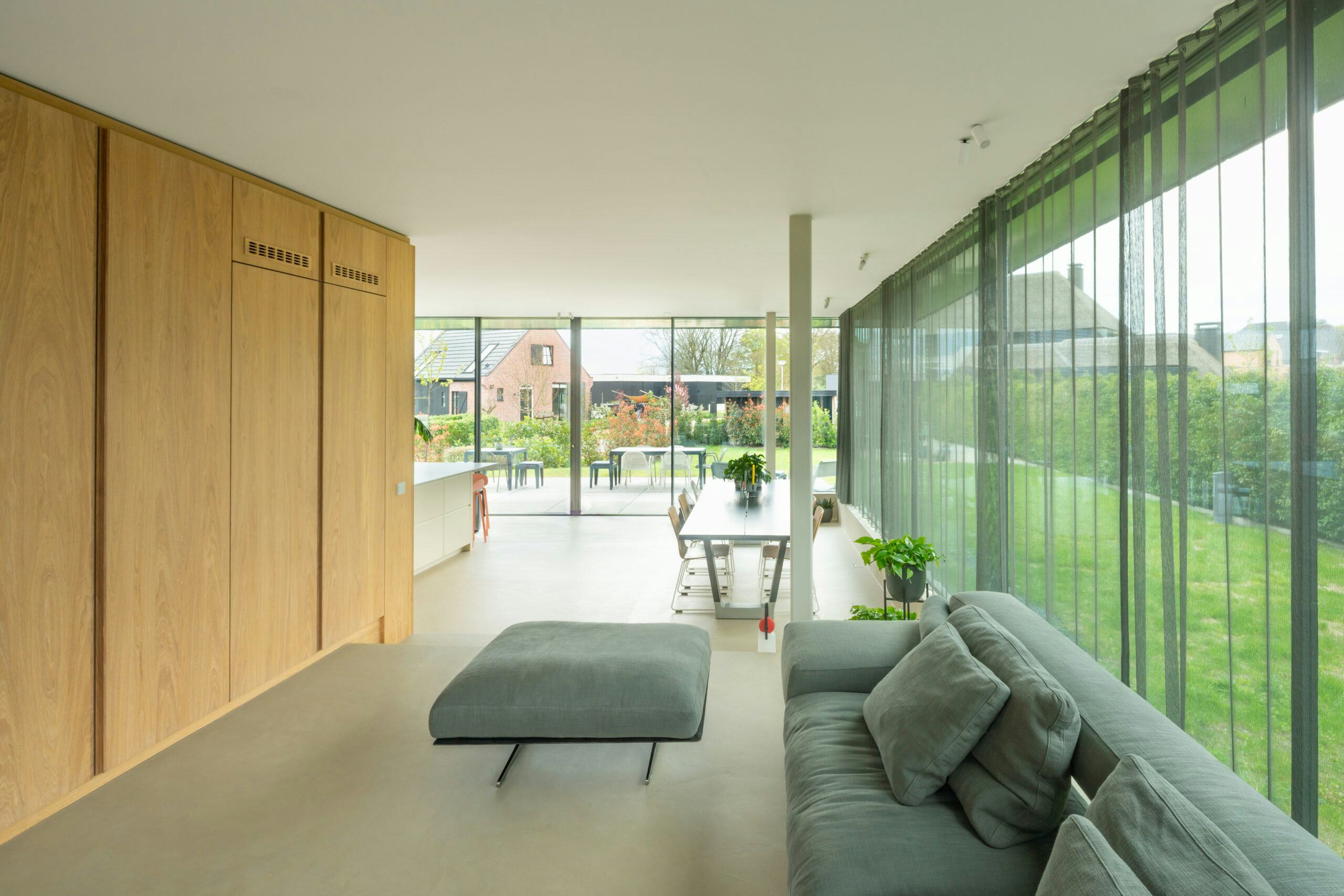 Dit project maximaliseert de beschikbare ruimte door slim gebruik van het perceel. Door een kelder en meerdere verdiepingen te integreren, wordt de hoogte optimaal benut terwijl de grondoppervlakte minimaal blijft, met bewust veel ruimte voor natuurlijke biodiversiteit. De glazen plint dient meer dan een esthetisch doel: het creëert een naadloze overgang tussen interieur en exterieur. Deze transparante grens zorgt voor een vloeiende verbinding, waardoor binnen- en buitenruimte in elkaar overlopen