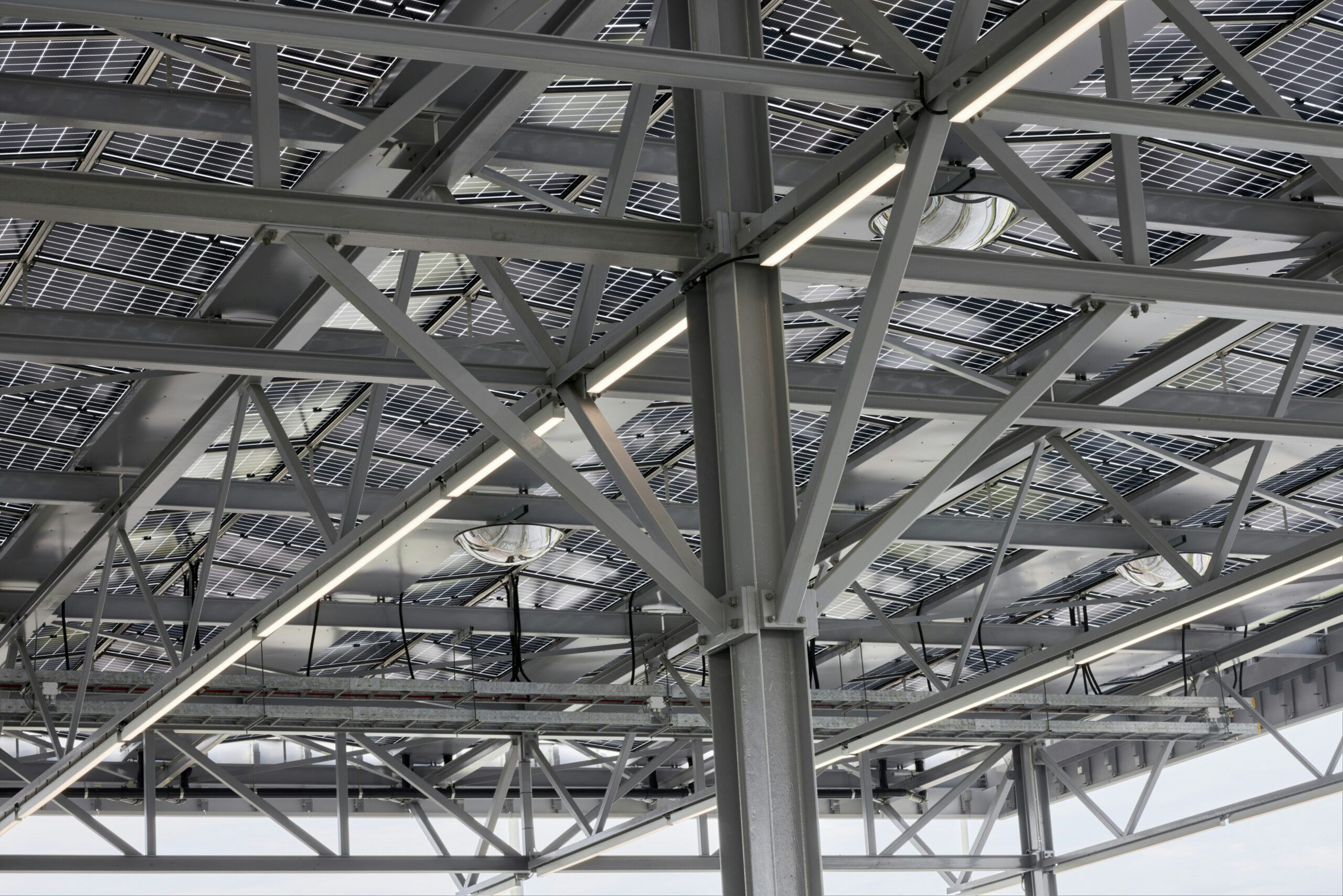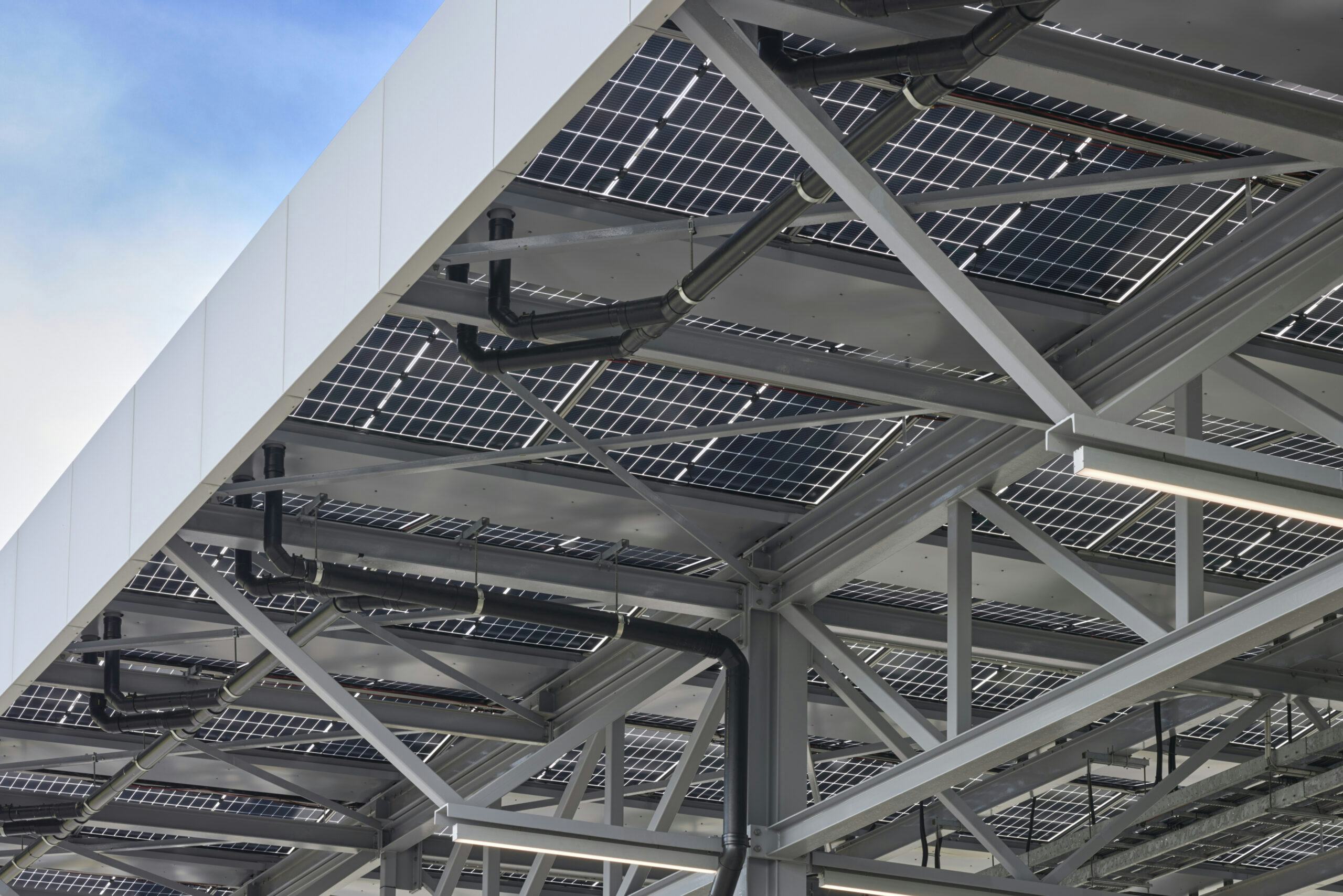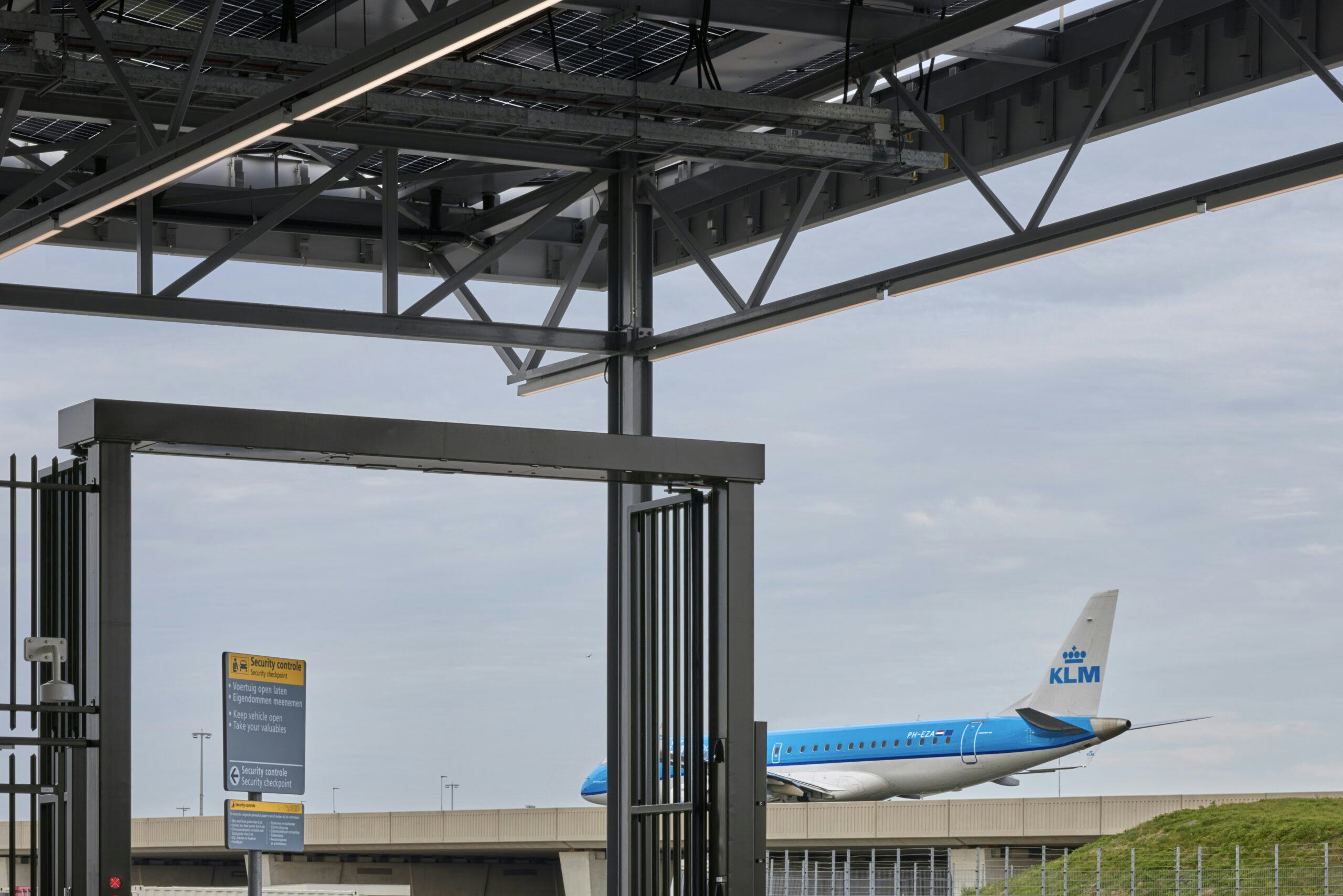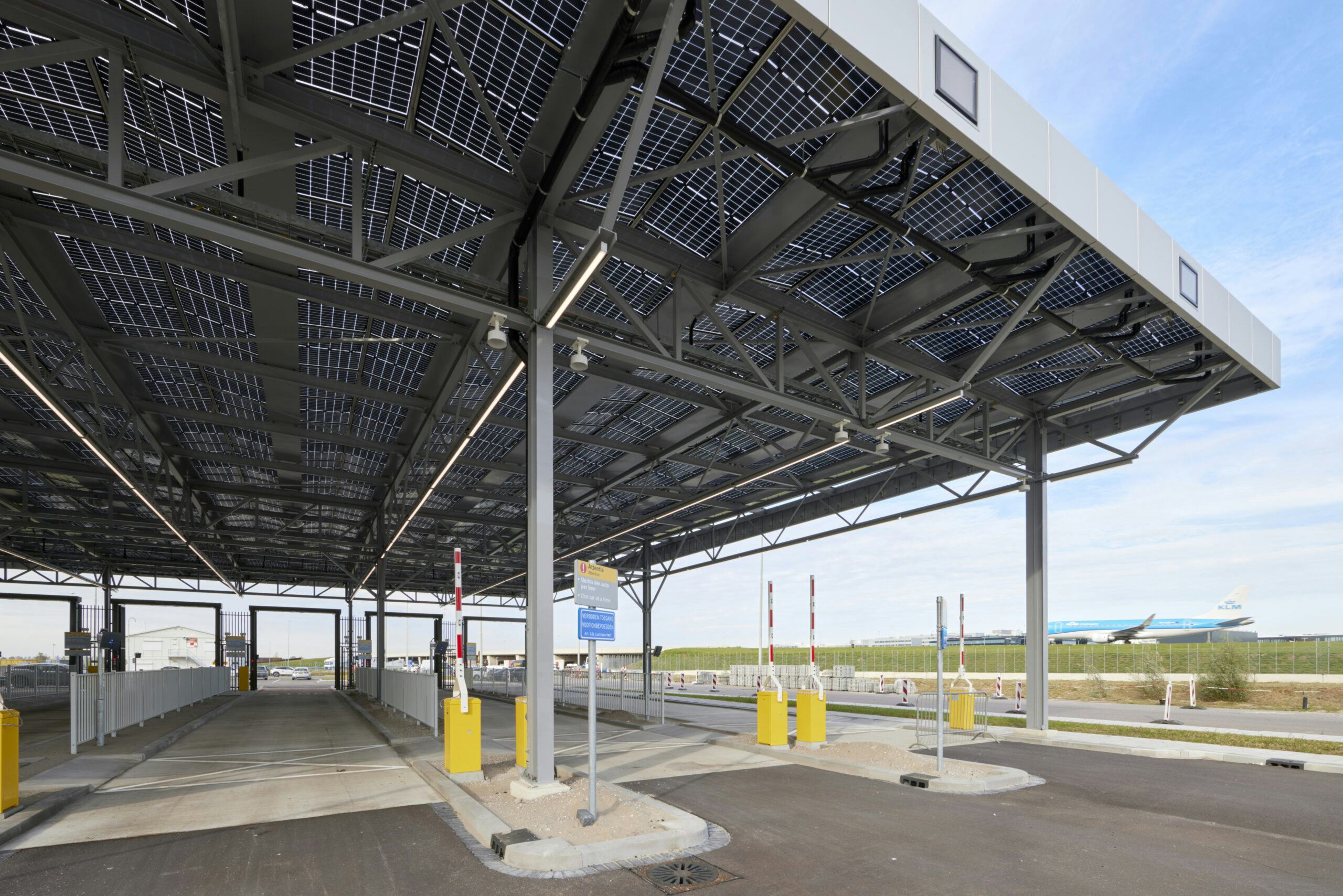 Het projectteam ontwikkelde twee circulaire varianten, waarbij Schiphol koos voor een combinatie van urban mining en biobased bouwen. Hergebruikte stalen liggers vormen de overkapping, terwijl de securityloge uit houtskeletbouw en CLT bestaat. De luifel met bifacial zonnepanelen dient als dak en wekt energie op. Dankzij een slim, demontabel ontwerp is DLP-90 toekomstbestendig en flexibel inzetbaar.