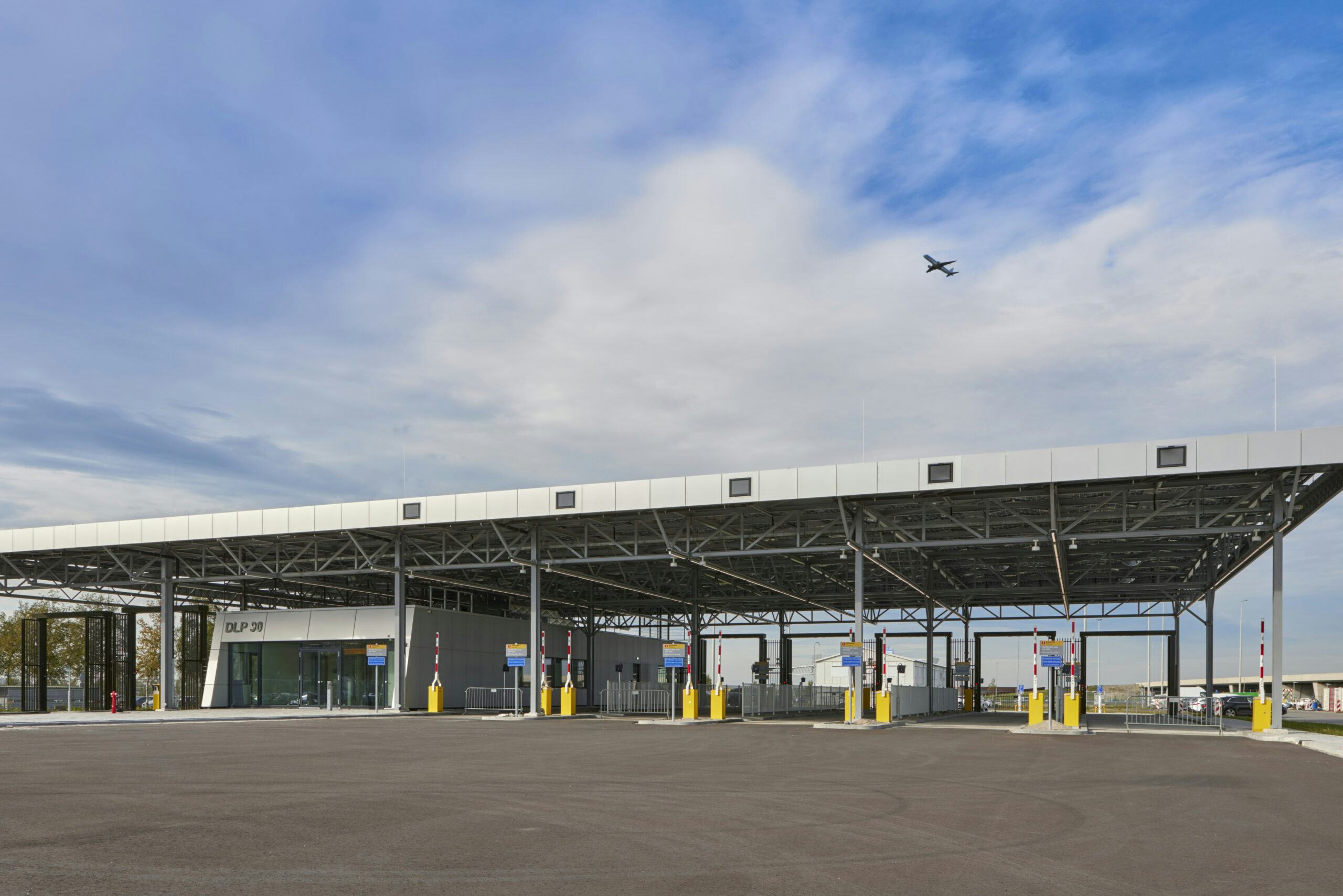 De constructie van DLP-90 is deels opgebouwd uit donorstaal, afkomstig van gesloopte gebouwen op Schiphol. Dit bespaart grondstoffen en verlaagt de CO₂-uitstoot. De securityloge is gemaakt van houtskeletbouw en CLT, beide biobased en demontabel. De luifel bestaat uit 910 bifacial zonnepanelen die functioneren als dak, waardoor materiaal wordt bespaard en energie wordt opgewekt.
