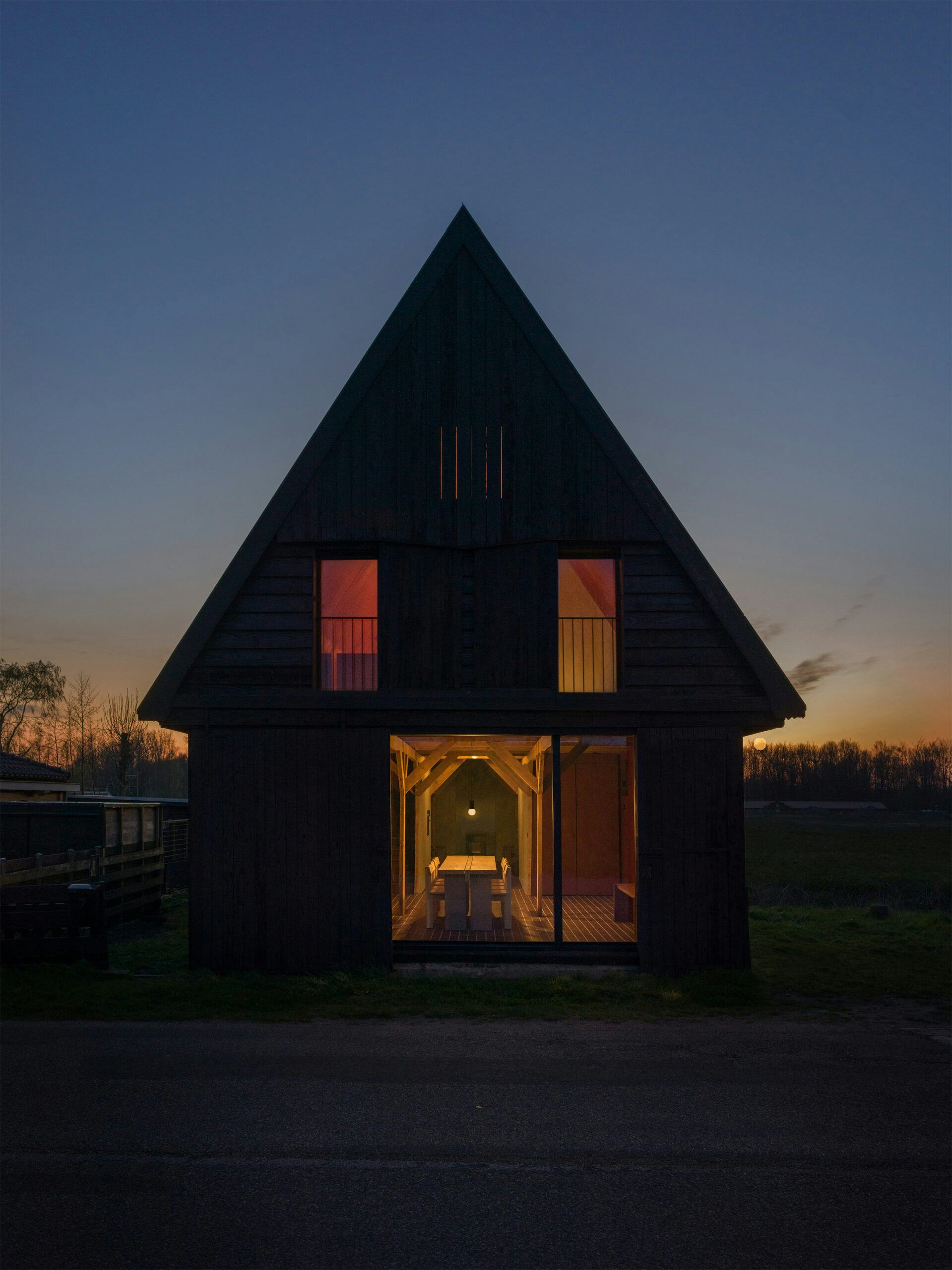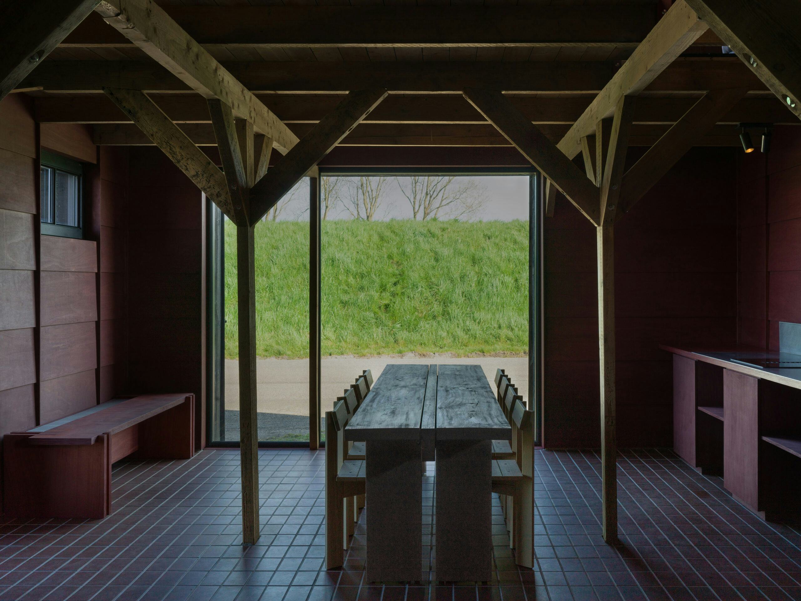 De architectuur verkent hergebruik op verschillende schalen, van hele gebouwdelen, via lokaal gevonden materialen en objecten tot subtiele ontwerpcitaten. Zo komt bijv. de belijning van de gevel terug in het interieur en is nieuw hout behandeld met natuurlijke lijnolie in historische kleurstellingen. De houten structuur is volledig behouden, de vlas isolatie is gevat in hergebruikte houten beplating, de vloeren zijn van regionaal sloophout, de schouw is bekleed met een restpartij marmer.