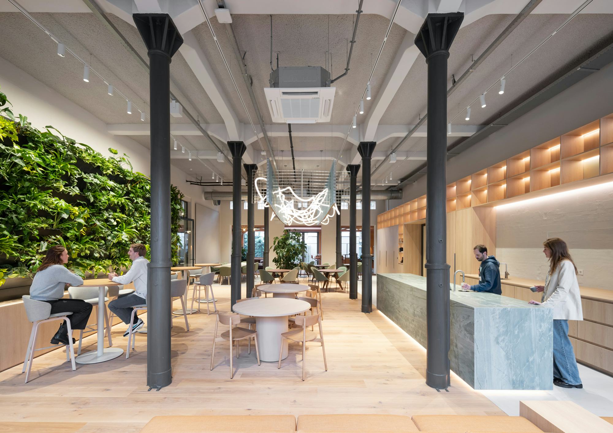 Een prachtige uitdaging was om de identiteit van het jonge en snelgroeiende Rewire te vangen en te vertalen in een ruimtelijk ontwerp en interieur. Waar branding gericht is op communicatie moet een interieur persoonlijkheid en karakter uitstralen. Het intensieve ontwerp onderzoek naar het ‘nieuwe thuis’ van Rewire heeft geleid tot een inclusieve en onderscheidende werkomgeving waar gasten zich welkom voelen en medewerkers de ruimte voelen om zichzelf te kunnen zijn.