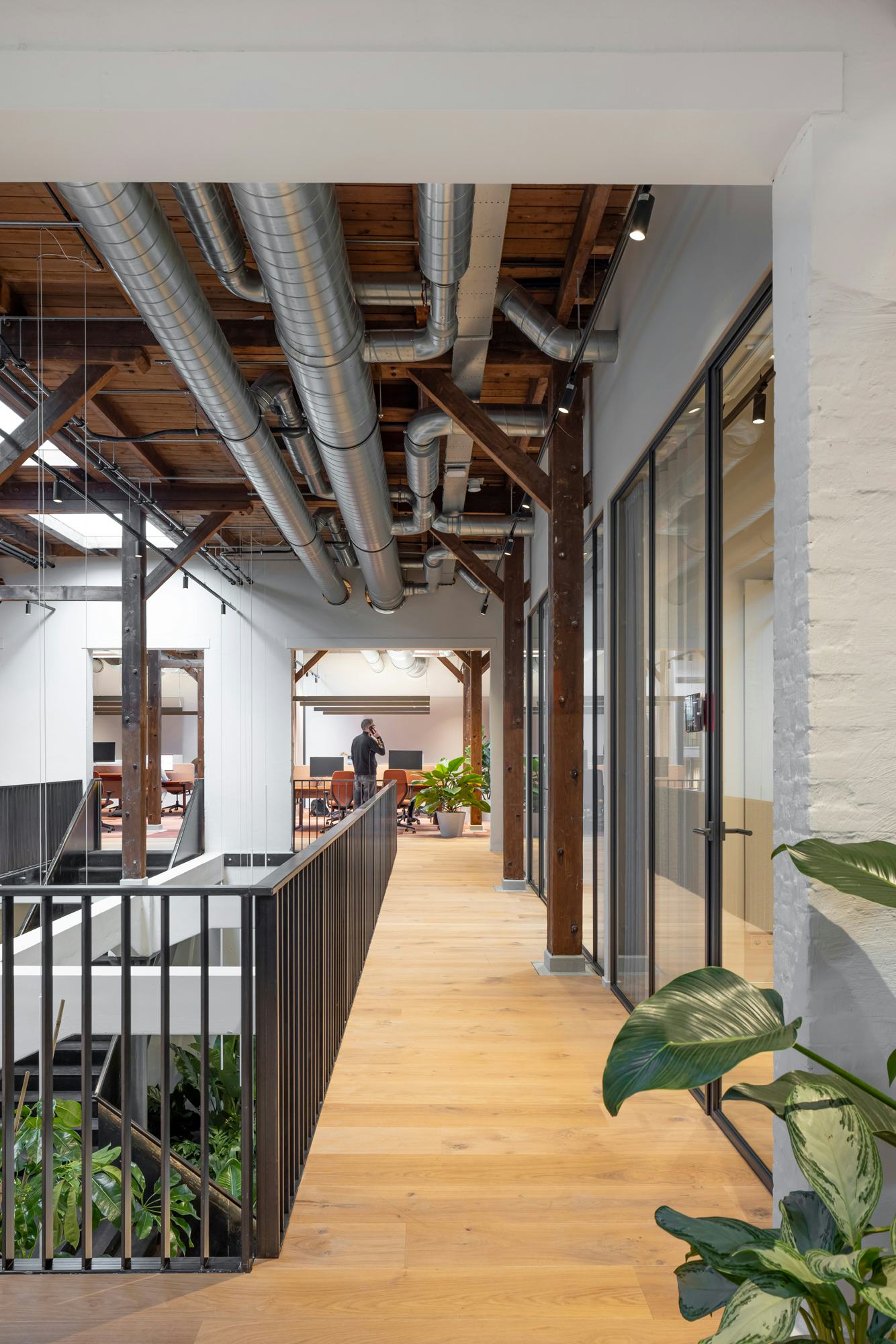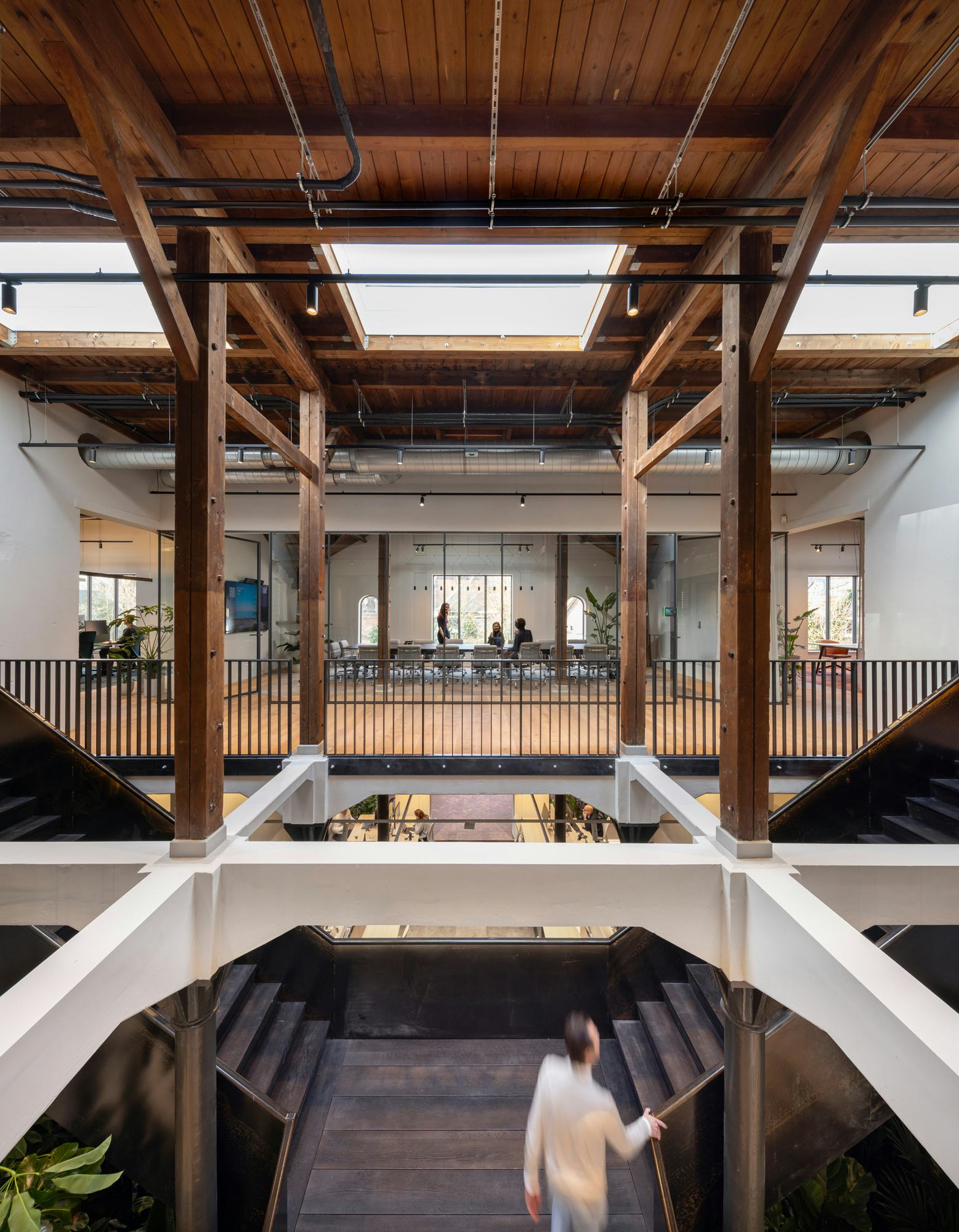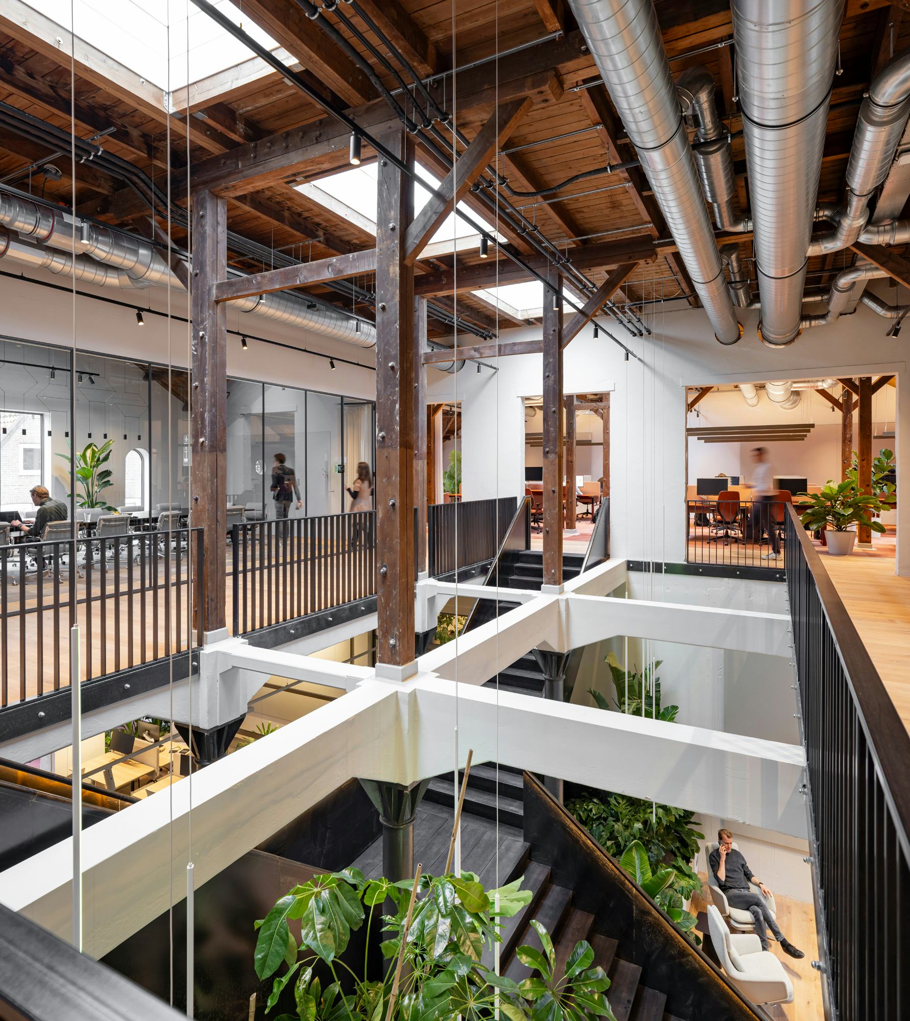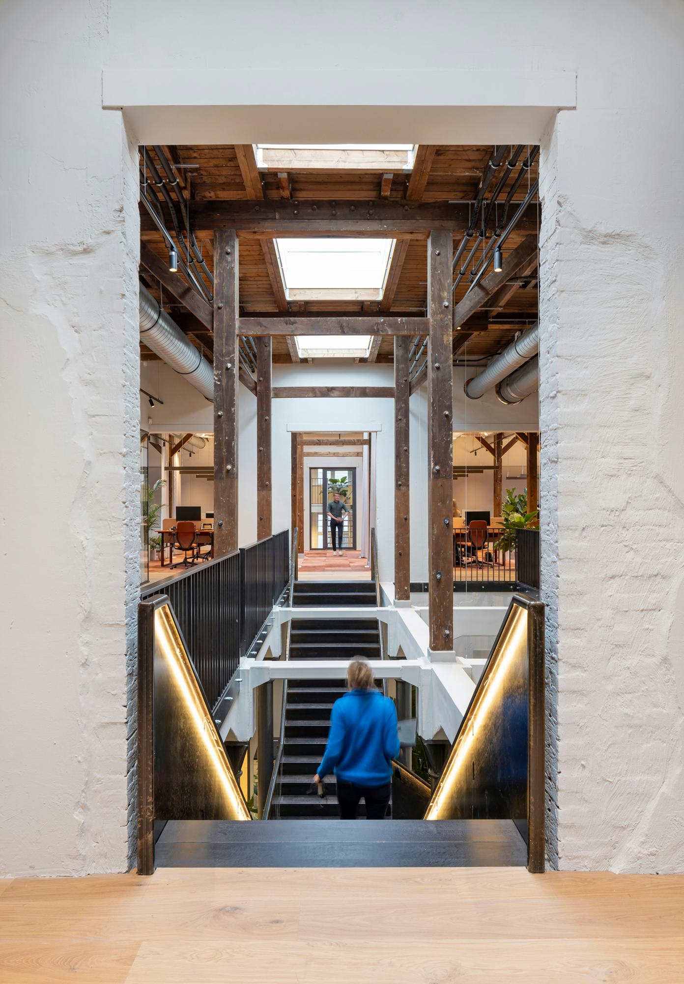 De verdiepingen verschillen sterk in karakter; op de 5m hoge BG dragen zware gemetselde muren en gietijzeren kolommen de betonnen vloer van de bovenverdieping, waar houten kolommen de houten dakconstructie ondersteunen. Door nieuwe materialen en kleuren hierop af te stemmen voelt de BG meer neutraal en contrastrijk en ligt de nadruk op dynamiek, maar biedt de verdieping warmte en geborgenheid. Het pand behoudt zijn geschiedenis; de littekens worden gekoesterd, de constructie wordt blootgelegd.