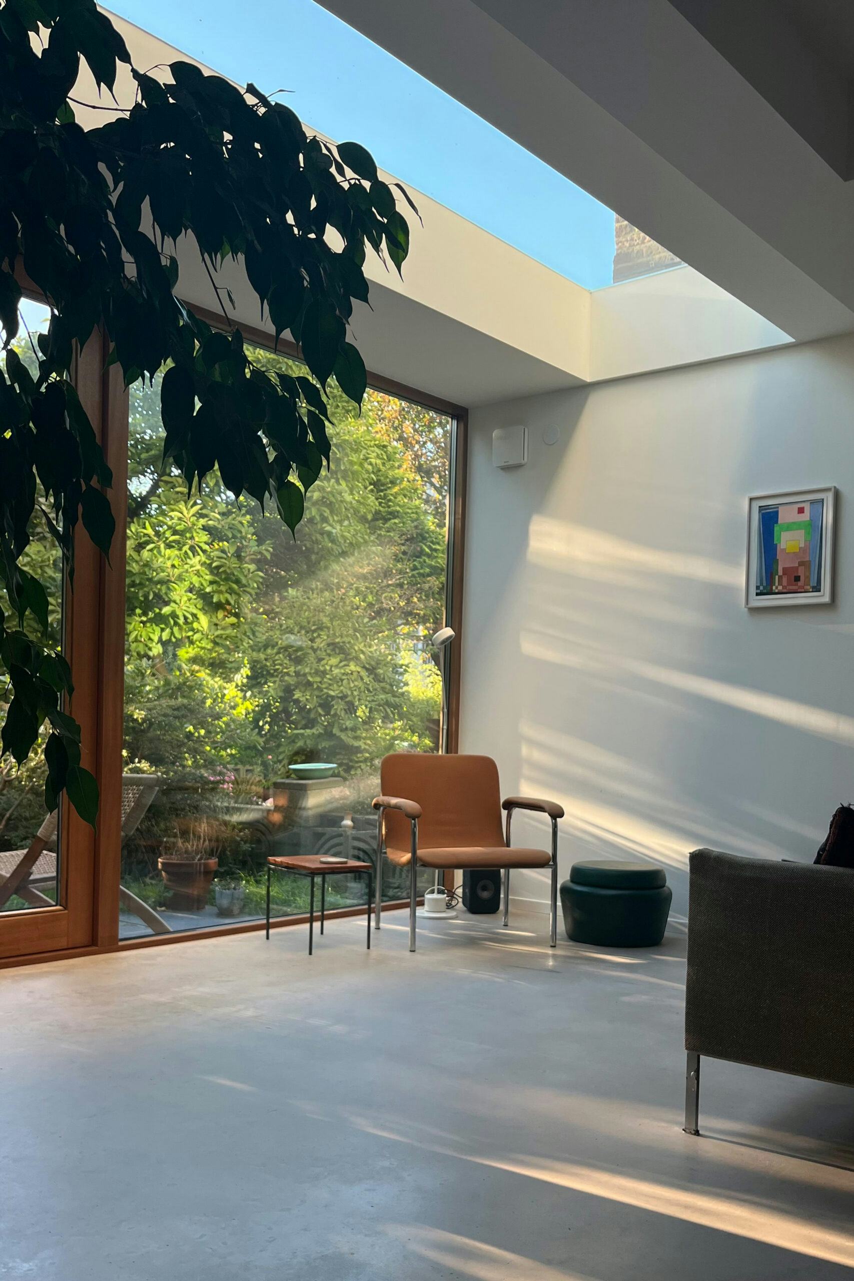 Een groot daklicht, nieuwe zichtlijnen en proportioneel ontworpen kozijnen verbinden ruimtes op een vanzelfsprekende manier. Binnen- en buitenruimte vloeien in elkaar over, met zicht op een tuin die opnieuw in aangroei is – zonder het huis zijn menselijke schaal te ontnemen.