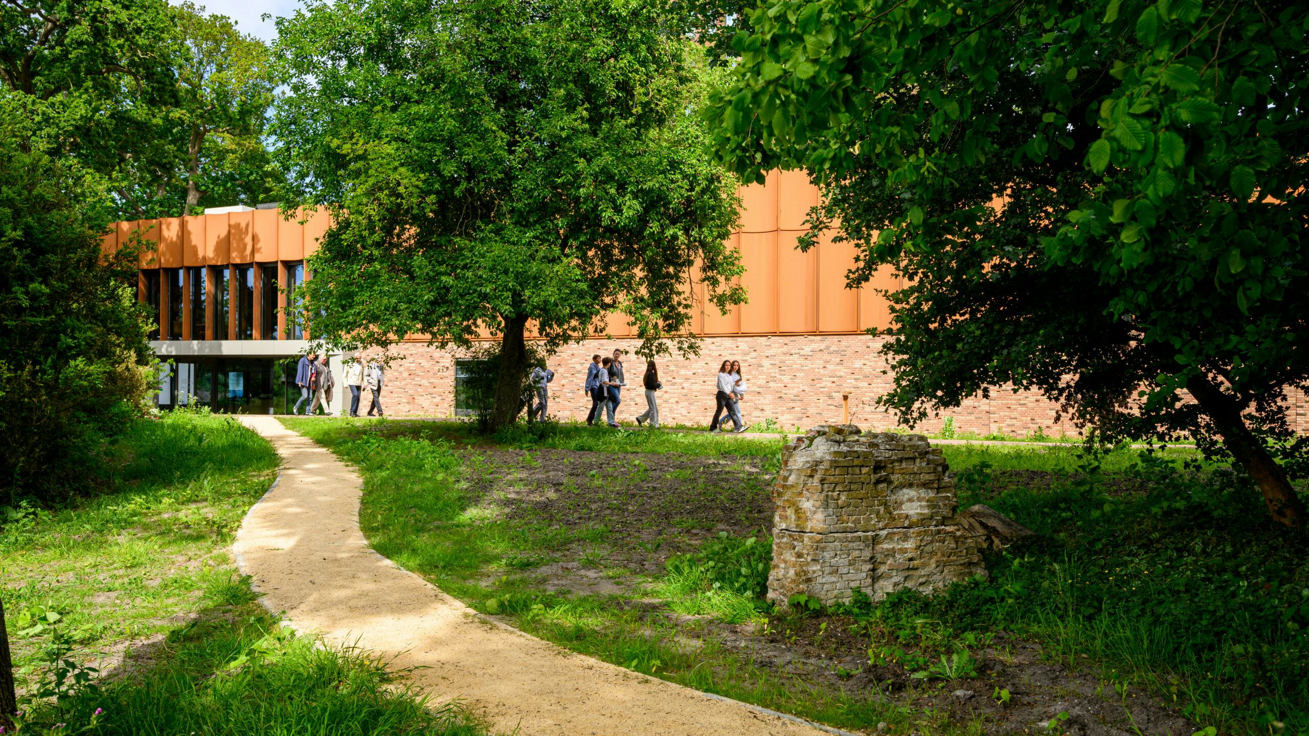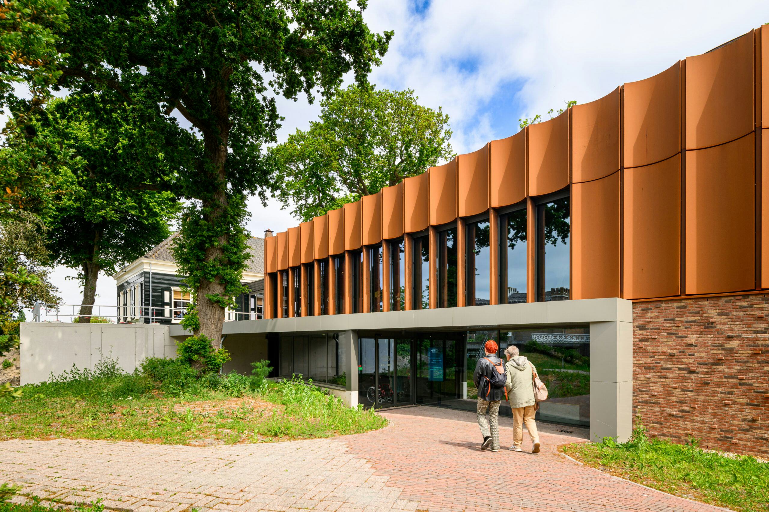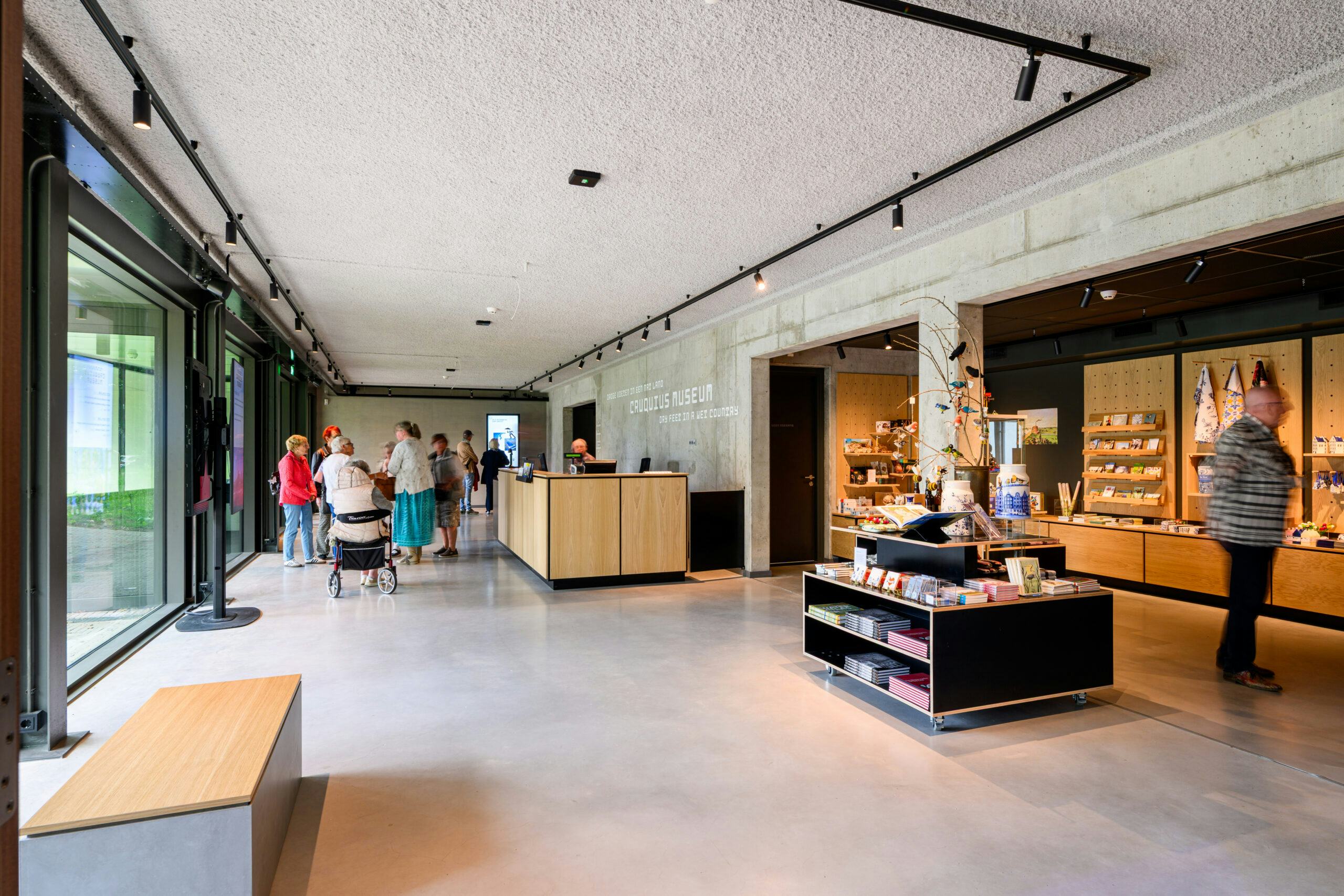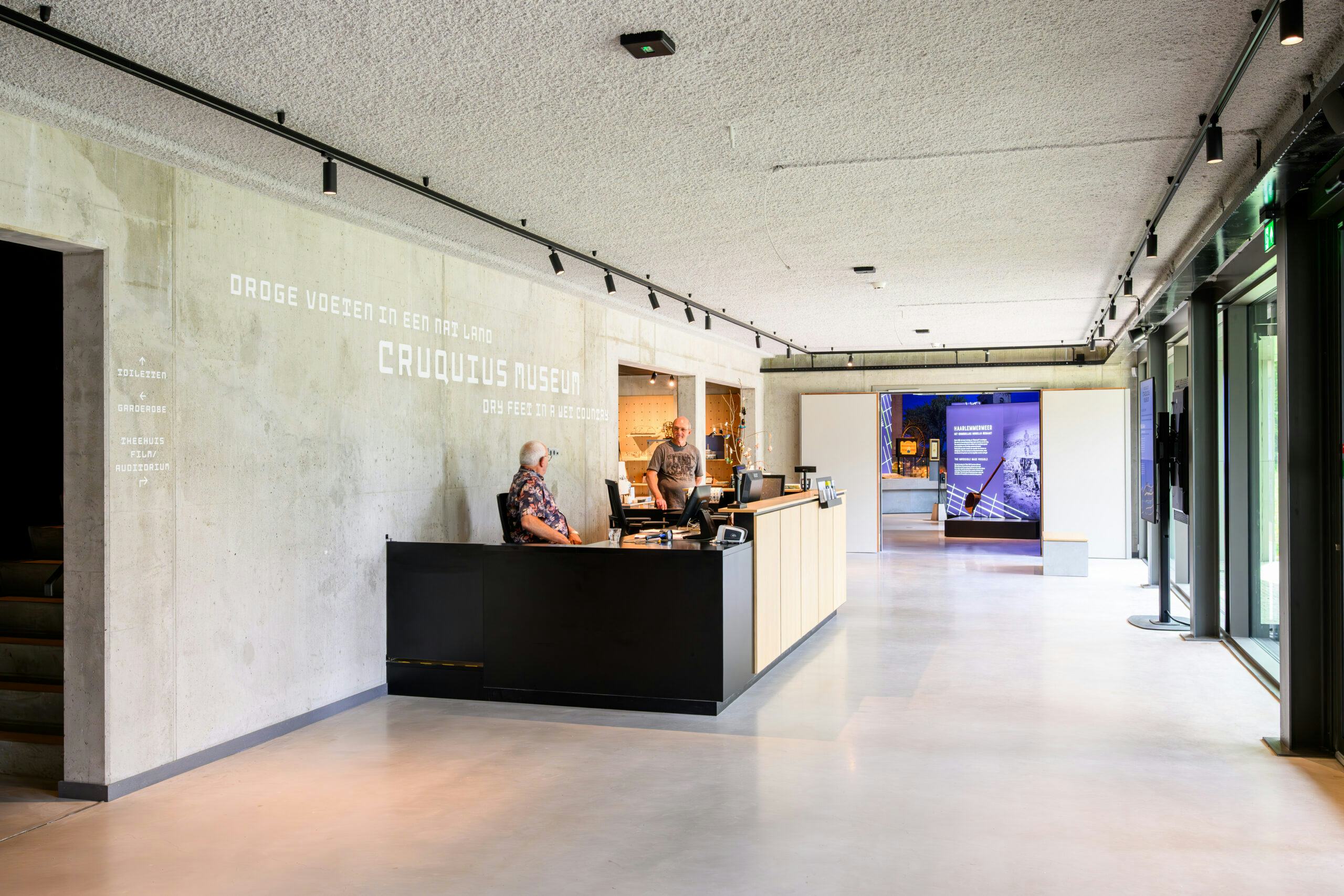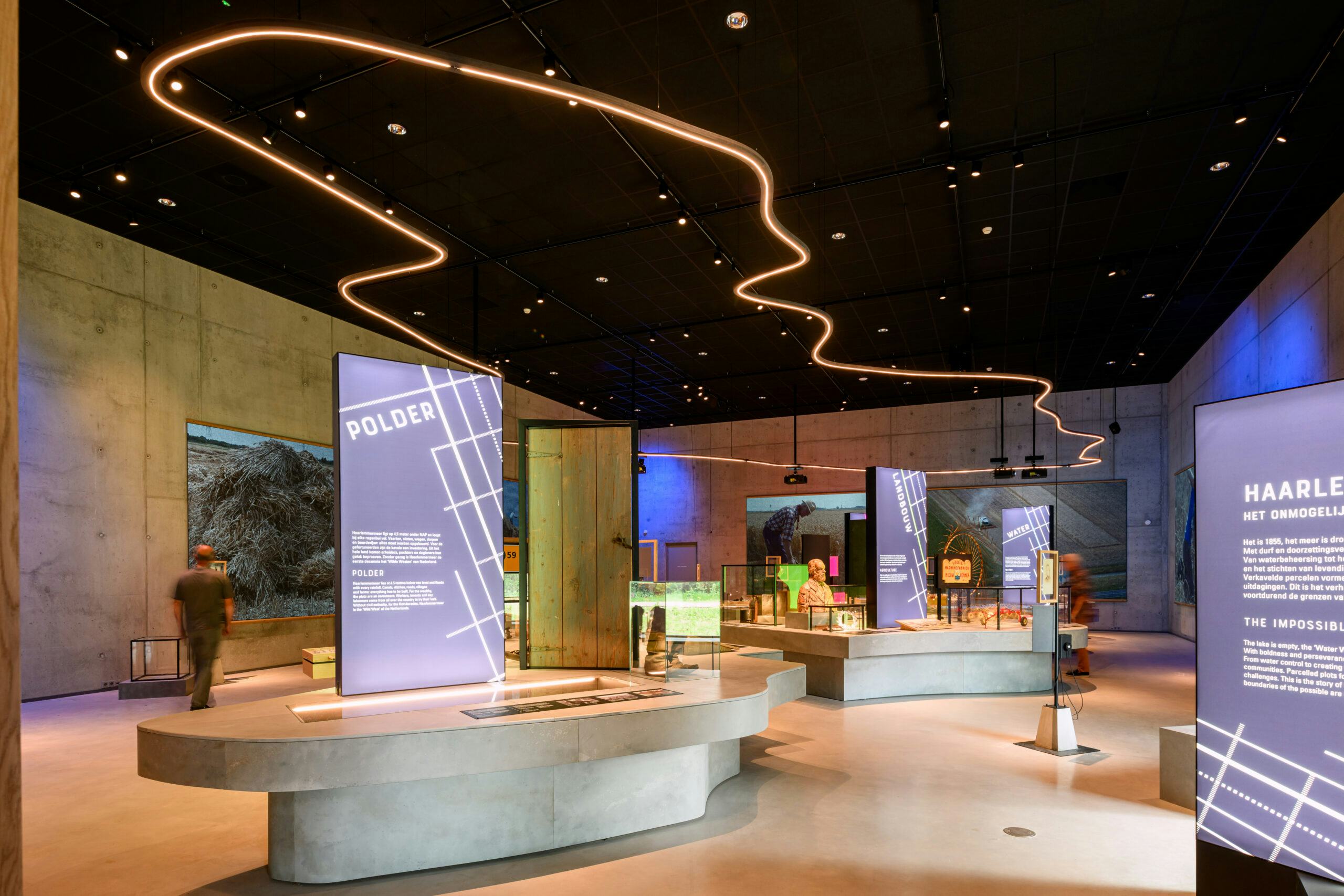 De museumroute volgt het natuurlijke hoogteverschil van dijk naar polder. Bezoekers betreden het paviljoen via een grashelling en komen binnen in een lichte foyer. In de expositieruimte worden thema’s uit de poldergeschiedenis gepresenteerd op grote tafels die samen een plattegrond vormen. De ruimte is flexibel ingericht en ondersteunt het verhaal met projecties, licht en geluid.