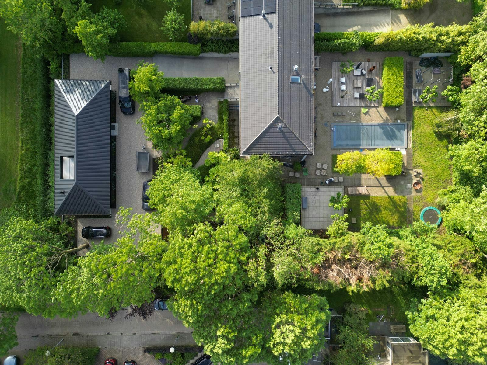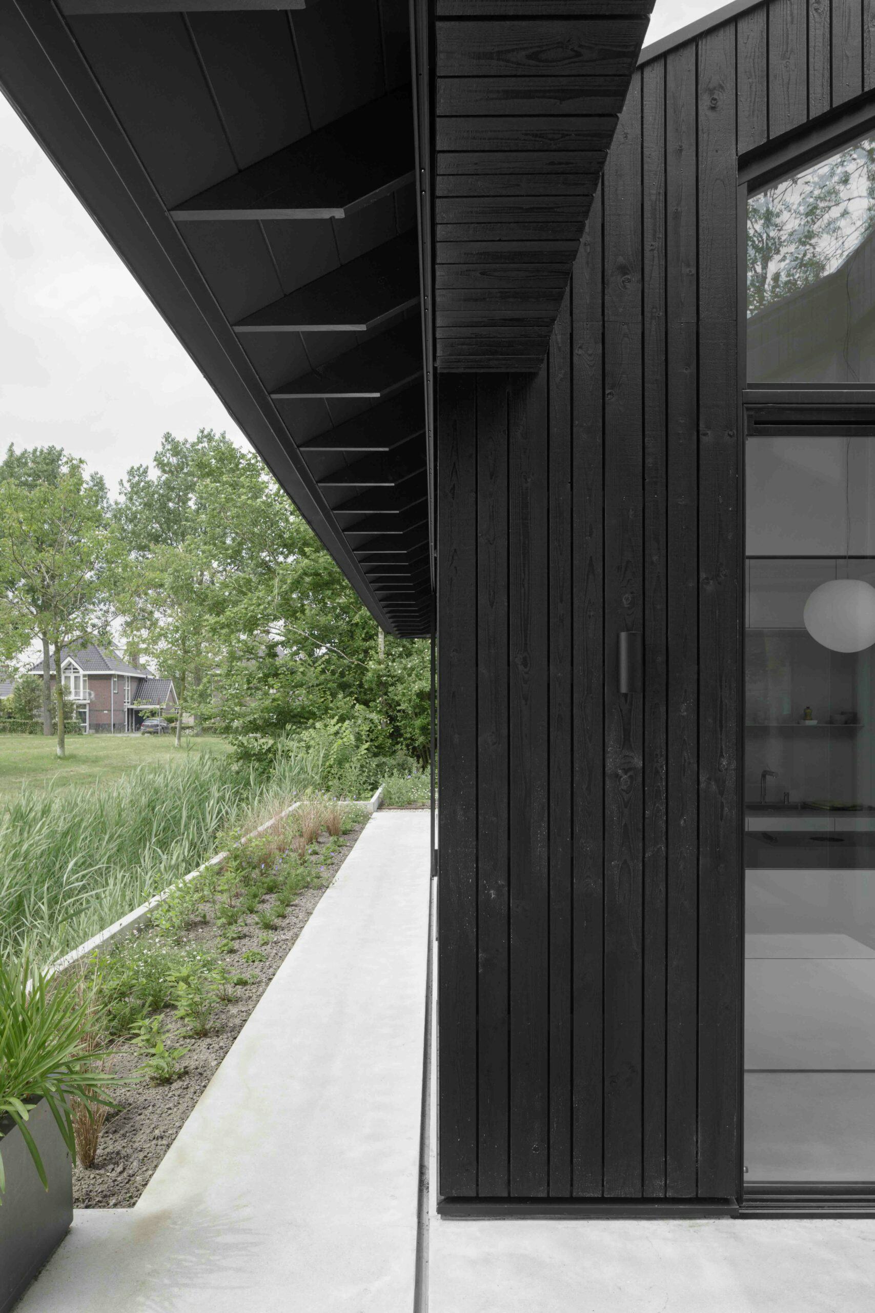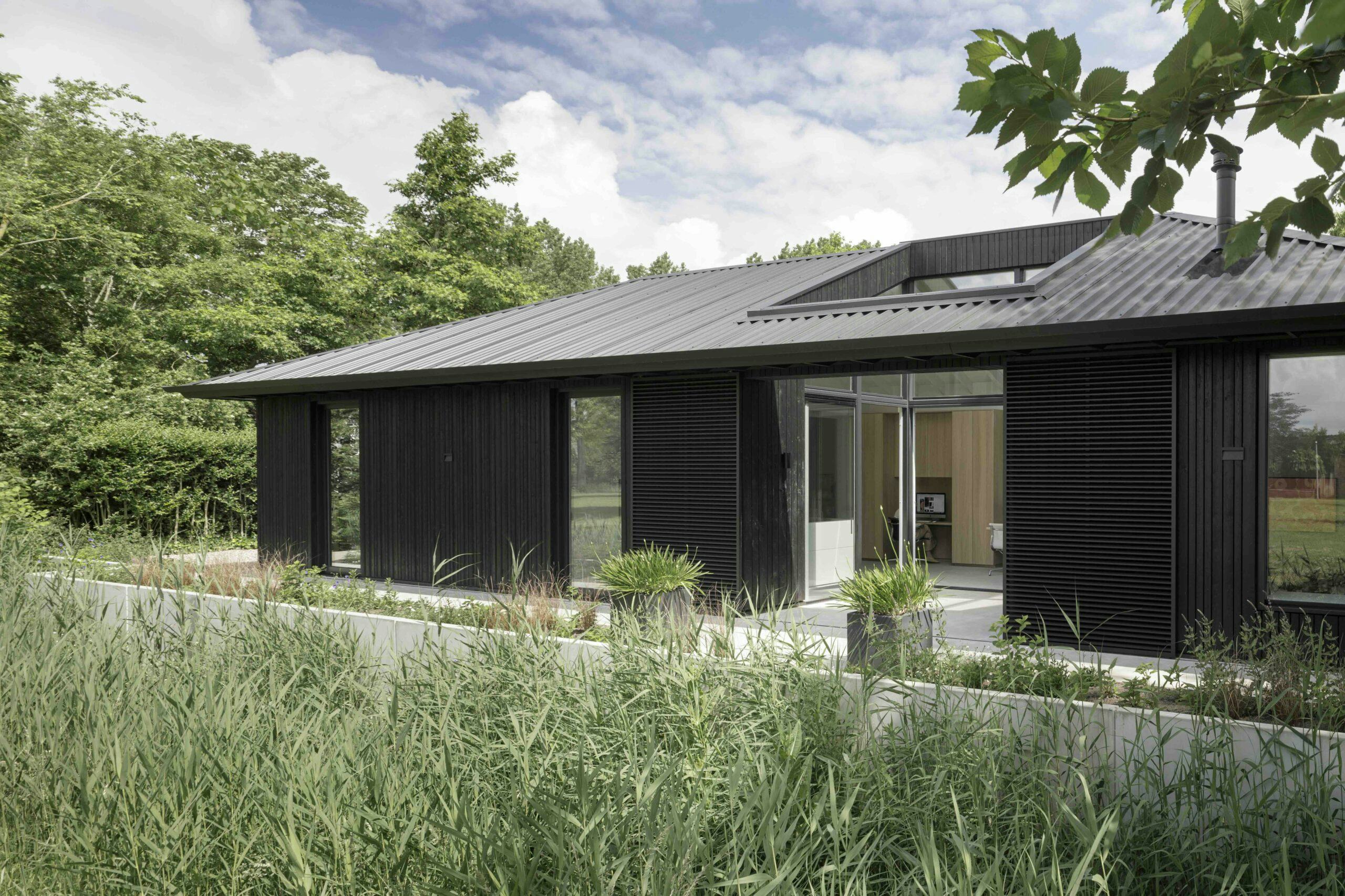 De architectuur is helder en terughoudend. De gevels zijn bekleed met waxed-wood en dragen een kap van sandwichpanelen met geïntegreerde regengoten. De dakconstructie blijft binnen zichtbaar, wat de ruimtelijkheid versterkt. Door de overstekken ontstaat een beschutte loopzone rondom het huis, die de woning visueel verbindt met de groene omgeving.