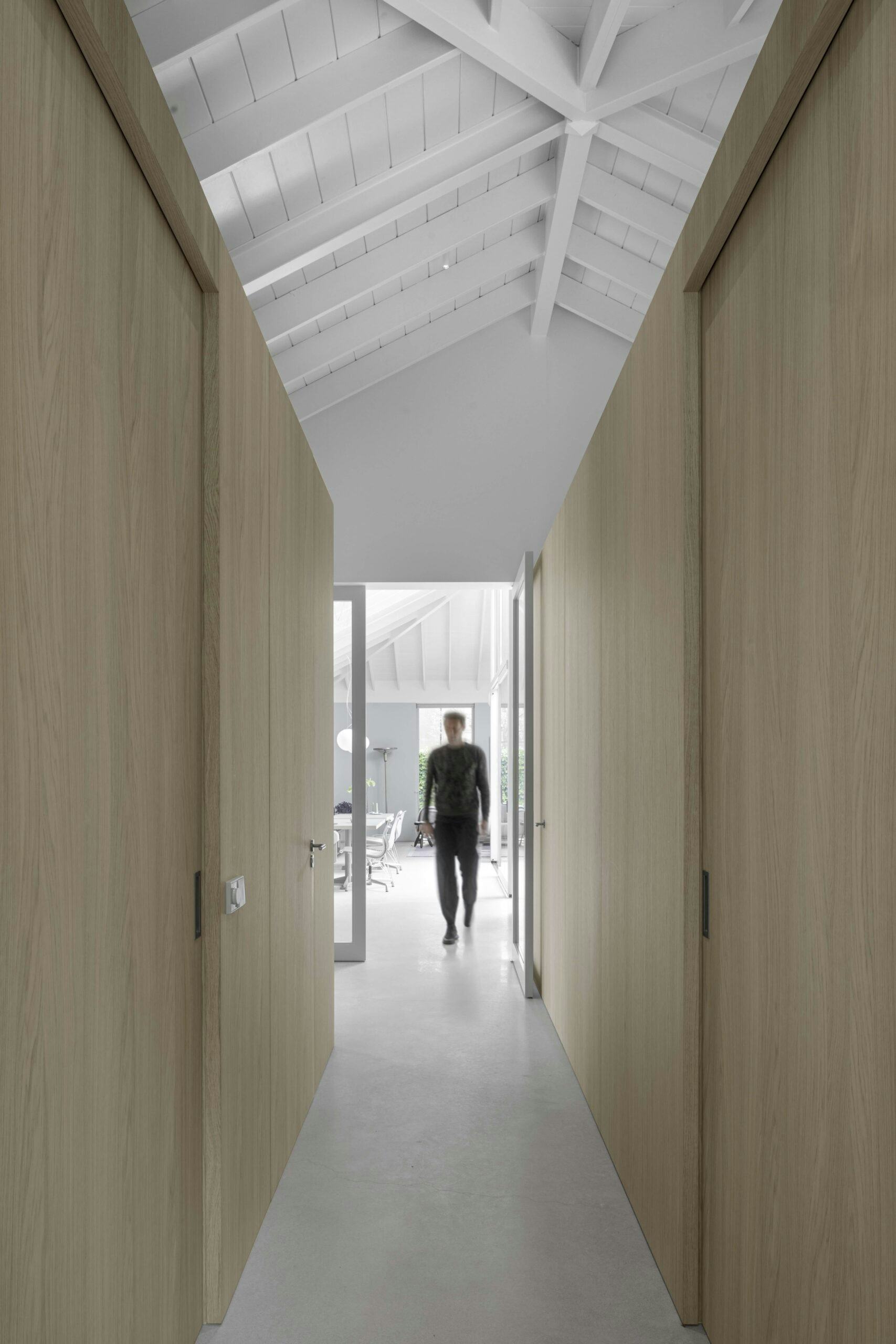 Binnen zijn architectuur en interieur op elkaar afgestemd. Het gebruik van licht eikenhout, een lichtgrijze betonvloer en een witte kap zorgt voor een rustige sfeer. Maatwerkmeubilair en wandafwerking volgen één lijn, waardoor eenheid ontstaat. De woning laat zien dat compact en gedeeld wonen samengaat met comfort, autonomie en een hoge ruimtelijke kwaliteit.