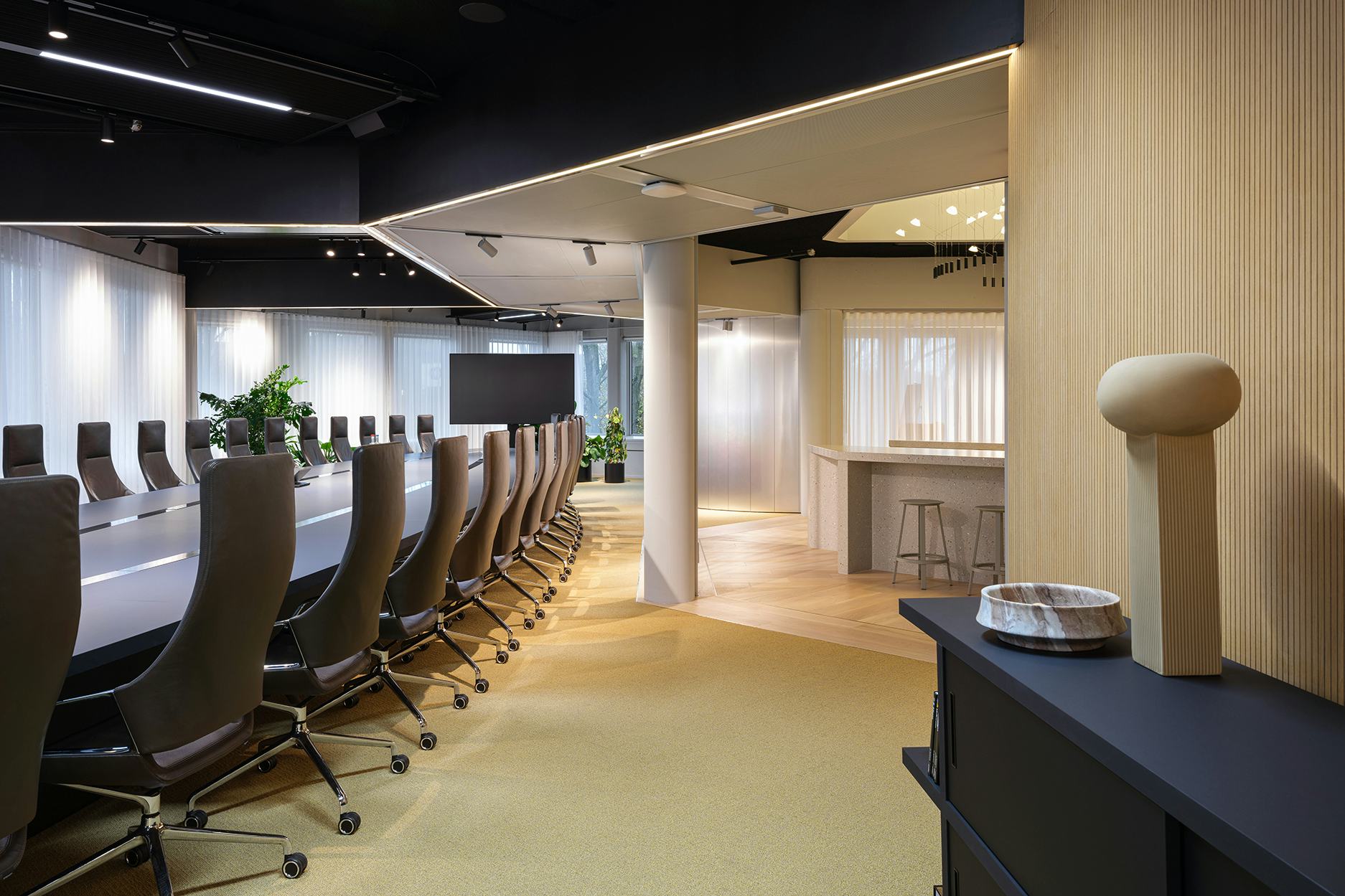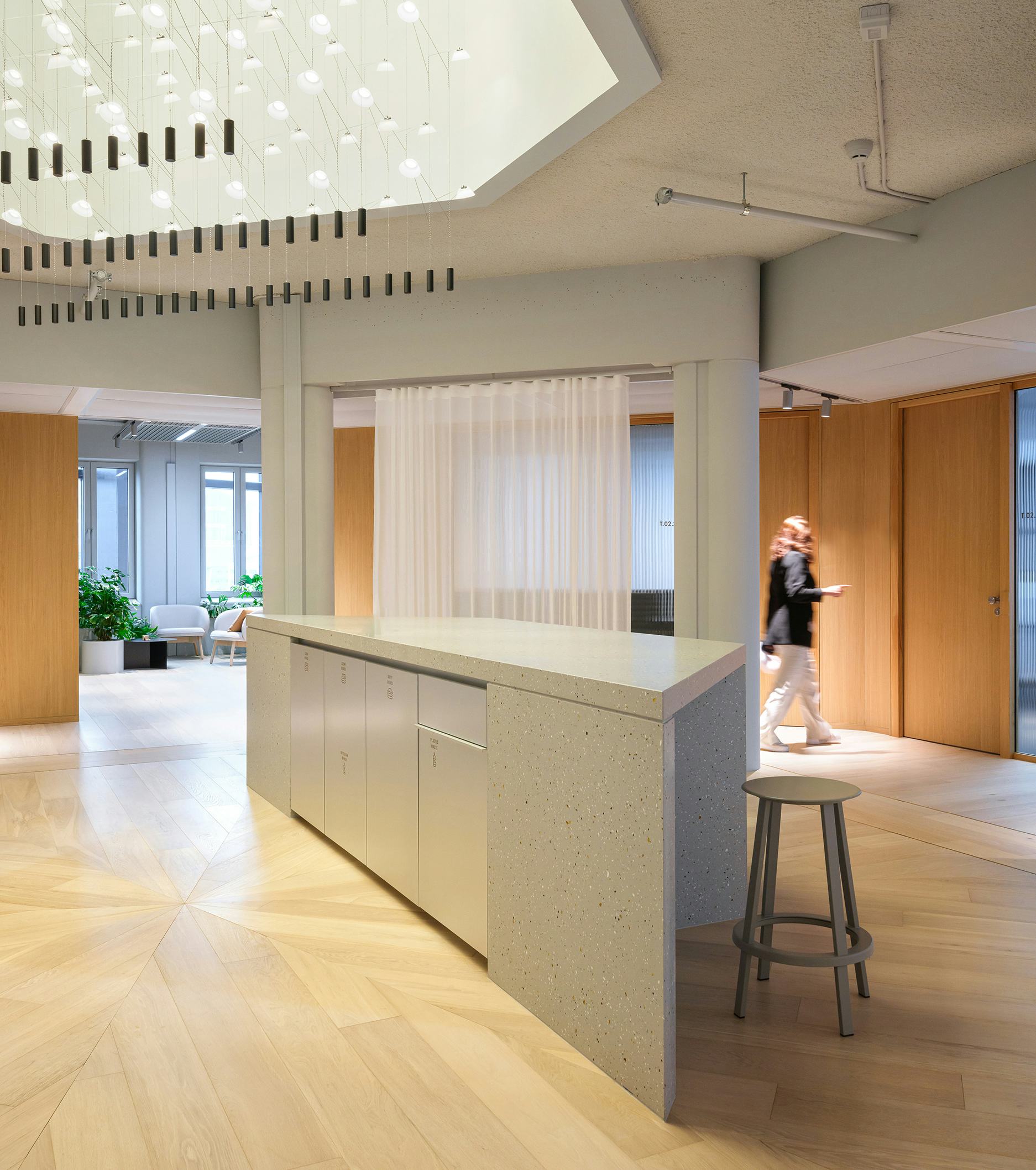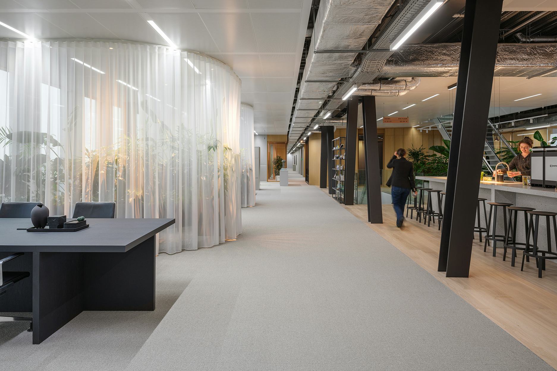 Het interieur is opgedeeld in drie zones: een gastvrije zone met recepties en koffiebars, een stimulerende samenwerkingszone en een serene focuszone. Ondanks hun verschillende functies zijn de ruimtes visueel verbonden door een harmonieus palet van natuurlijk eikenhout en bioterrazzo. Dit zorgt voor een warme en hoogwaardige uitstraling, door het hele interieur heen.