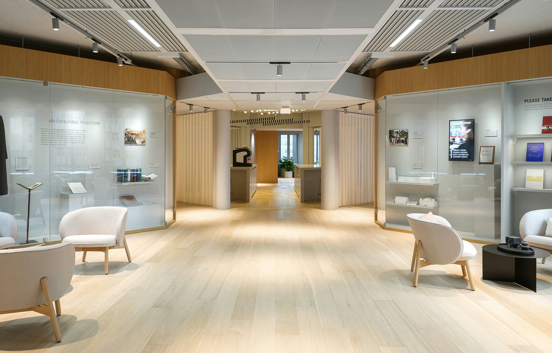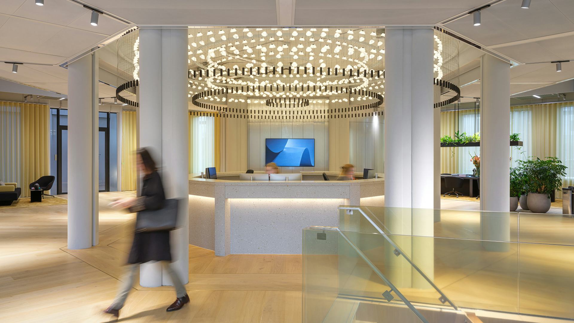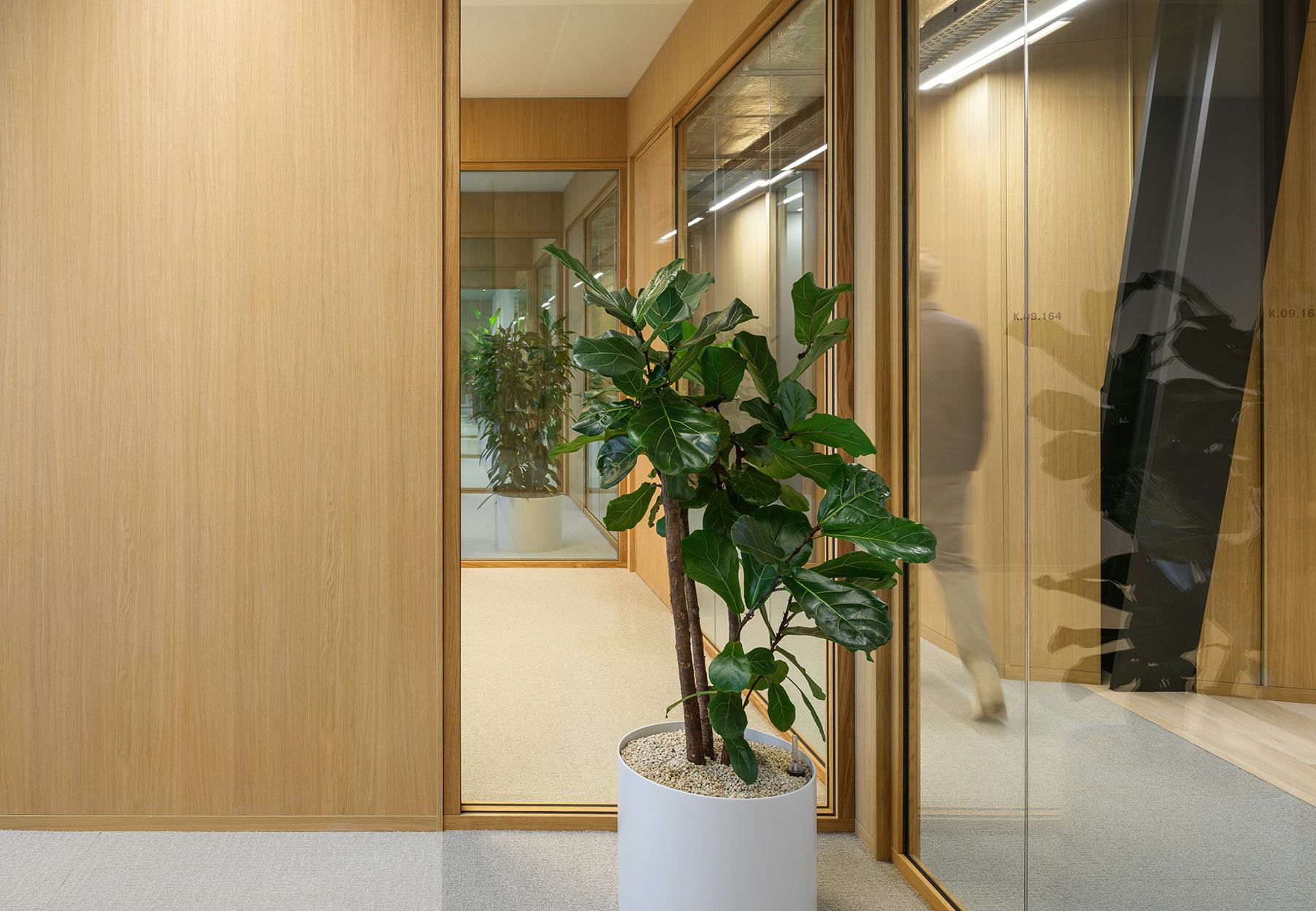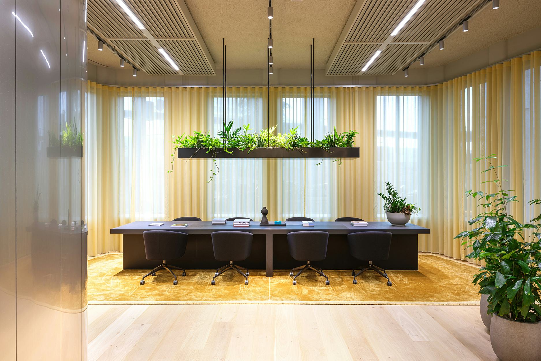 Het interieur is opgedeeld in drie zones: een gastvrije zone met recepties en koffiebars, een stimulerende samenwerkingszone en een serene focuszone. Ondanks hun verschillende functies zijn de ruimtes visueel verbonden door een harmonieus palet van natuurlijk eikenhout en bioterrazzo. Dit zorgt voor een warme en hoogwaardige uitstraling, door het hele interieur heen.