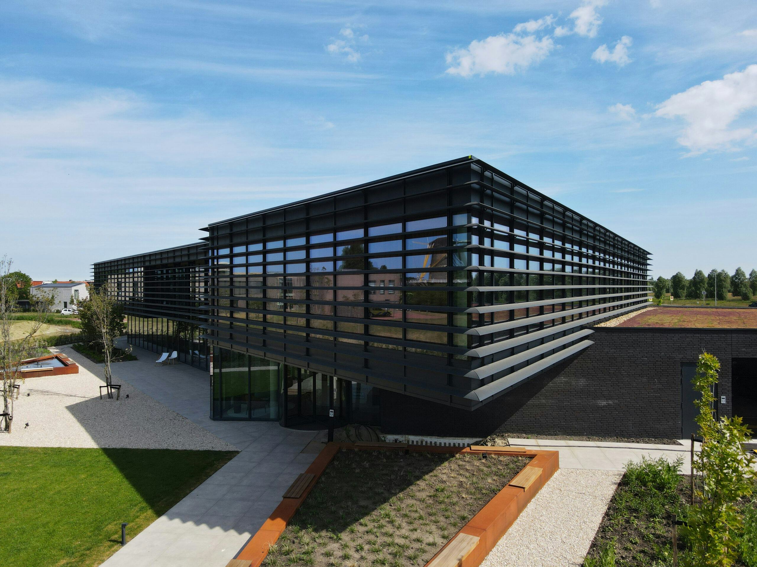‘Werken met lamellen gaf ons bovendien mogelijkheden om de architectuur van het gebouw te versterken’, vult Strenk aan.’De dynamische vorm met scherpe hoeken en de grote overstek bij de entree zijn evenzeer functioneel als ontwerpmatig. Als internationaal IT-bedrijf wou Maxxton een echt visitekaartje neerpoten en dat is zeker gelukt.’