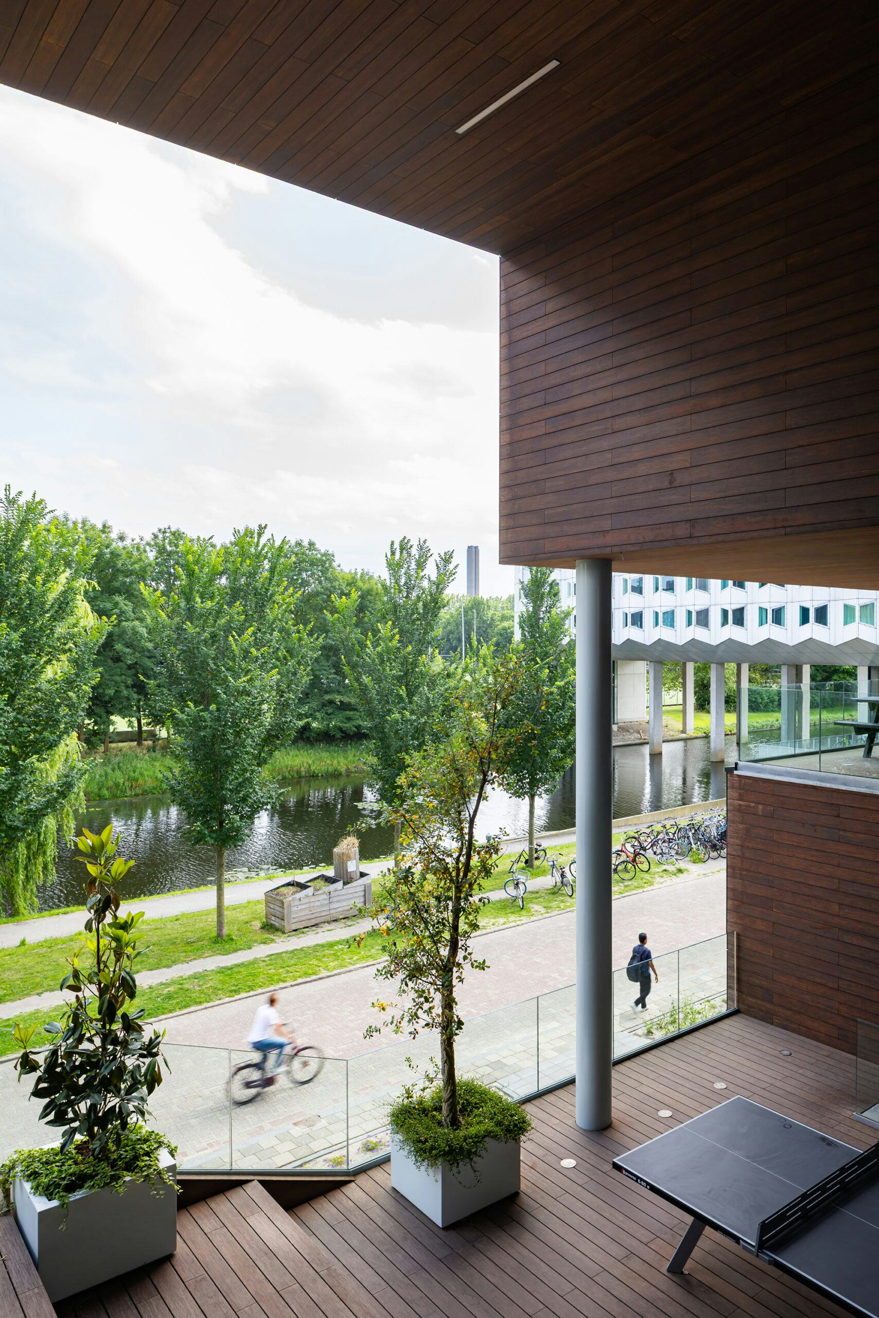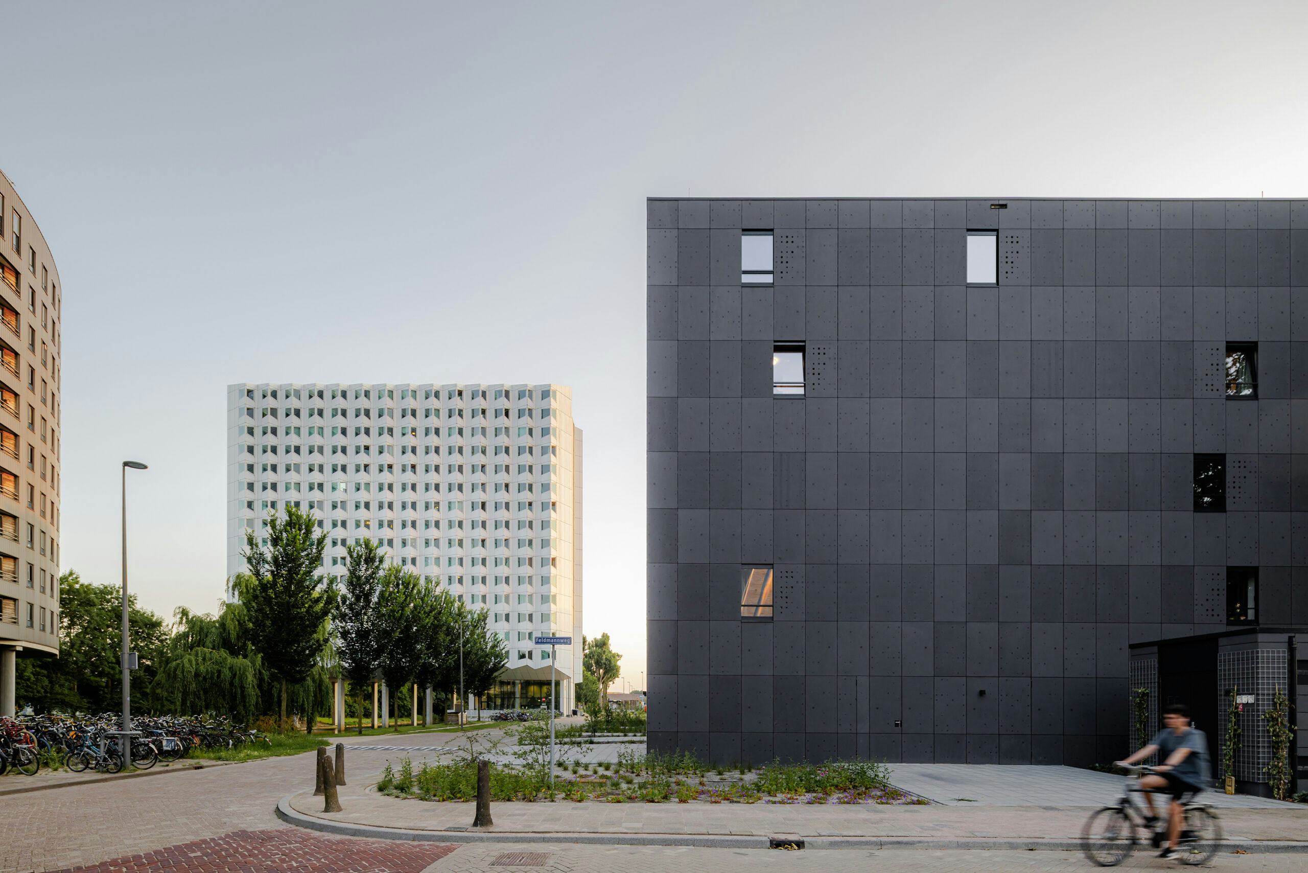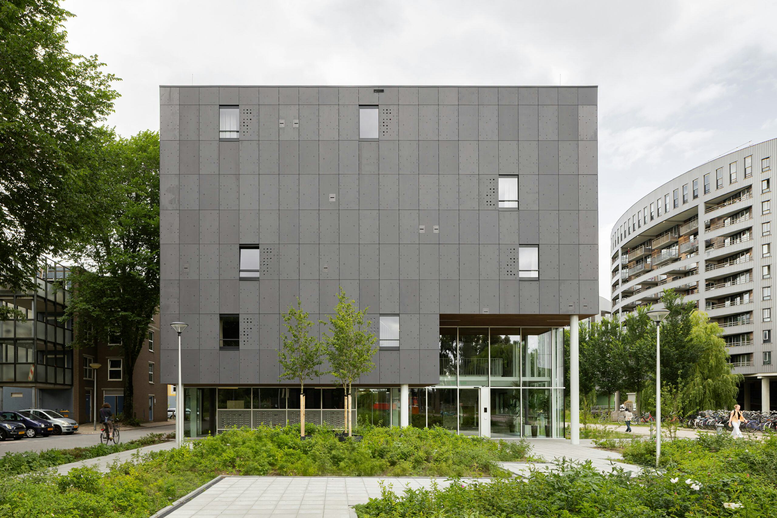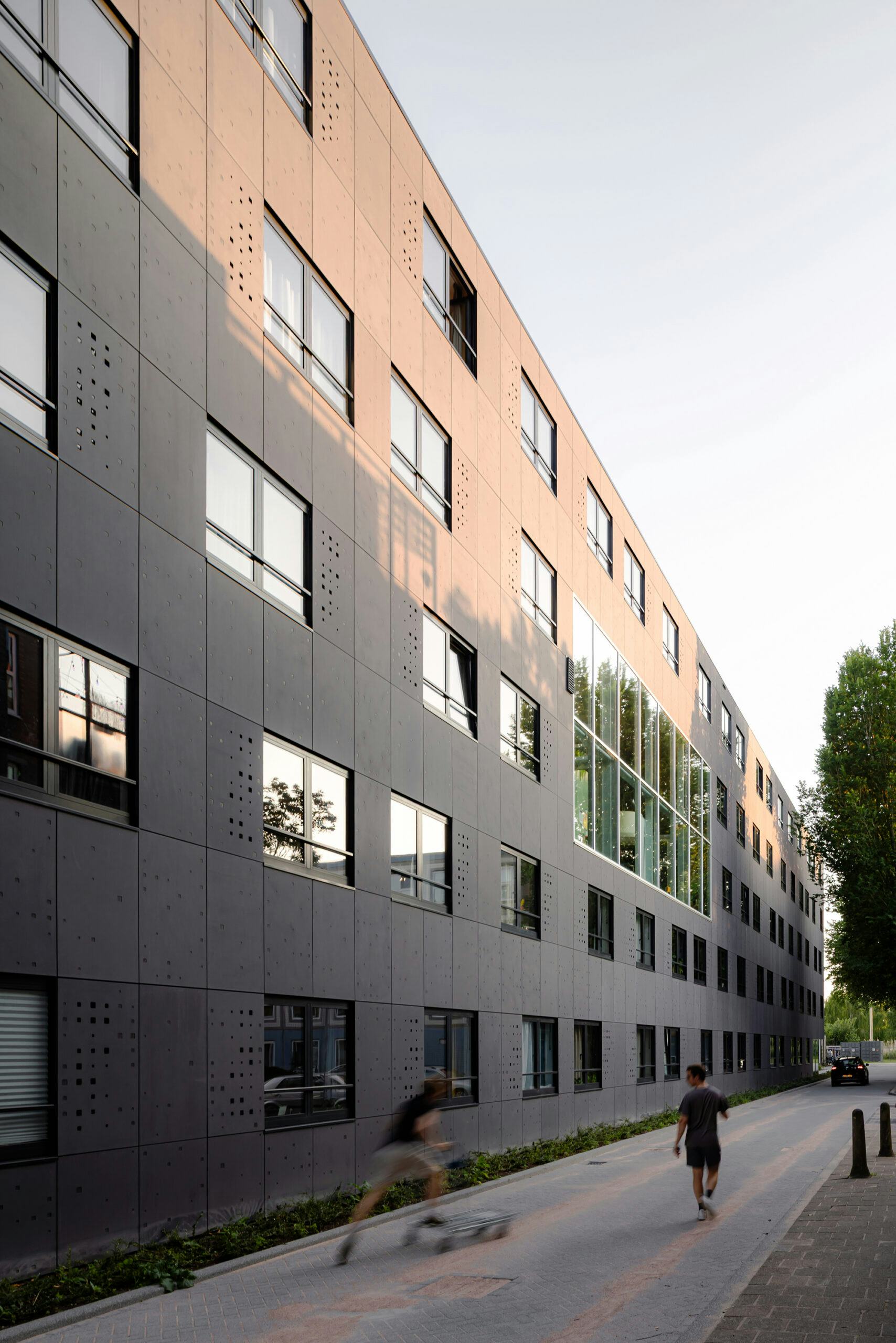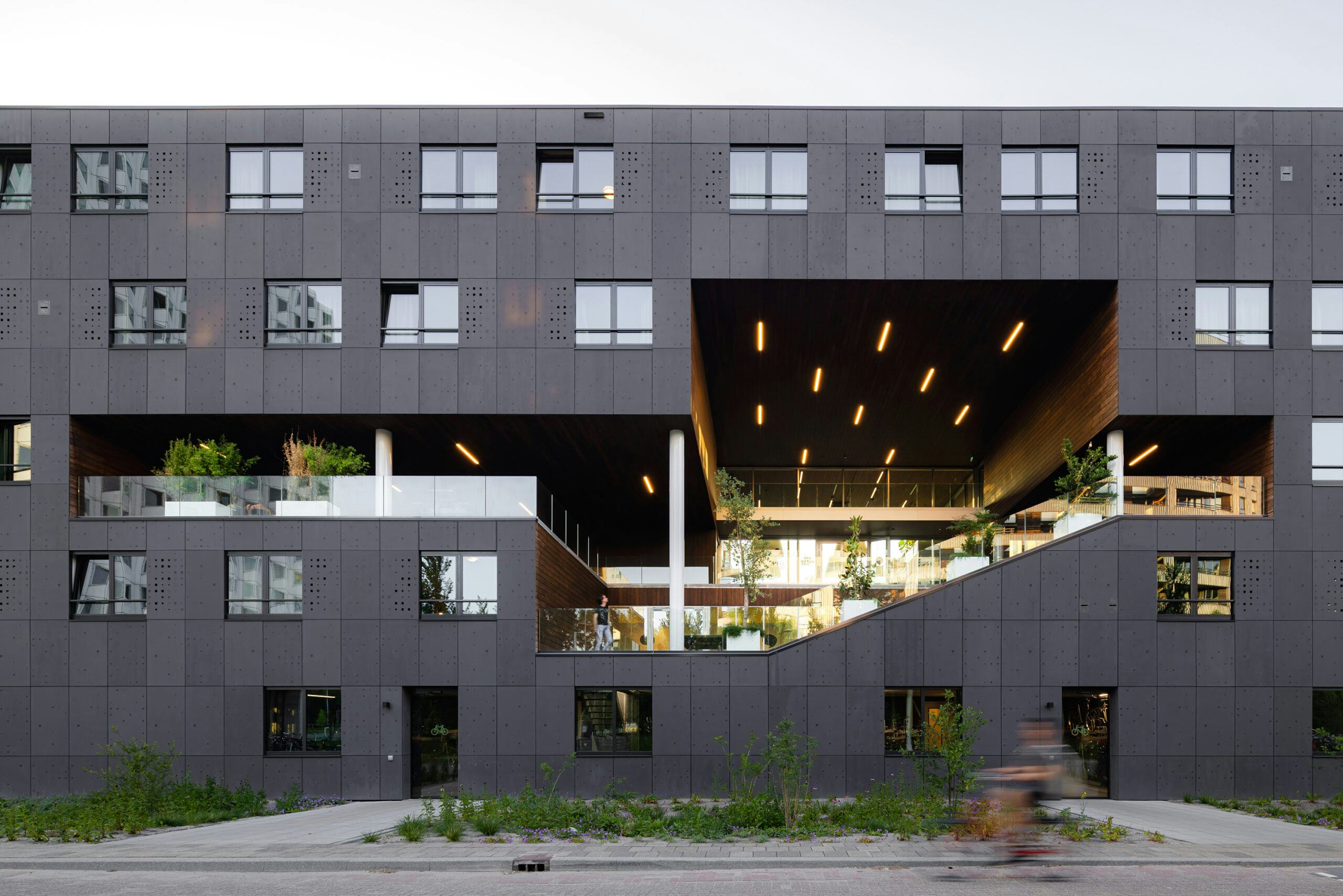 Duurzaamheid speelt een belangrijke rol in het ontwerp. Het dak is volledig ingericht als sedumlandschap met zonnepanelen, en binnen zorgen houten afwerkingen en vloeren en geïntegreerd groen voor een gezonde leefomgeving. De buitengevel is bekleed met Eternit TE 800-panelen.