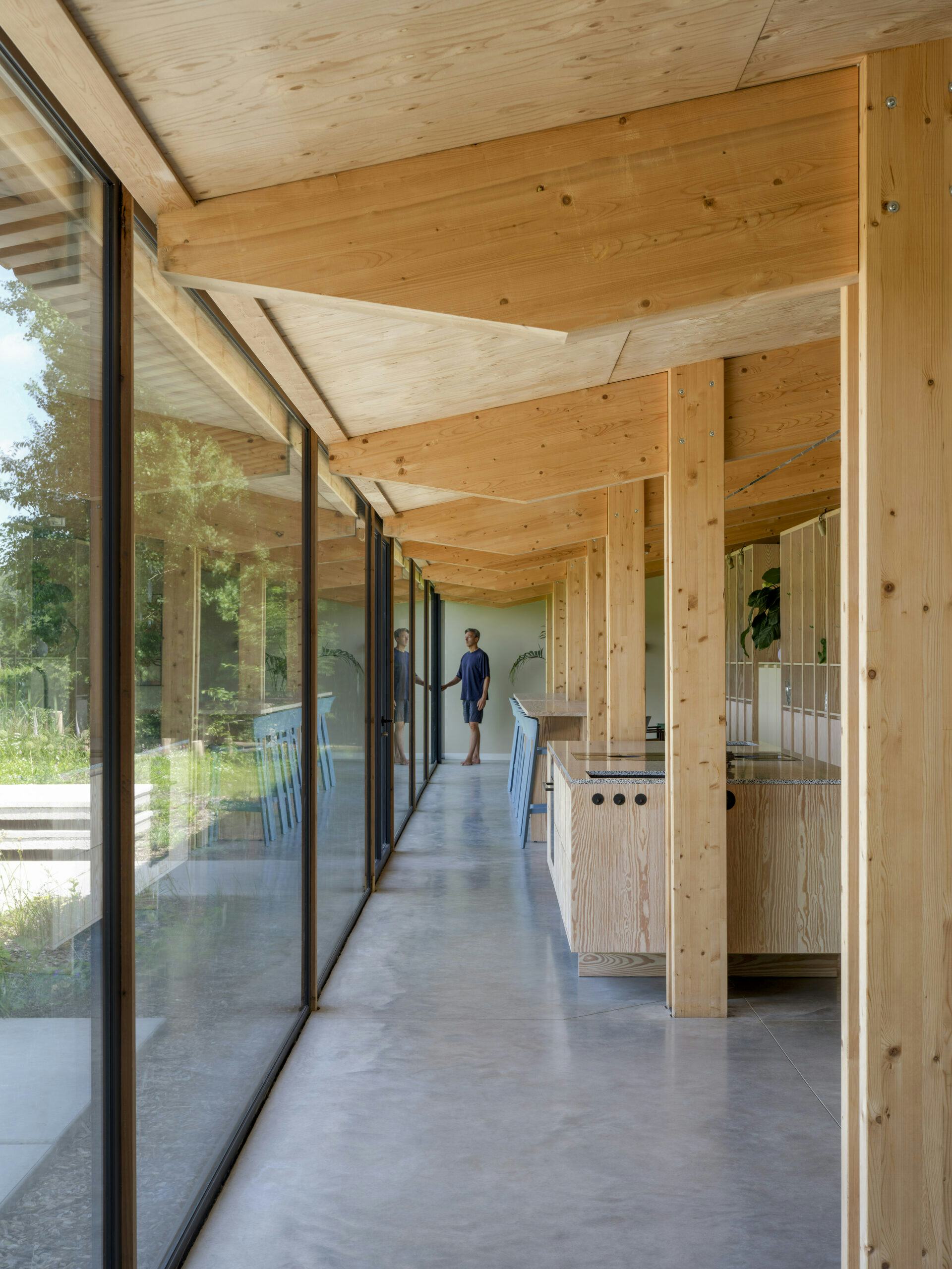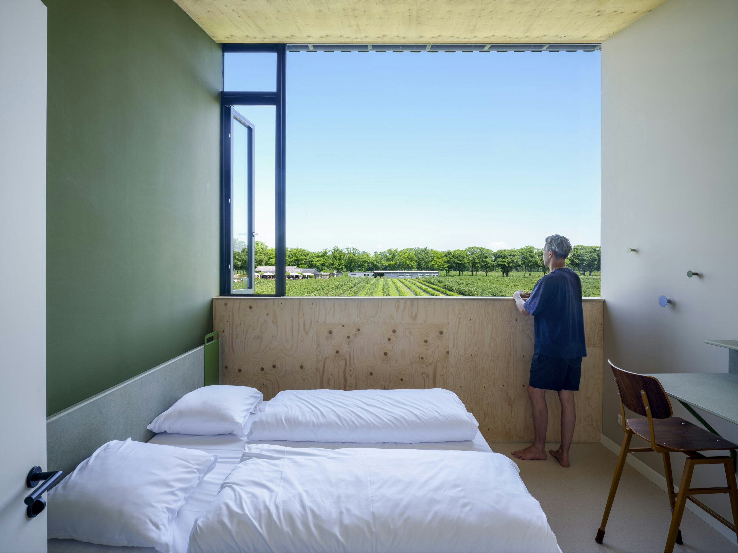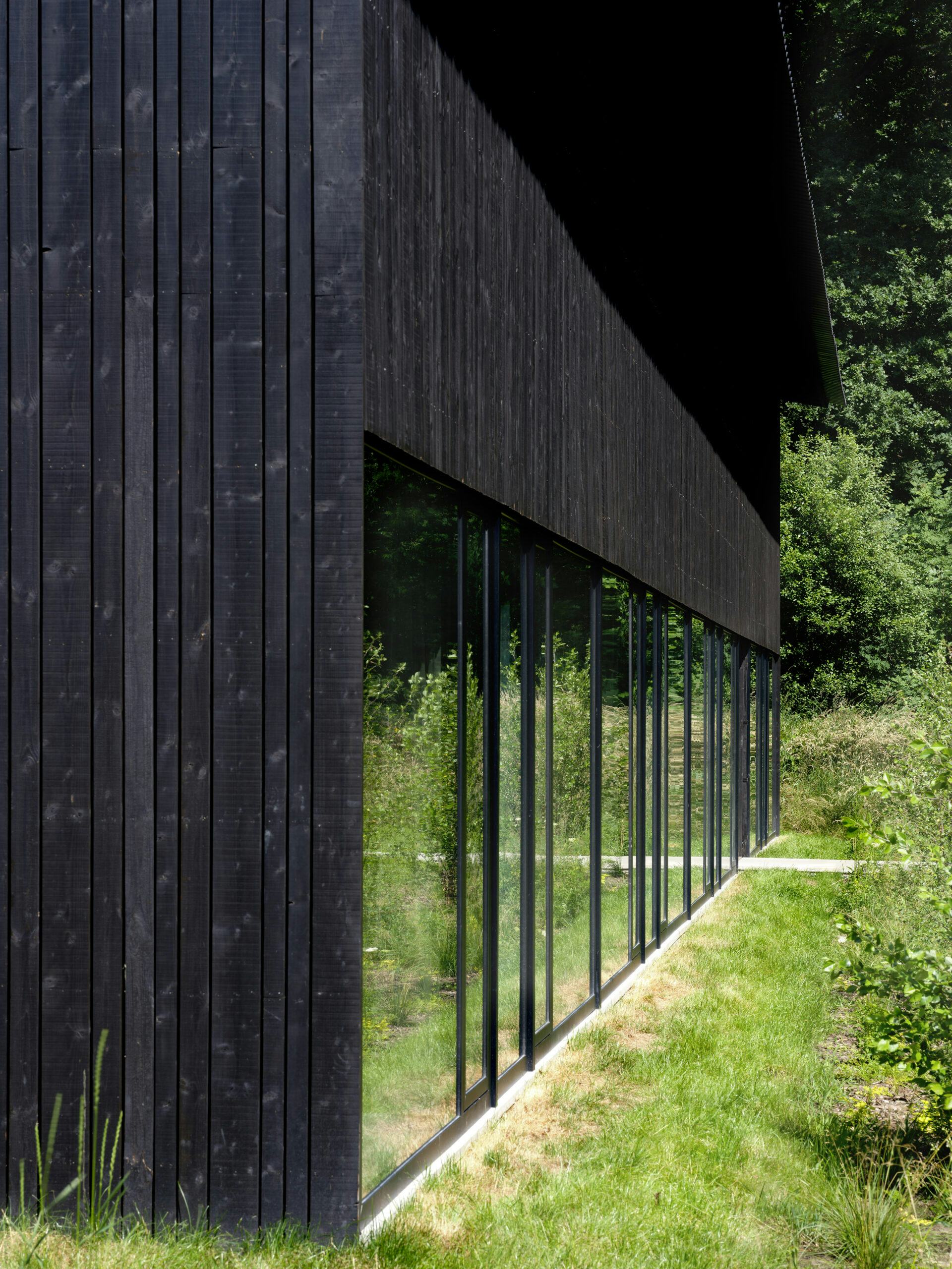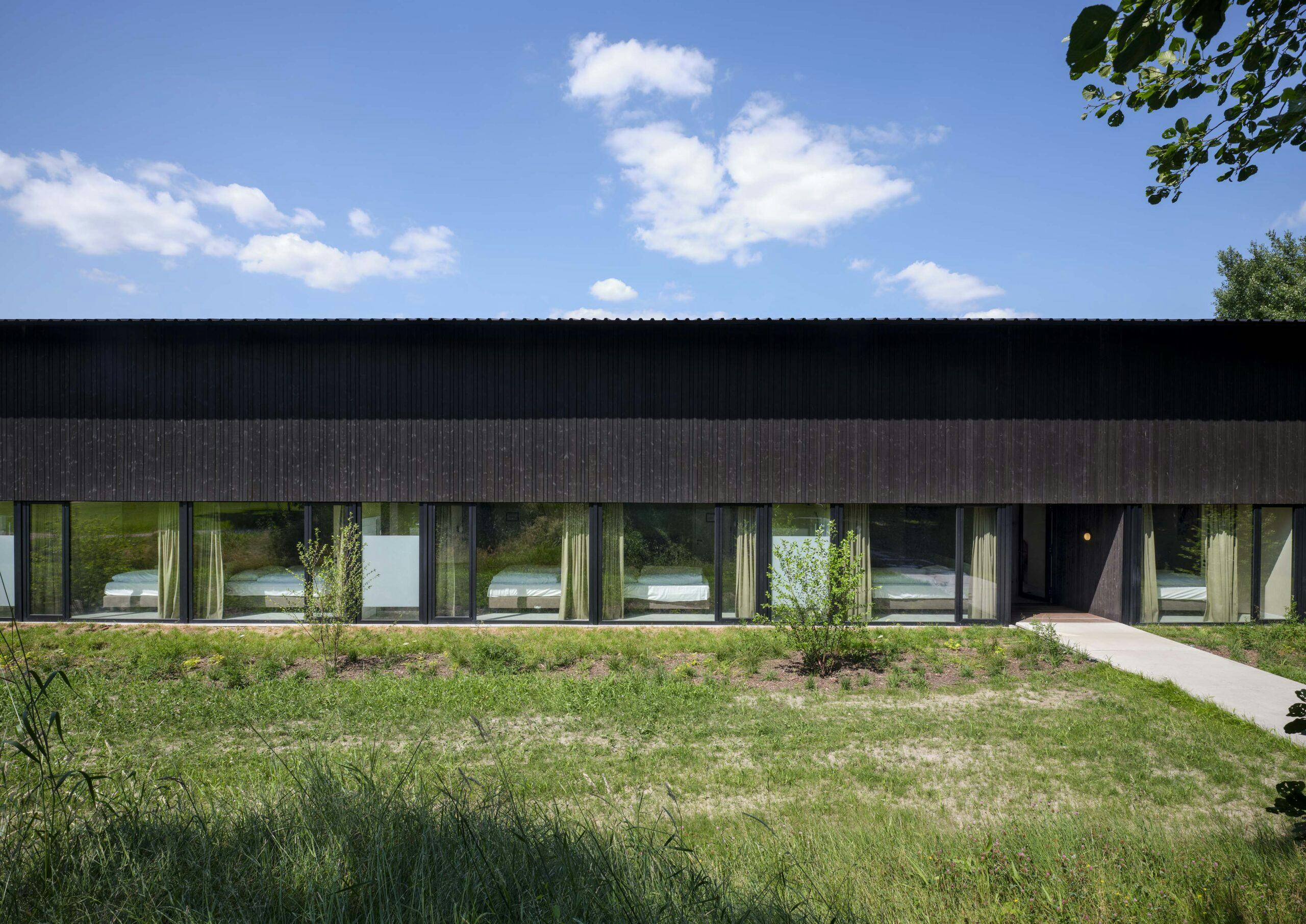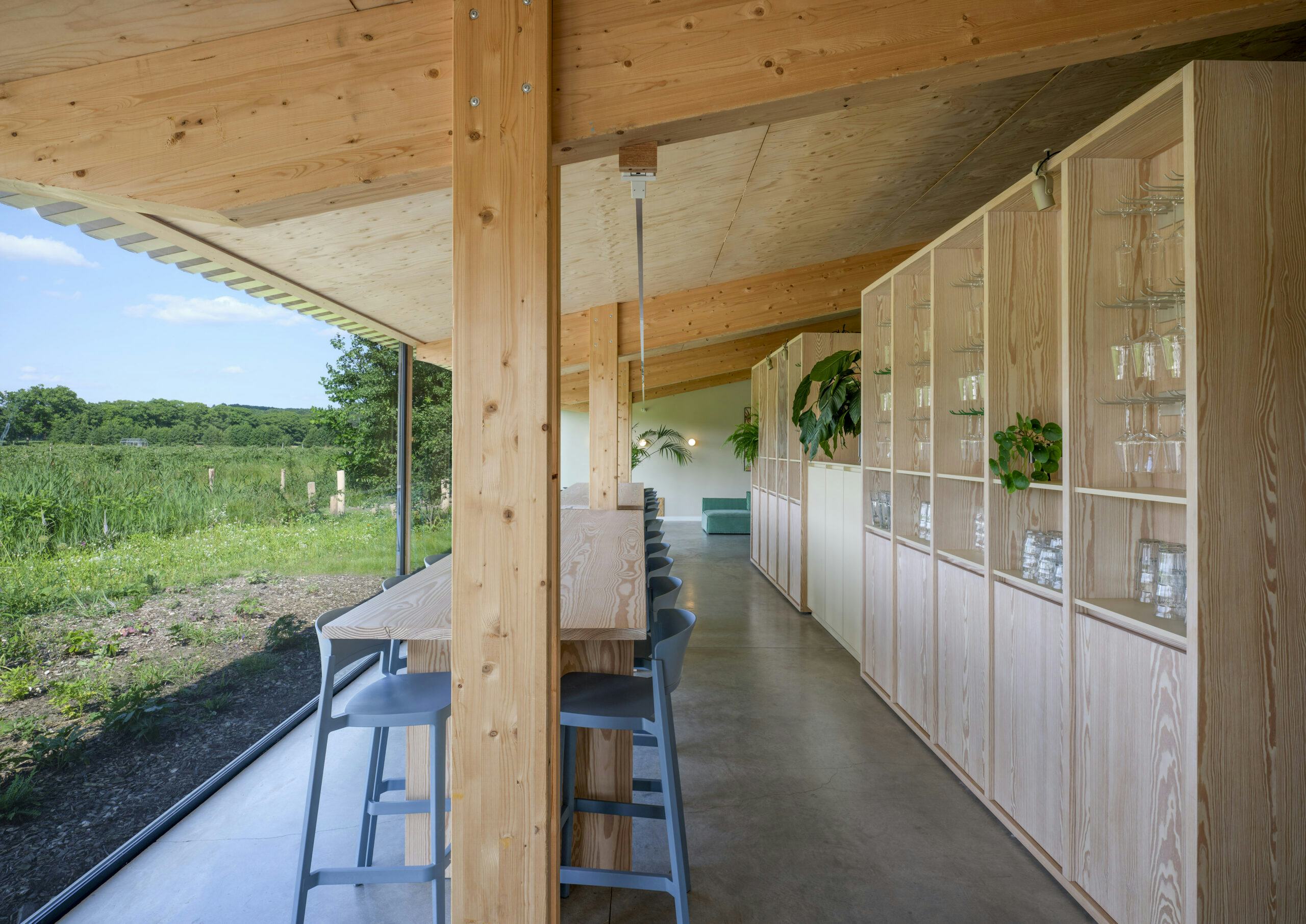 Het gebouw heeft een oppervlakte van 730 vierkante meter en bestaat uit twee volumes die verwijzen naar de traditionele schuren in de omgeving. Eén volume herbergt de gemeenschappelijke ruimte met uitzicht op de plantage, het andere de slaapvertrekken. De kamers op de begane grond kijken uit op het bos, die op de verdieping op de lucht en de plantage. Grote ramen zorgen voor wisselend licht en uitzicht gedurende de dag en de seizoenen.