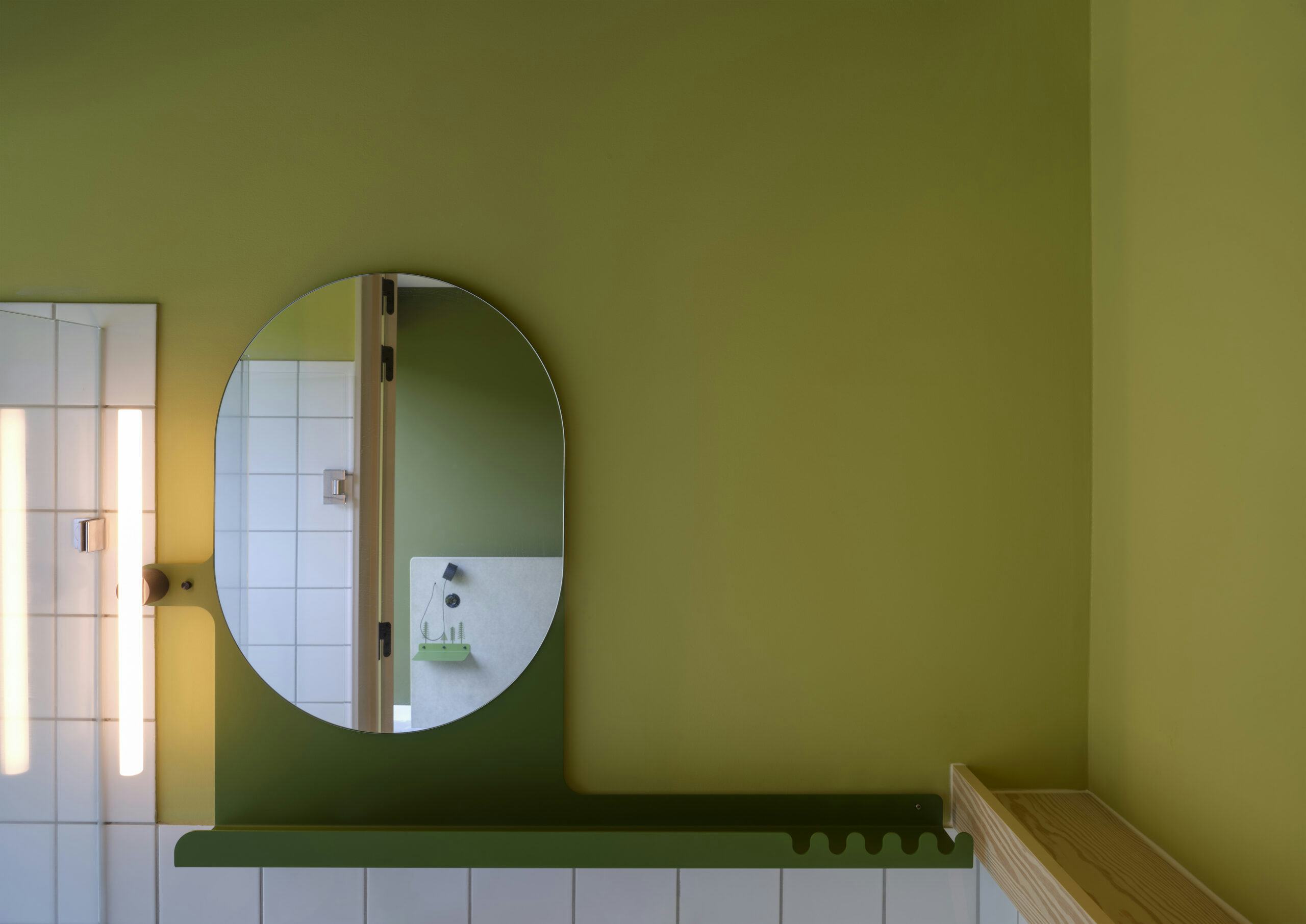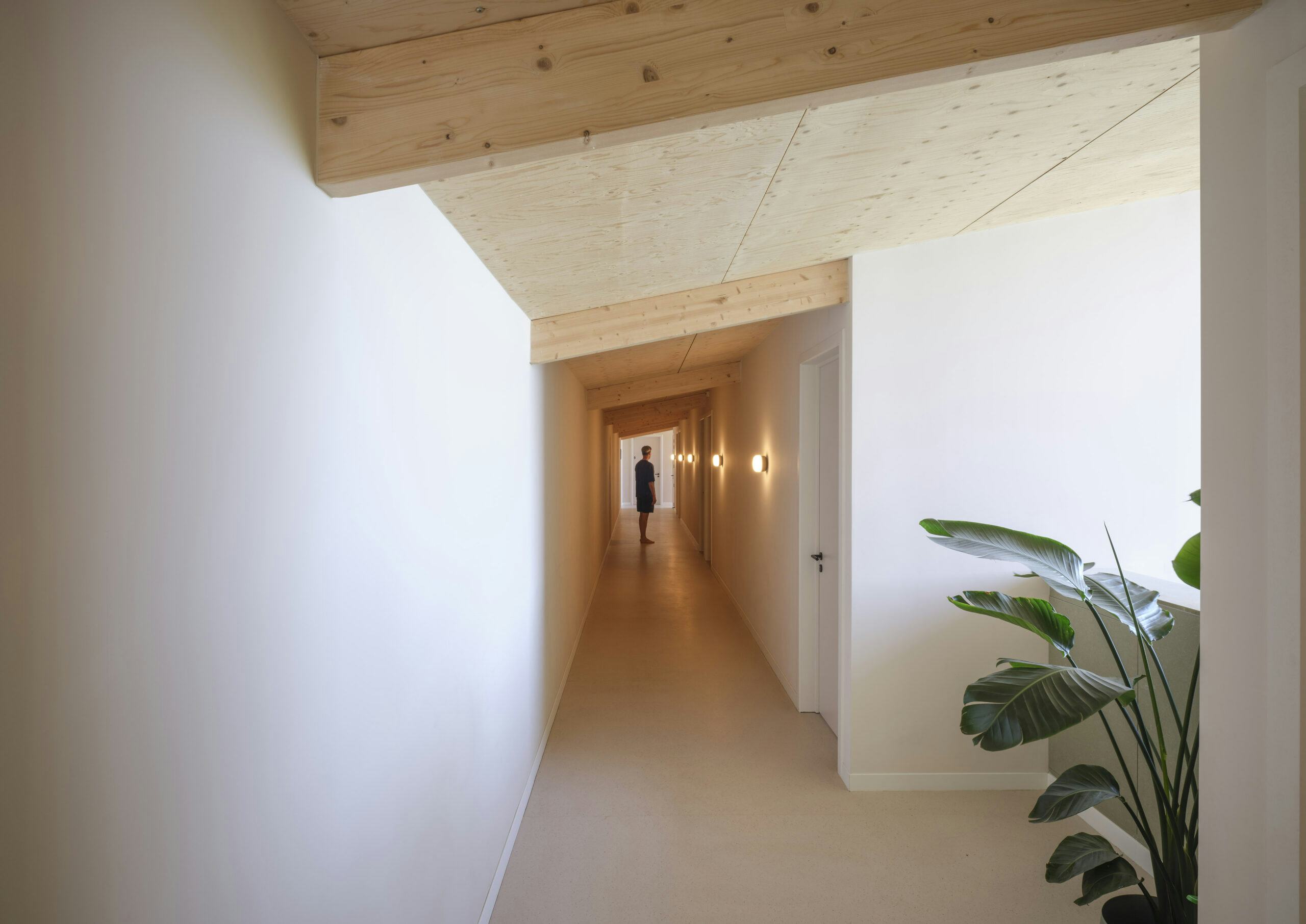 Het interieur is ontworpen door Raumkultur, dat ook verantwoordelijk was voor de inrichting. In de gemeenschappelijke ruimte zijn keuken, kasten en tafels op maat gemaakt in de eigen werkplaats. Ook de verlichting en meubels in de slaap- en badkamers zijn speciaal voor dit project ontworpen. Daarmee sluit de inrichting aan bij de sobere opzet van het gebouw en de natuurlijke omgeving.