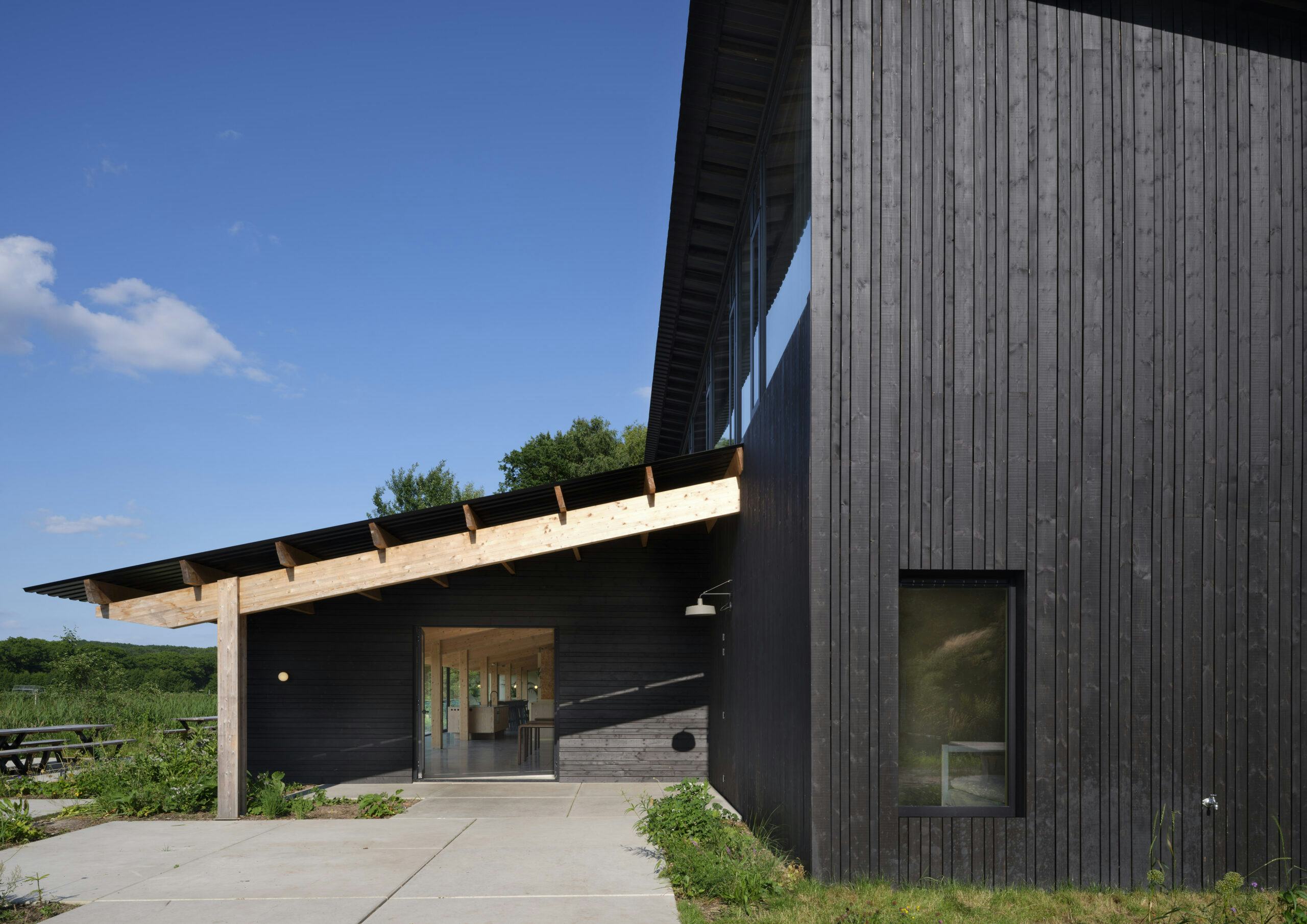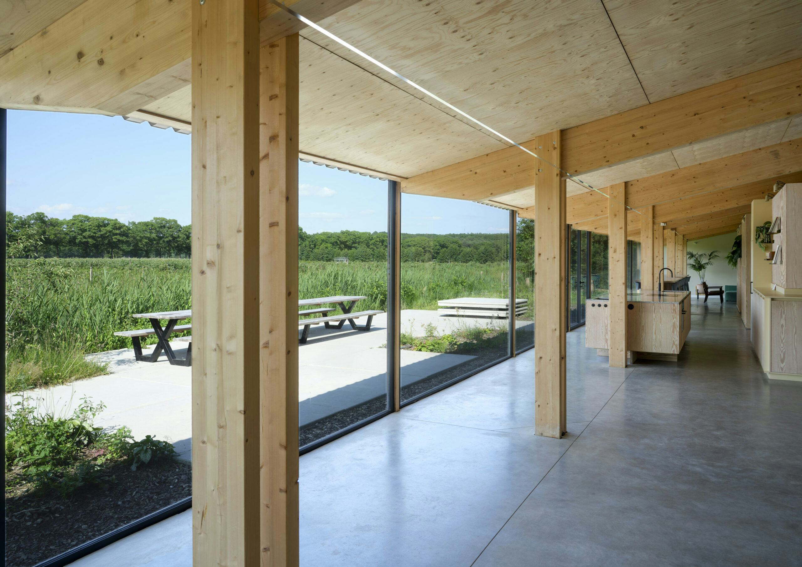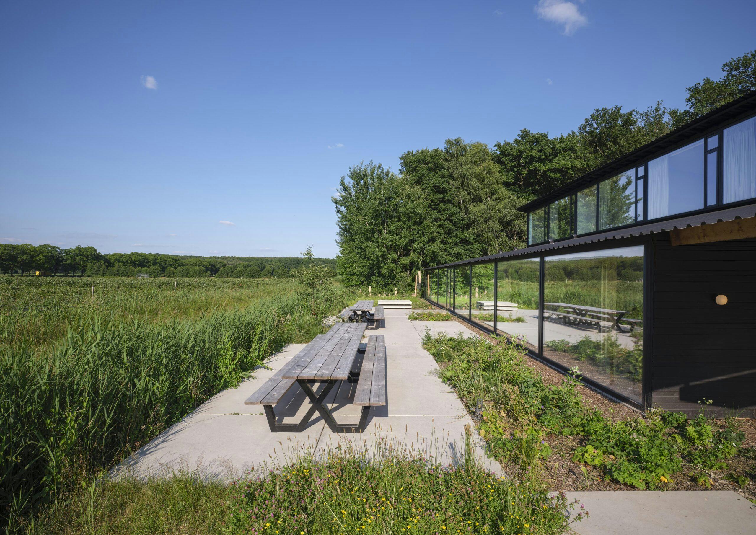 Voor de bouw is gewerkt met een beperkt budget. Het casco werd volledig geprefabriceerd in hout. De zwarte gevel en het stalen dak zijn eenvoudig uitgevoerd; regenwater stroomt direct de natuur in. Met deze keuzes is een duurzaam en ingetogen gebouw gerealiseerd dat past in het landschap en de plantage een nieuwe voorziening biedt.
