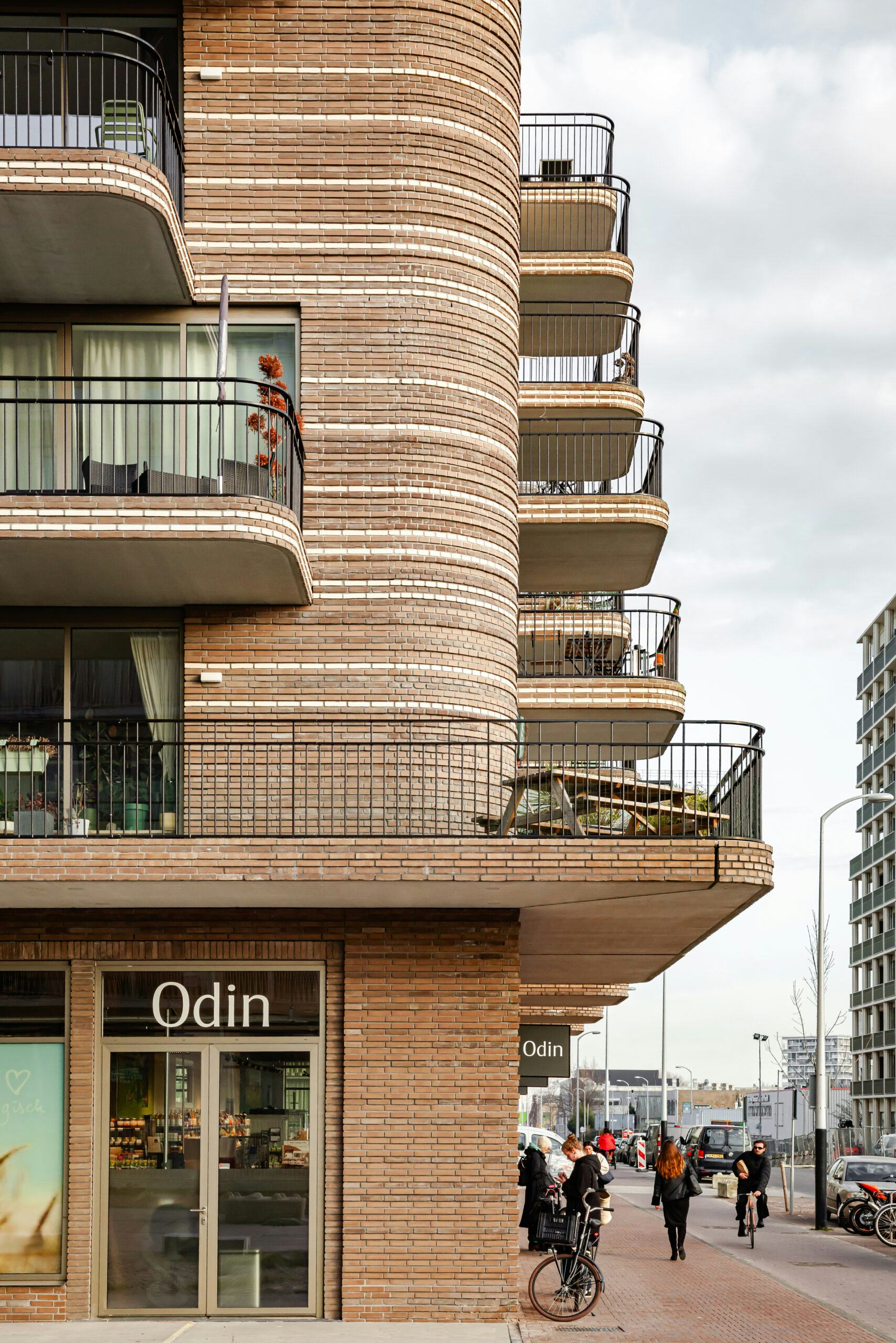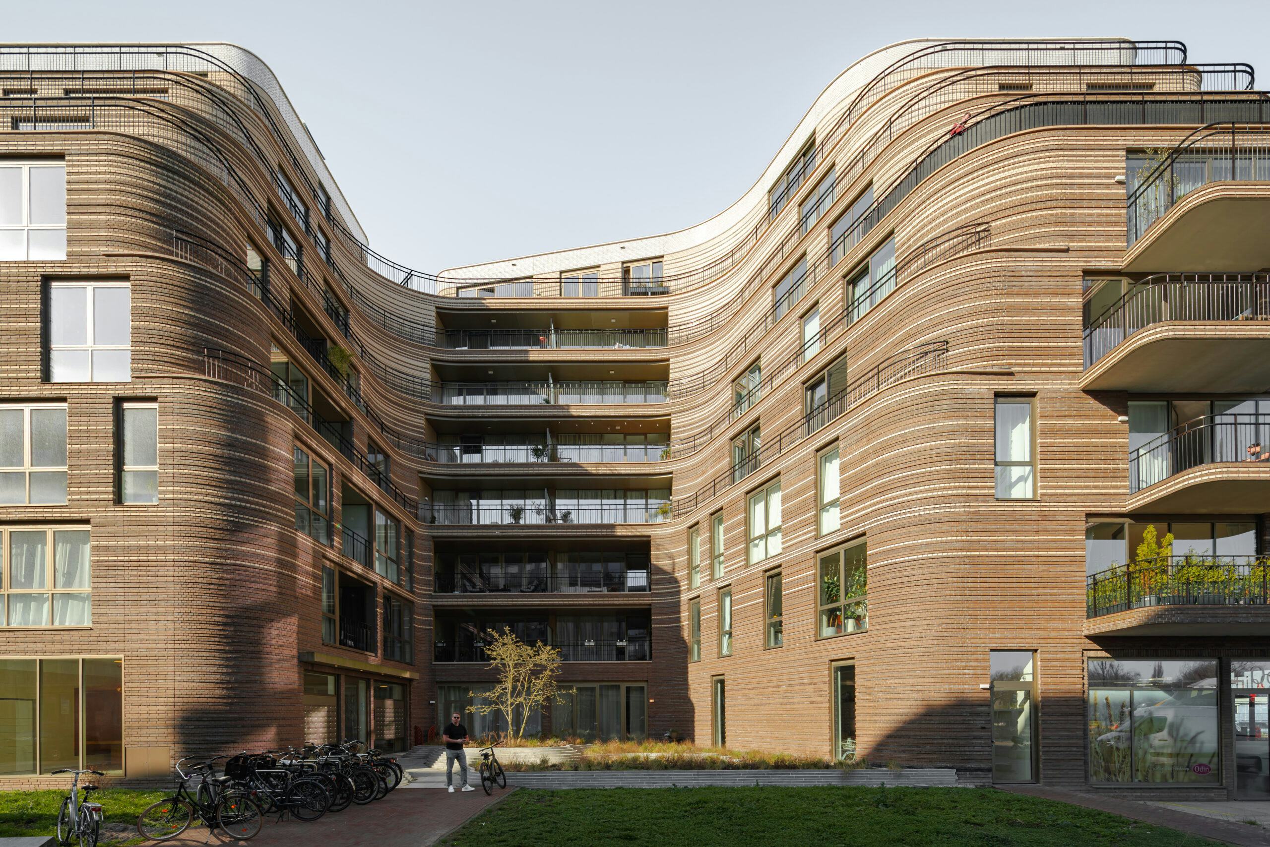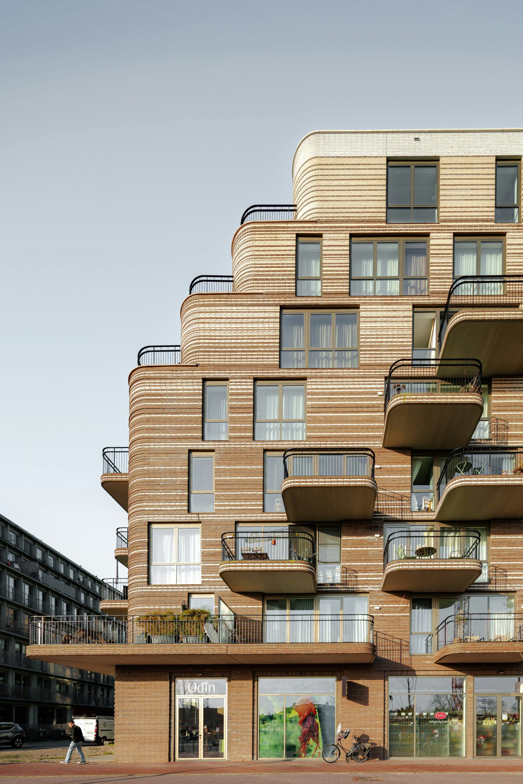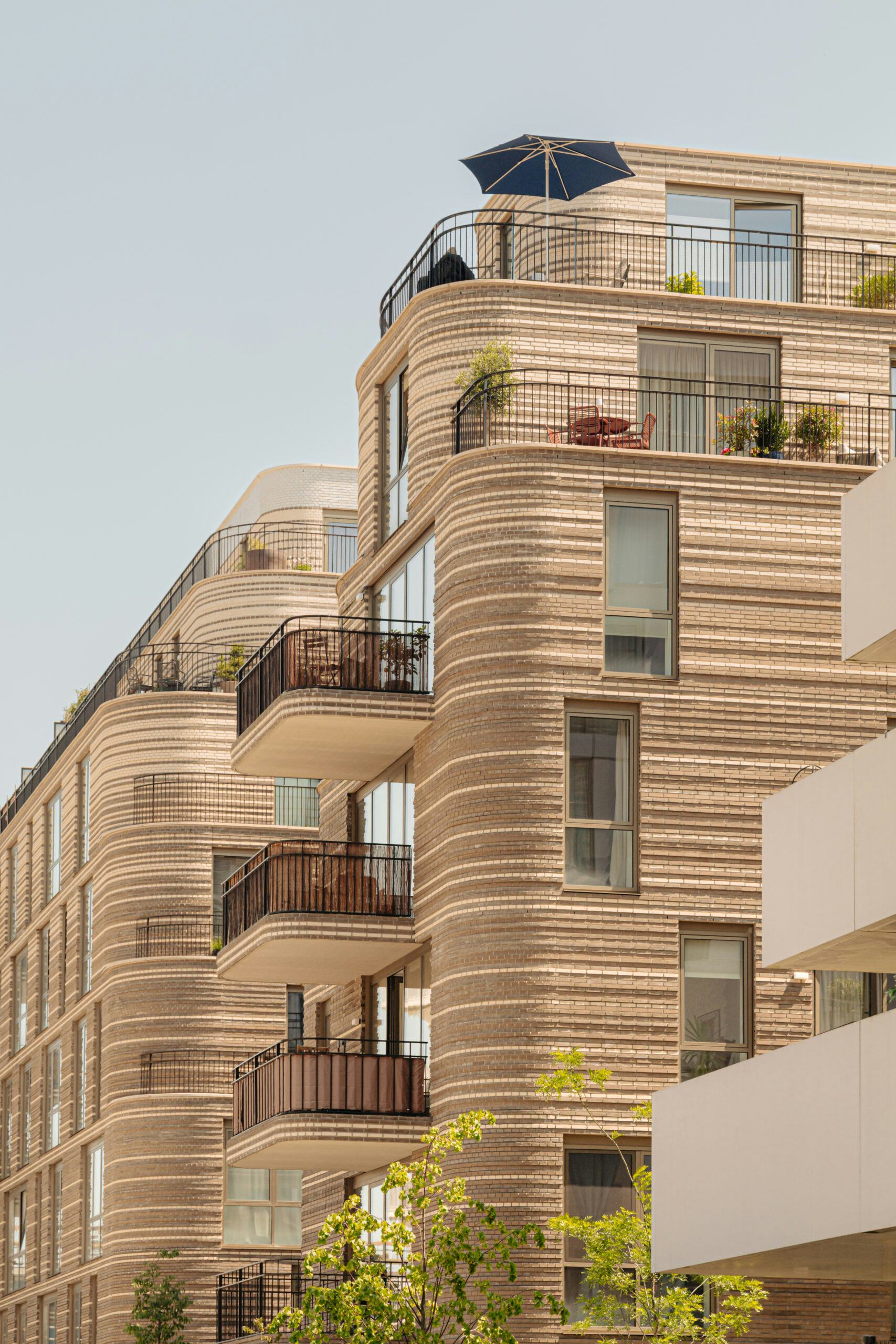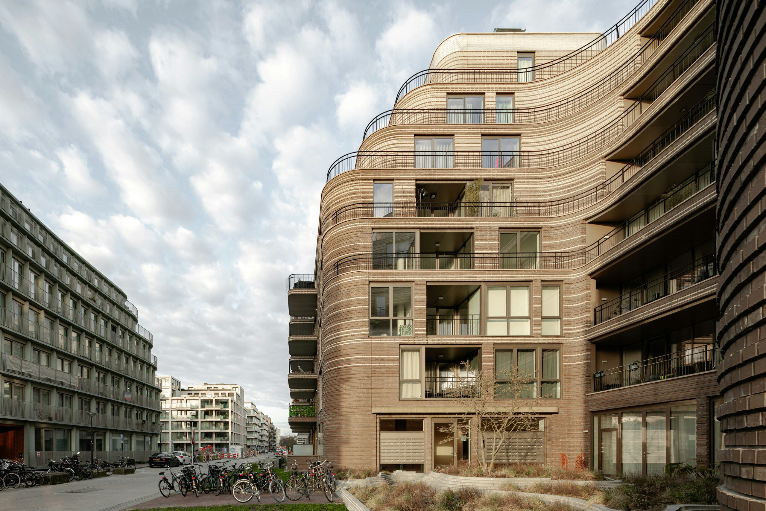 De woningen zijn georganiseerd rond drie trappenhuizen en variëren in type en grootte. Door terugliggende verdiepingen zijn op de bovenste lagen dakterrassen gecreëerd, terwijl de lagere niveaus profiteren van voldoende daglicht. Grote ramen bieden uitzicht op de binnentuinen en zorgen voor lichtinval. De gevel is opgebouwd uit vier kleuren baksteen, die geleidelijk verlopen van donker naar licht. Balkons en balustrades versterken het grootstedelijke karakter van het gebouw.