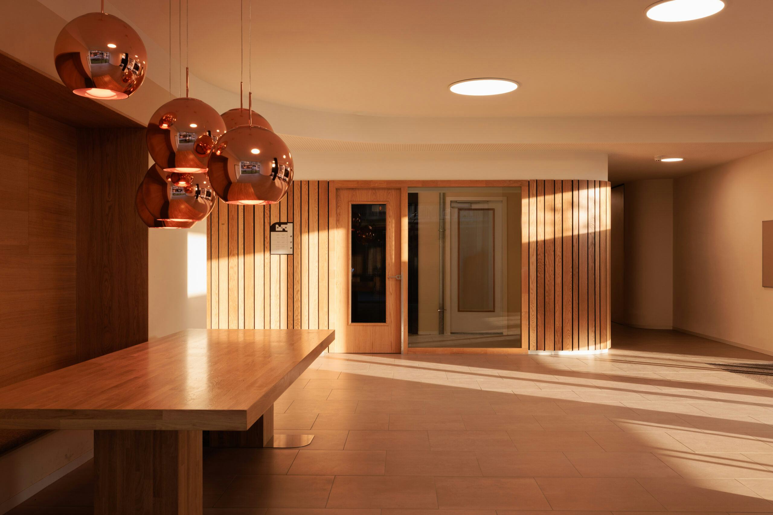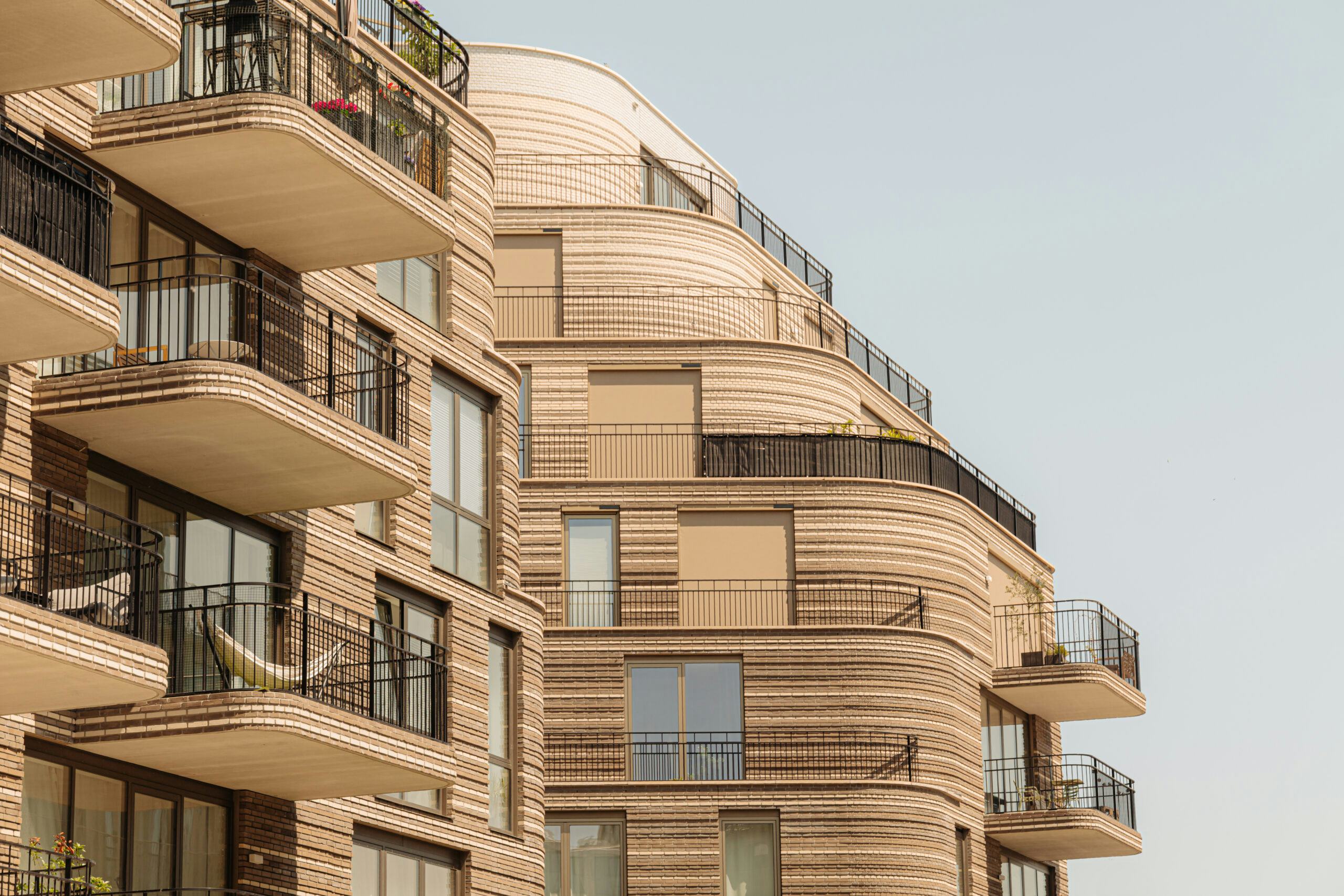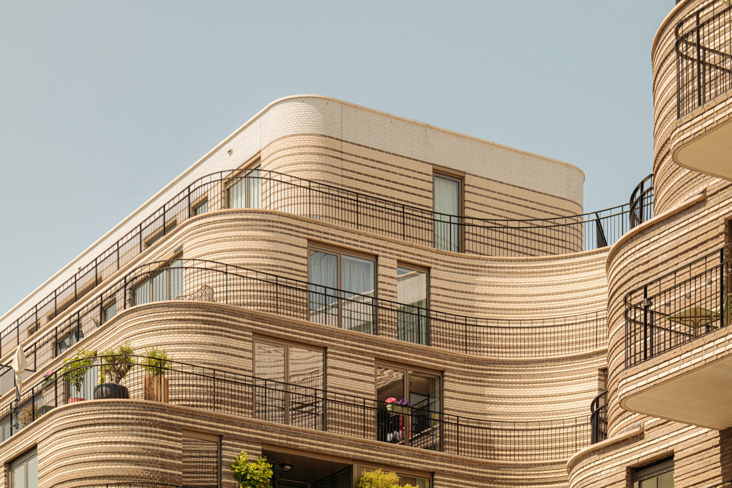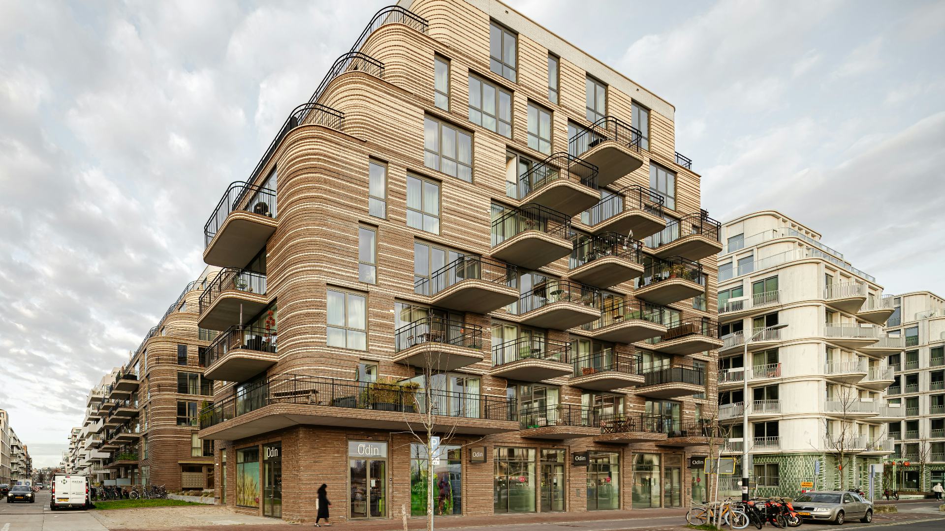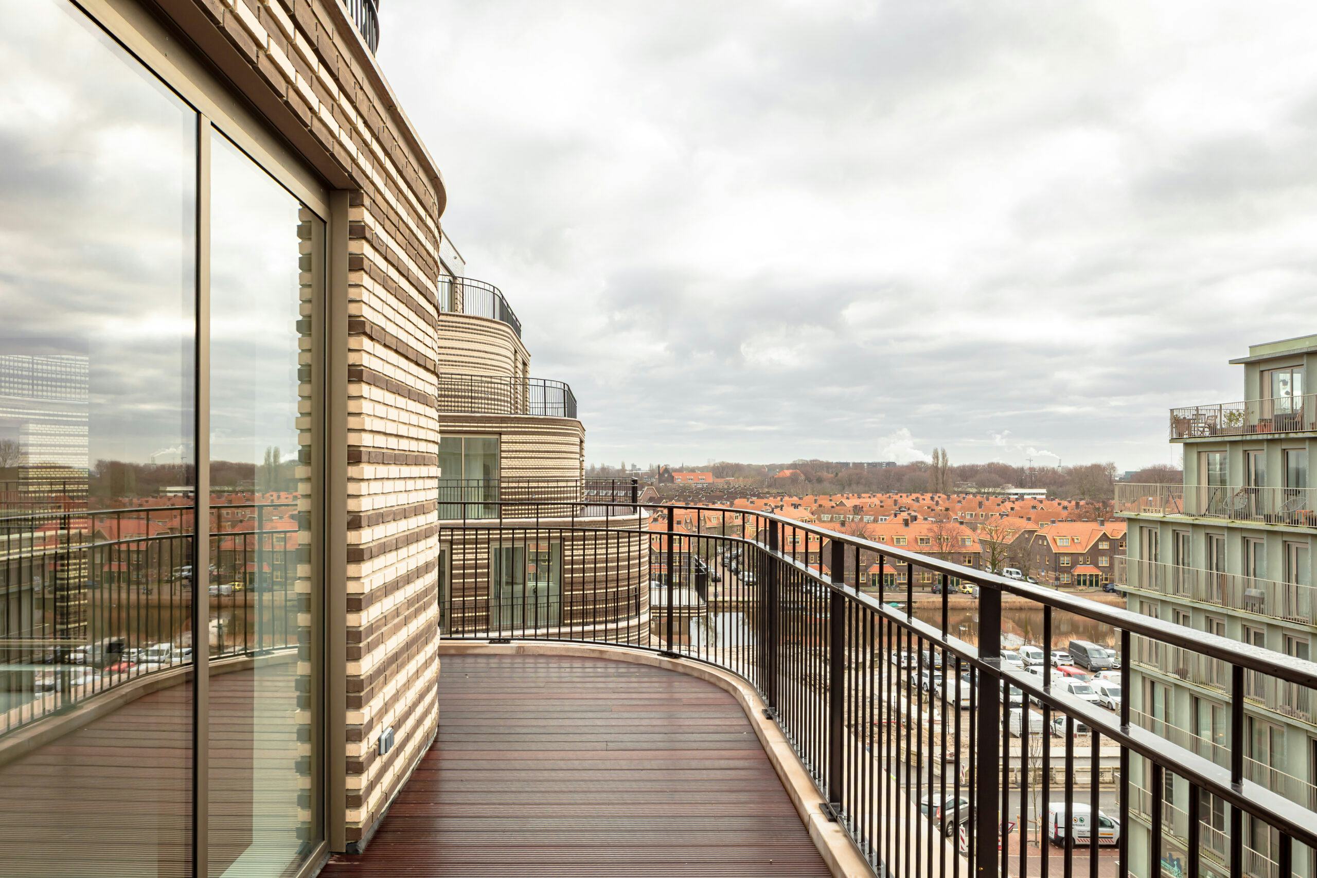 De woningen zijn georganiseerd rond drie trappenhuizen en variëren in type en grootte. Door terugliggende verdiepingen zijn op de bovenste lagen dakterrassen gecreëerd, terwijl de lagere niveaus profiteren van voldoende daglicht. Grote ramen bieden uitzicht op de binnentuinen en zorgen voor lichtinval. De gevel is opgebouwd uit vier kleuren baksteen, die geleidelijk verlopen van donker naar licht. Balkons en balustrades versterken het grootstedelijke karakter van het gebouw.