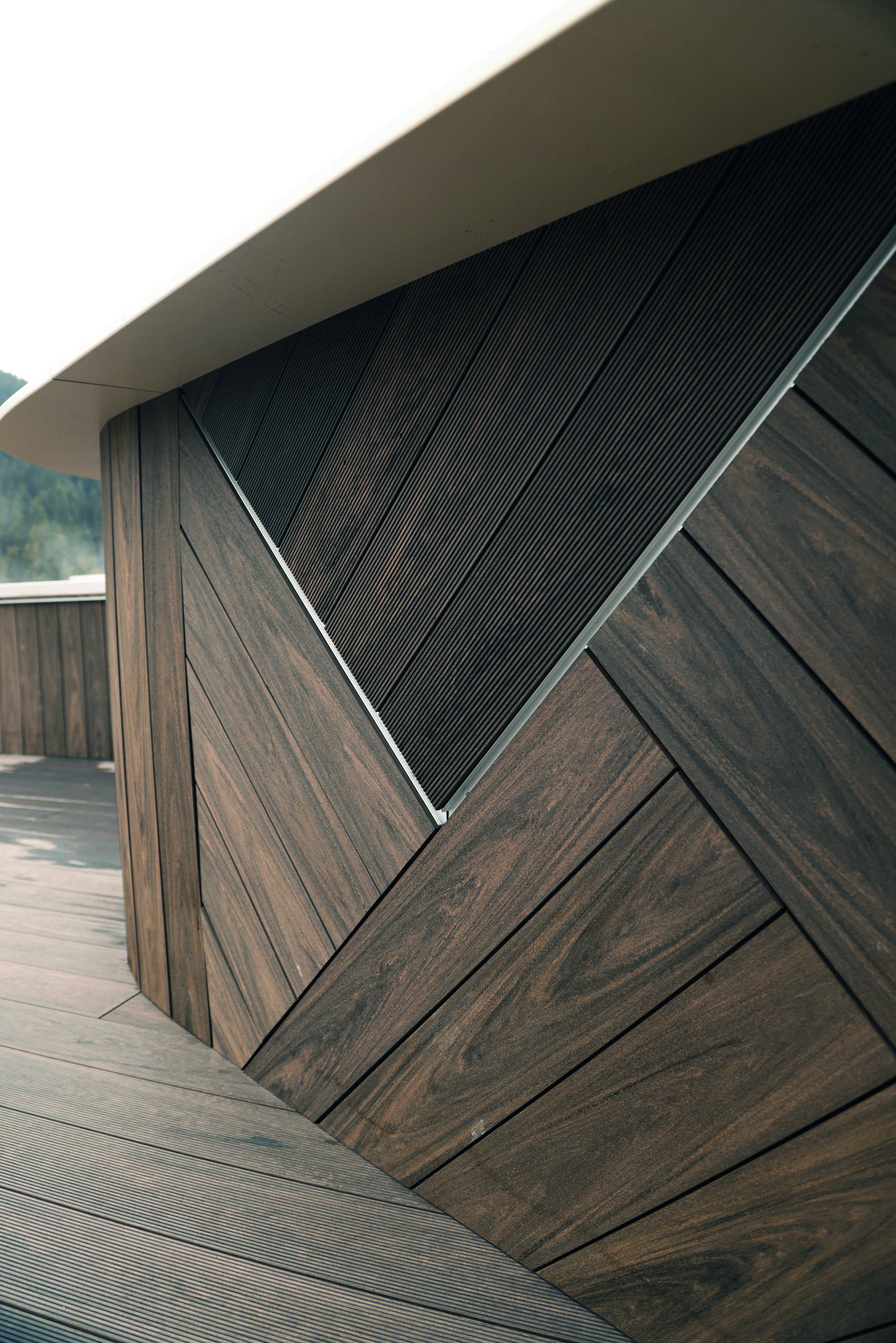 ‘We wilden per se iets eigens en unieks bieden’, vertelt Mart. ‘Dankzij onze jarenlange expertise in productietechniek zijn we erin geslaagd een door-en-door gekleurde plank te ontwikkelen, volledig mét houtnerfstructuur. Het bijzondere is dat deze plank op dezelfde vertrouwde manier te bewerken is als hout — je kunt het bijvoorbeeld frezen — maar zonder dat nabehandeling nodig is. Sterker nog: door de bewerking komt de houtstructuur nóg mooier naar voren. Het resultaat is een gevel en vloer met een hoogwaardige uitstraling die tegelijkertijd even duurzaam blijft.’