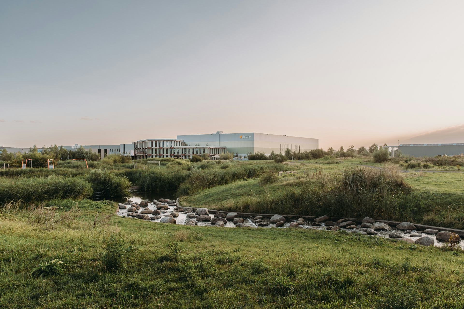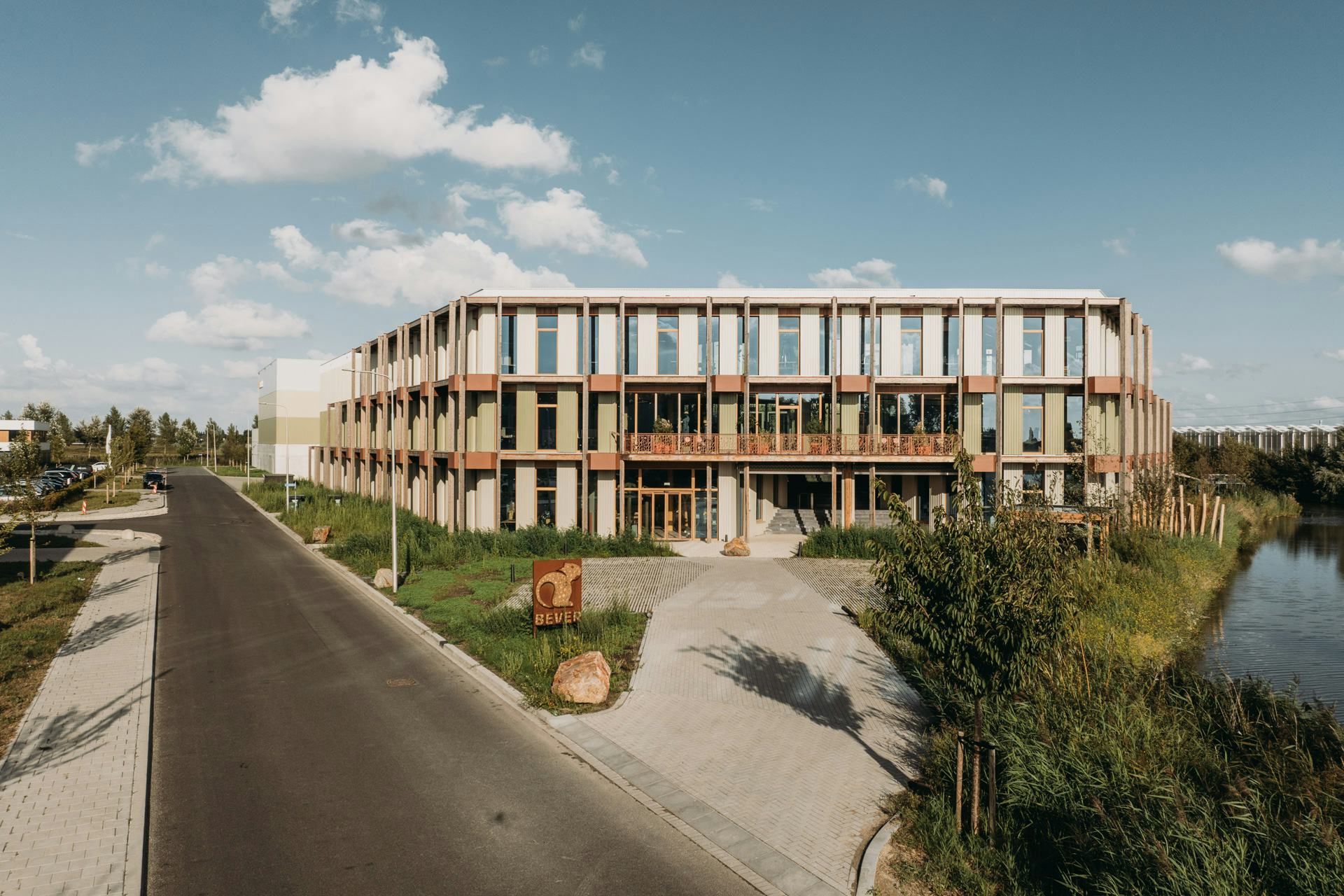 Naast het kantoor staat het nieuwe distributiecentrum, een strak vormgegeven volume met een gevel die door kleurverloop opgaat in het polderlandschap. Binnen is het uitgerust met moderne logistieke voorzieningen en comfortabele werkruimtes. Beide gebouwen delen faciliteiten zoals een werkcafé, waar medewerkers samen kunnen lunchen. Met deze nieuwe locatie brengt Bever al zijn activiteiten samen op één plek die past bij het motto van het bedrijf: goed zorgen voor mens, natuur en product.