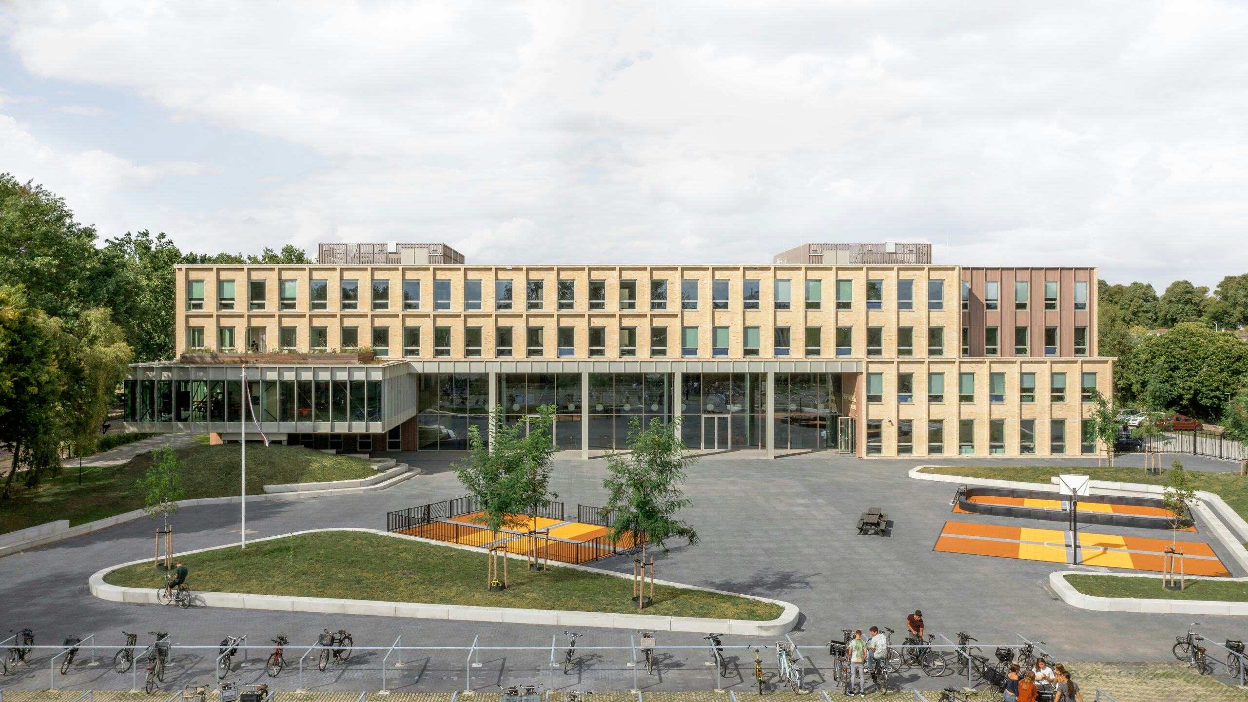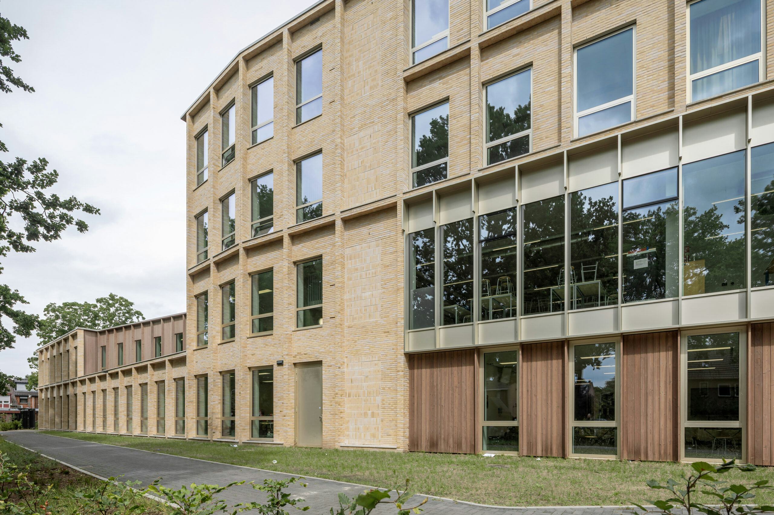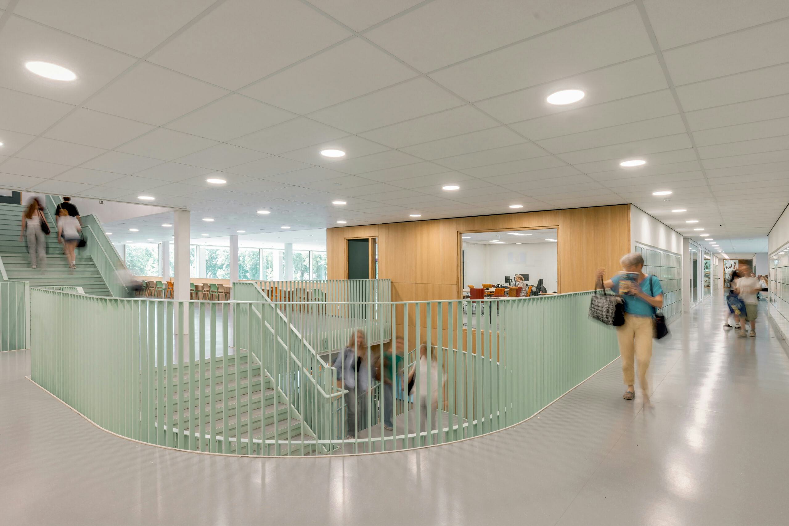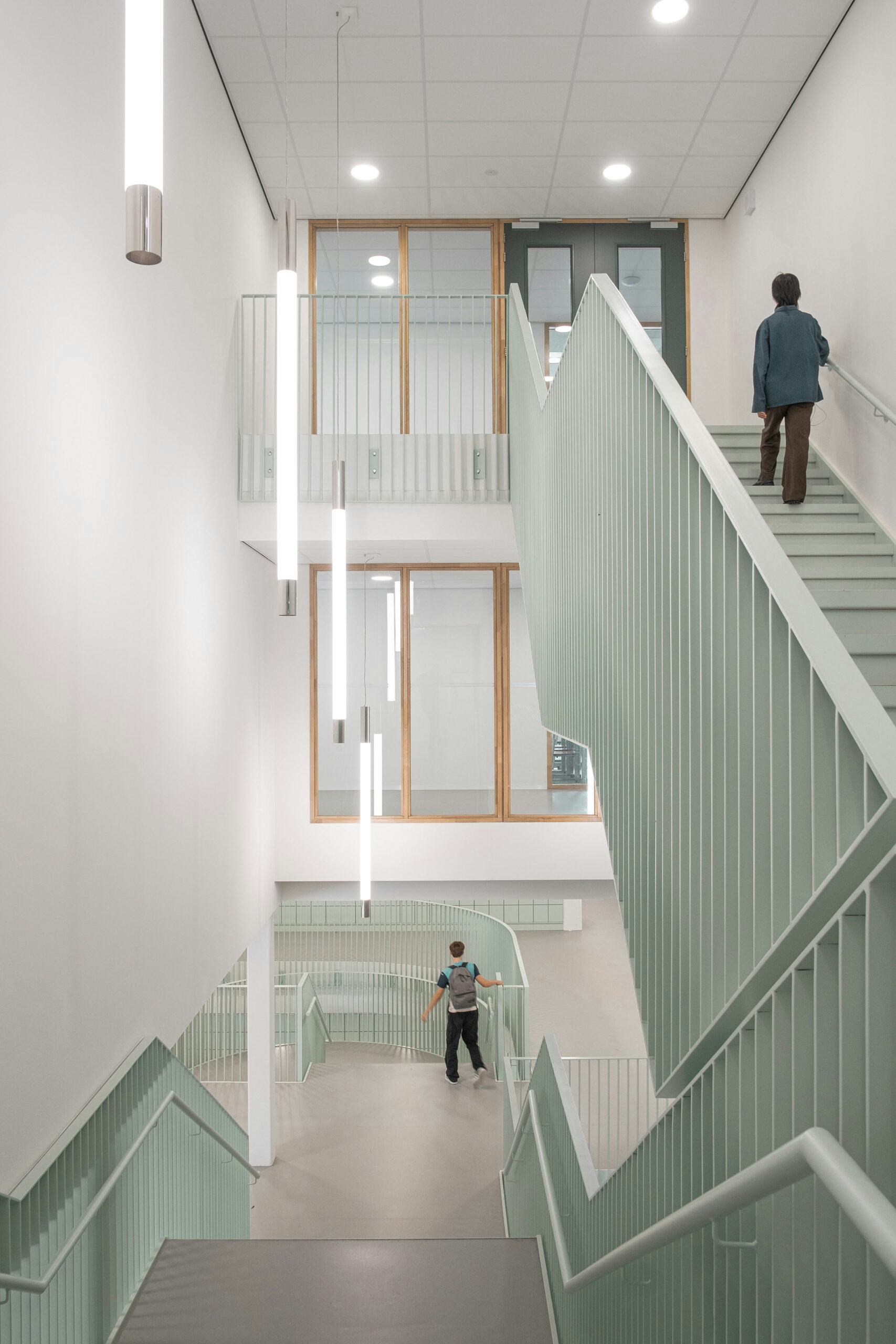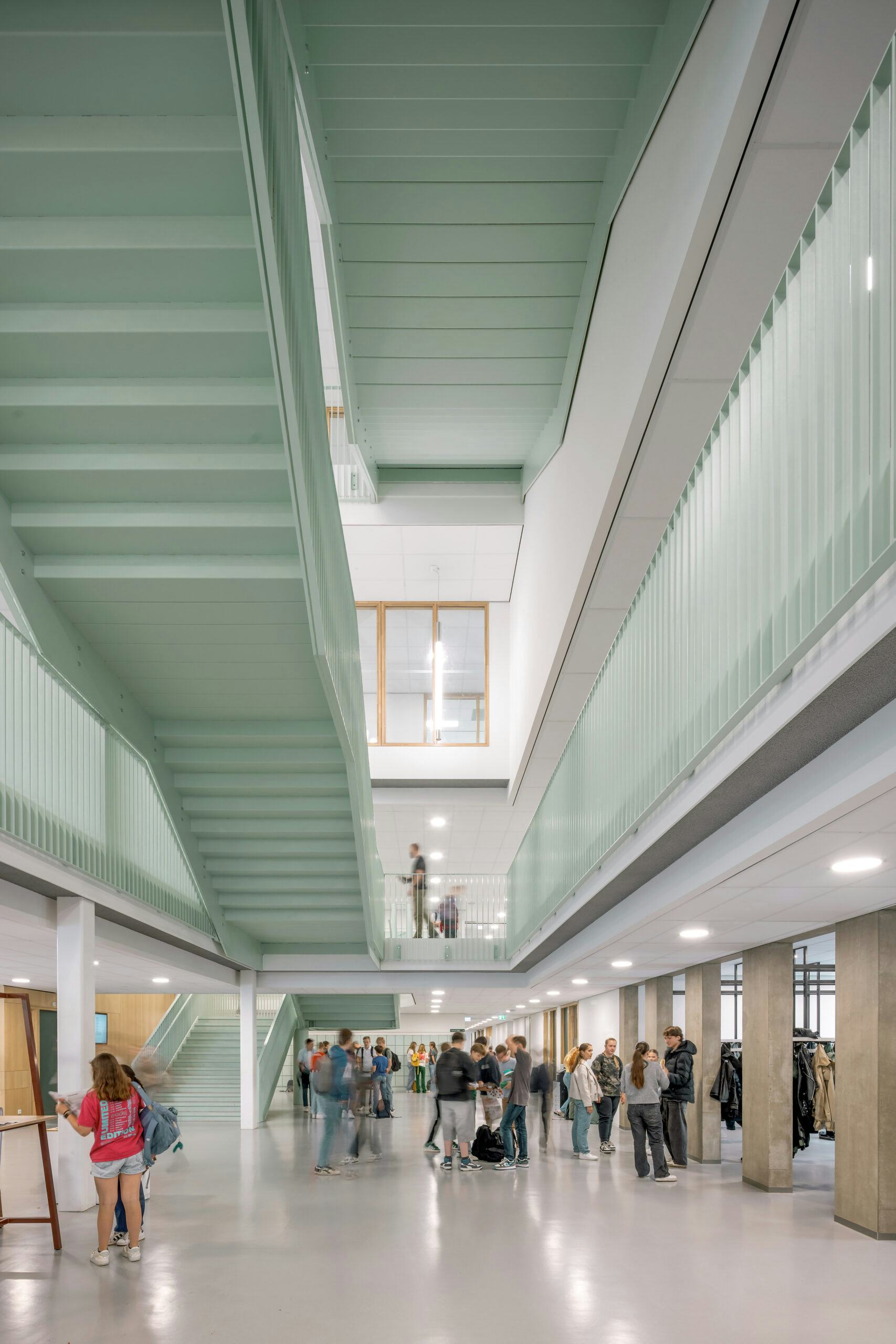 Opvallend is het transparante Technasium, dat boven het maaiveld uitsteekt op een van de kenmerkende heuvels van het terrein. De entreehal biedt toegang tot de aula en verbindt de verschillende verdiepingen. Rondom de aula liggen werkplekken en verkeersroutes, wat zorgt voor dynamiek in het gebouw. De multifunctionele houten wand in de aula bevat onder andere een toneel, keukenuitgifte en werkruimtes, en maakt flexibel gebruik van de ruimte mogelijk.