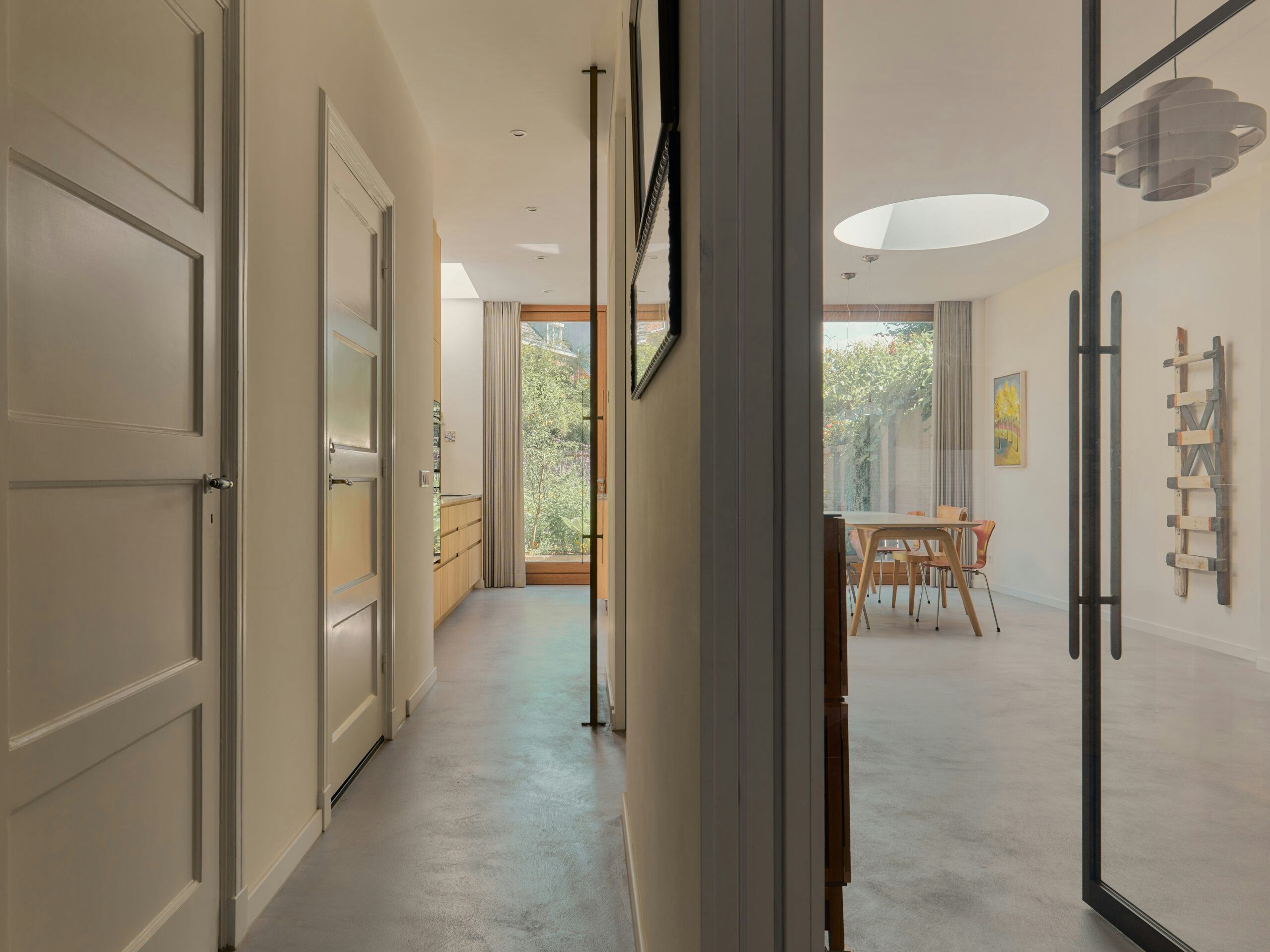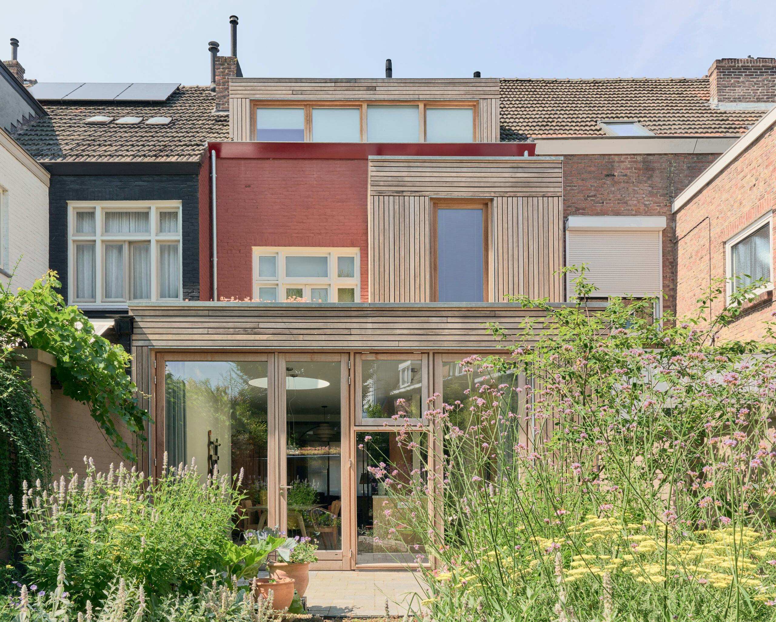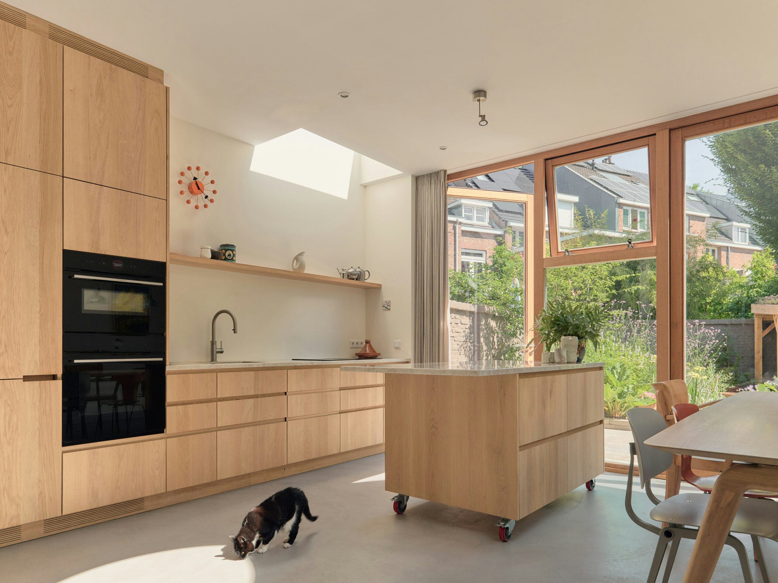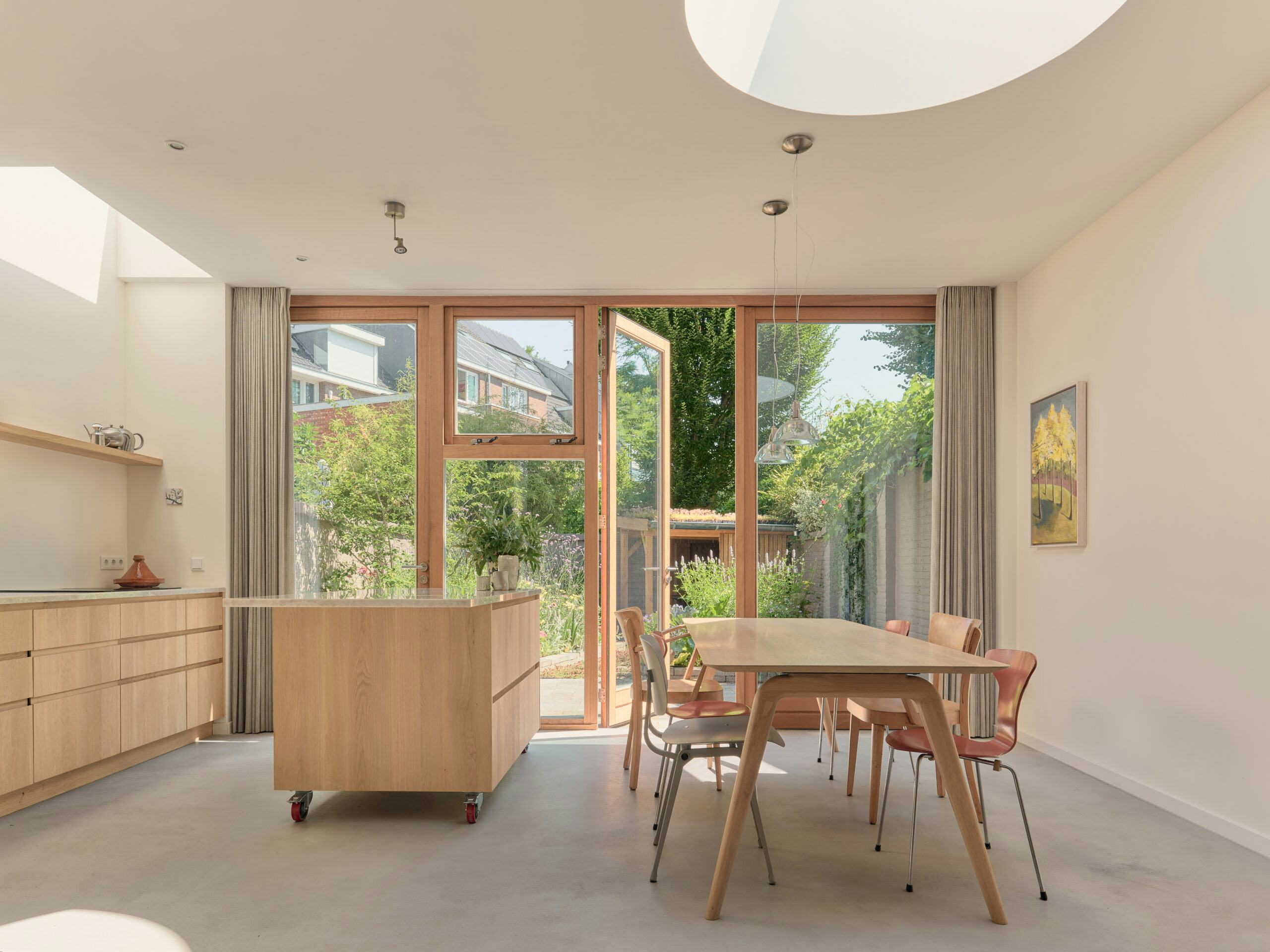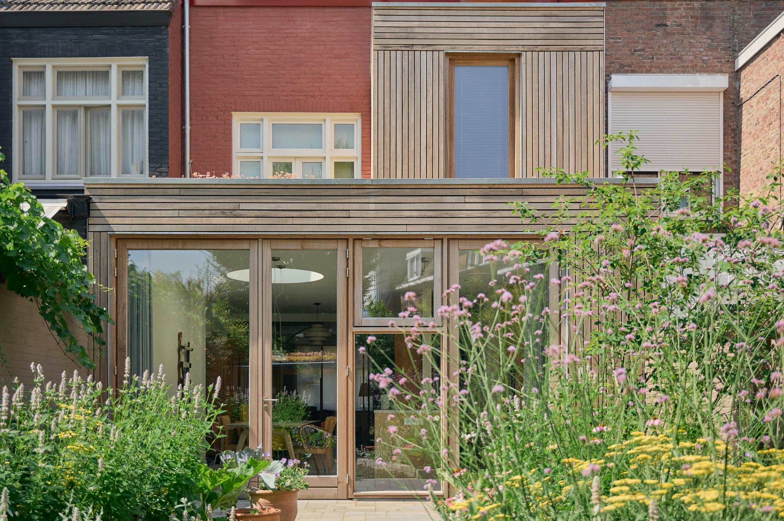 Binnen is de woning volledig heringericht. De voormalige bijkeuken werd bij de nieuwe leefkeuken getrokken, met een flexibel keukenblok en zicht op de tuin. Een lange schuifdeurwand verbindt de ruimtes op de begane grond. De uitbreiding aan de achterzijde is meteen ook het terras voor de slaap- en badkamer erboven. Daarnaast werd op de begane grond een extra wc met douche geplaatst, om de woning levensloopbestendig te maken.