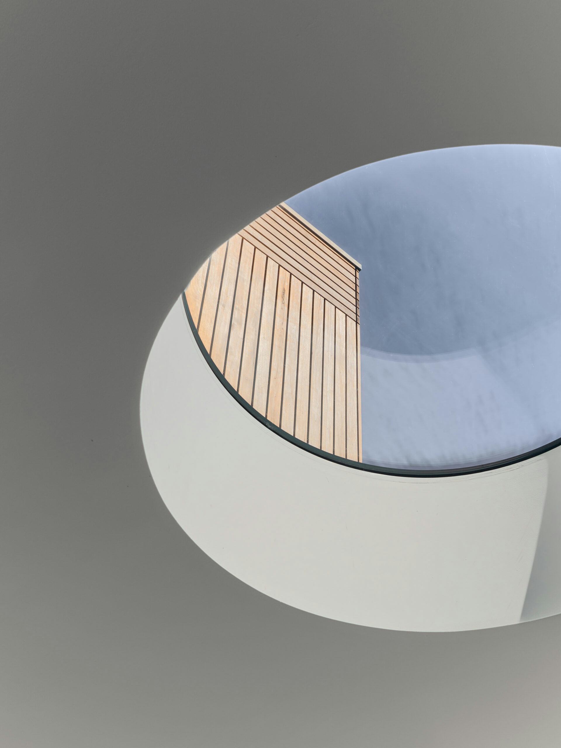 Licht speelt een belangrijke rol in het ontwerp. Grote glazen puien en twee daklichten – een cirkel en een rechthoek – zorgen voor daglicht en een dynamisch lichtpatroon in de woning.