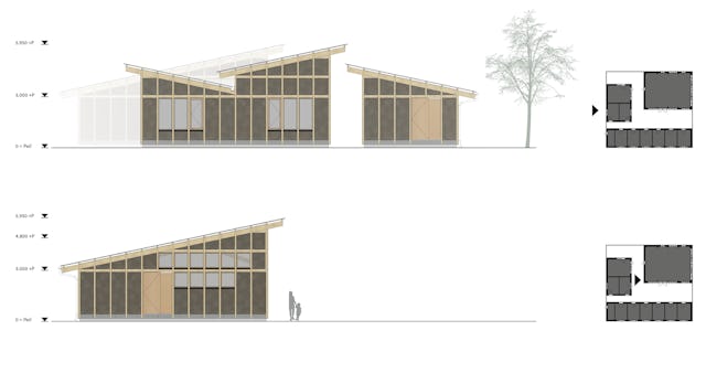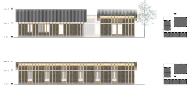 De drie afzonderlijke gebouwen, met in totaal tien gastenkamers en een eetzaal, zijn geplaatst op de bestaande fundering en volgen de contouren van de oude stal. Door de verdeling in drie volumes ontstond een open erfstructuur met uitzicht over het omliggende landschap en een gezamenlijk binnenplein.