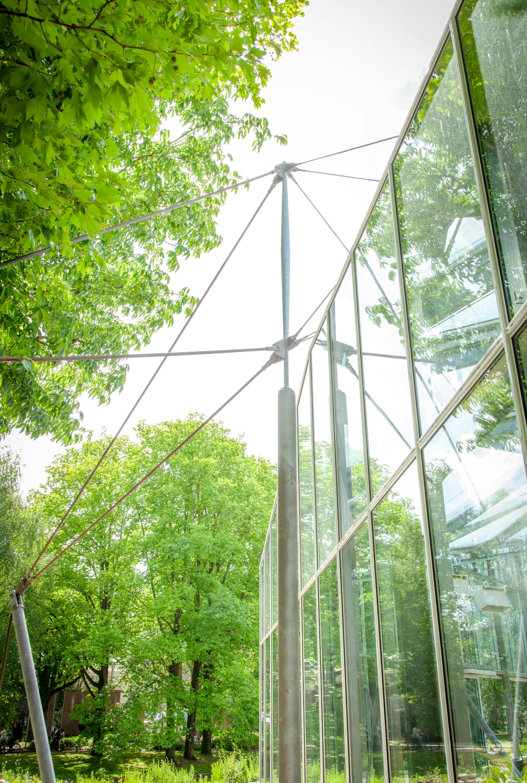 De nieuwe gevels zijn opgebouwd uit vierzijdig ingeklemde ruiten van 6 mm gehard floatglas met een Low-E coating, gecombineerd met een spouw gevuld met argongas. Aan de binnenzijde zit 44.2 gelaagd veiligheidsglas met een UV-doorlatende folie – essentieel voor de planten binnen. Het resultaat: 81% lichtdoorlaat, 59% zontoetreding en een indrukwekkend lage U-waarde van 1,1. De grotere ruiten van maximaal 3,5 meter hoog zorgen bovendien voor minder profielen en dus meer transparantie: bezoekers en wetenschappers kunnen letterlijk dieper de kas in kijken.