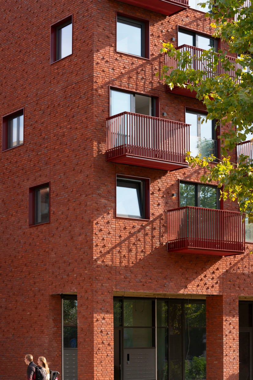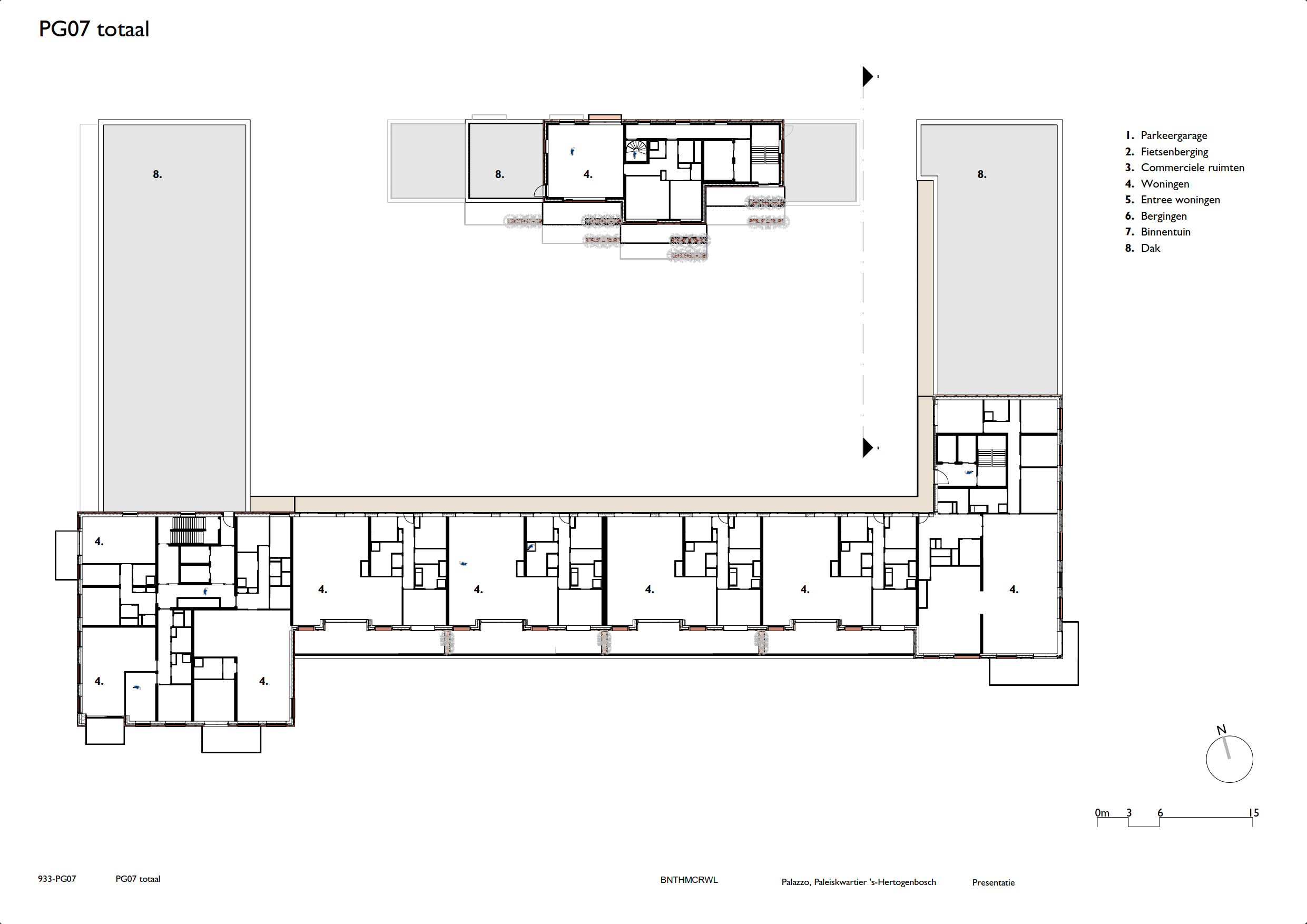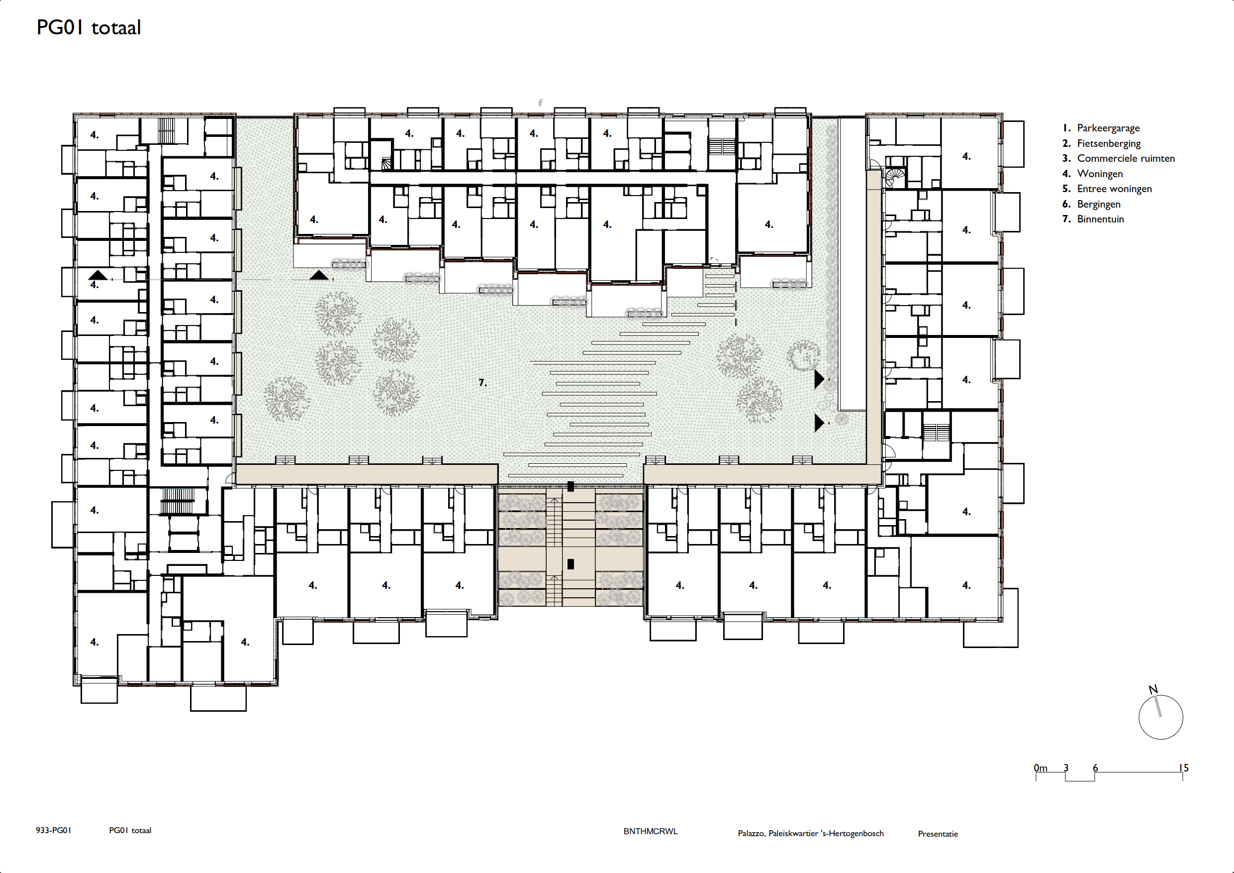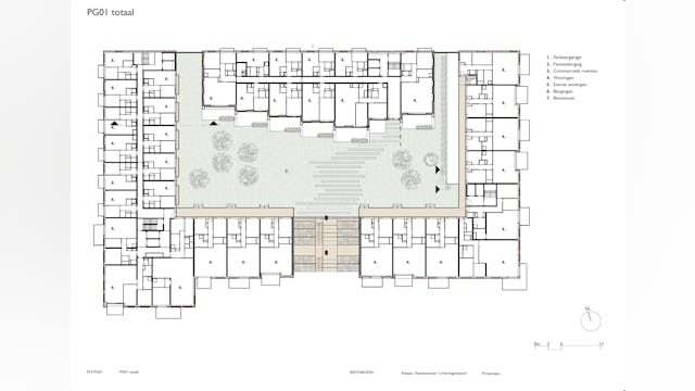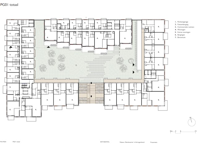 In het midden van het blok ligt een binnentuin die is ingericht als een open, groene ruimte. Door het noordblok los te maken van het carré valt er meer daglicht binnen en ontstaat een lichte binnentuin die toegankelijk is voor bewoners. Het groen loopt via terrassen en geïntegreerde plantenbakken door naar de hogere verdiepingen, waardoor een visuele verbinding ontstaat tussen binnen en buiten. De tuin fungeert als gezamenlijke buitenruimte waar bewoners kunnen verblijven of wandelen.