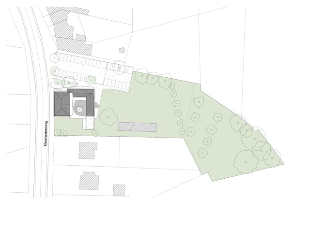 Het inrichtingsplan besteedt aandacht aan een veilige toegang. Auto’s draaien snel van de hoofdweg en worden gescheiden van fietsers en voetgangers, die via de oostgevel onder bomen de school bereiken. Ook vanaf de straat blijft het zicht op het groene achtergebied open. Achteraan wordt extra terrein aangekocht zodat leerlingen uit Ronse te voet of met de fiets kunnen komen. Administratie en onthaal krijgen een centrale plek tussen de parkeerplaats en de school. Slechts een klein deel van de parkeerplaats wordt verhard en dient tijdens schooluren ook als speelruimte. Bestaande bomen blijven behouden.