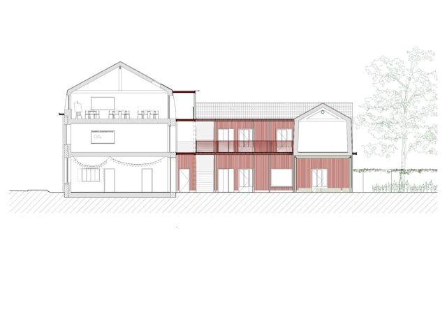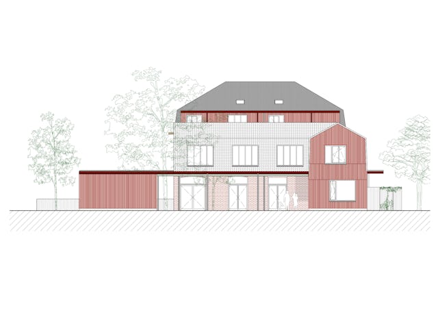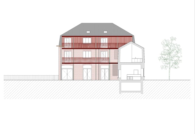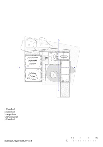 De oude buitengevels zijn gerenoveerd, waarbij de identiteit van het bakstenen straatvolume behouden blijft. De voordeur verdwijnt wegens de nabijheid van de weg. Op de begane grond komt een multifnctionele ruimte die de school een duidelijk gezicht geeft en buiten schooluren extern gebruikt kan worden.