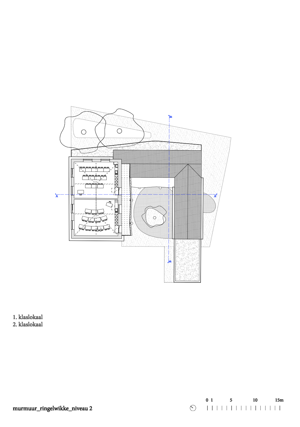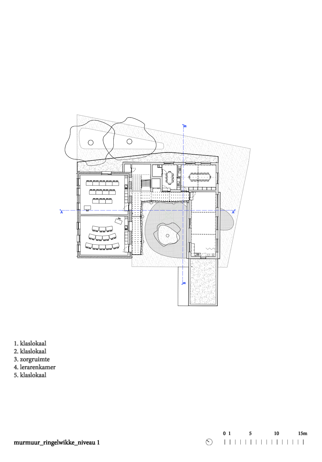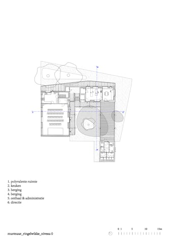 De ontsluiting is buiten het oude pand geplaatst met nieuwe trappen en galerijen rond de binnenplaats, het hart van het project. De open galerijen sluiten aan bij de onderwijsvisie waarbij buitenactiviteiten centraal staan. Het binnenkomen blijft zichtbaar en elke klas krijgt een plek op de drempel tussen binnen en buiten.