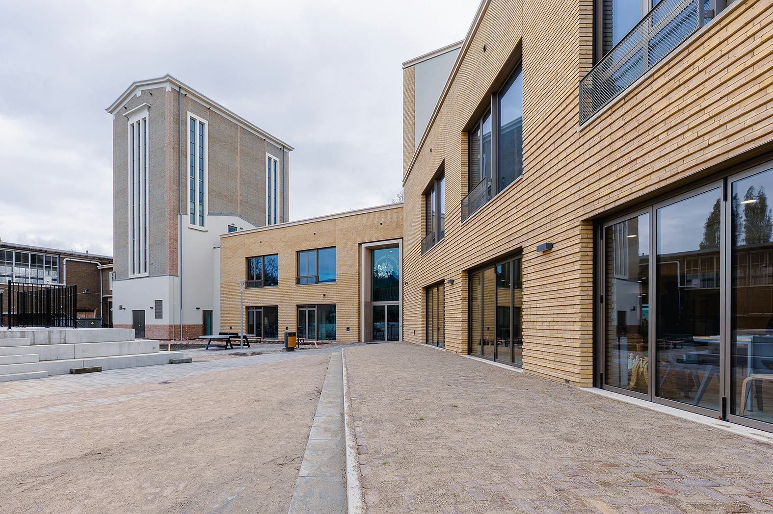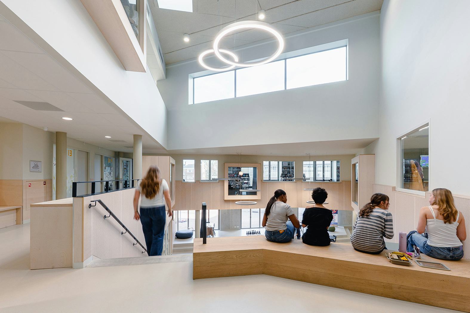 Centraal in het driehoekige volume ligt een open ruimte over drie lagen: de Central Square met tribunetrap en de aangrenzende Makerspace. Deze zones verbinden de verschillende afdelingen en vormen het kloppend hart van de school. In de Makerspace – in directe relatie met Arts & Design – werken leerlingen aan techgedreven projecten, passend bij de nabijheid van de TU Delft. De compacte gebouwvorm maakt een ruim plein tussen nieuwbouw en toren mogelijk, waardoor de school een open, campusachtige uitstraling krijgt.